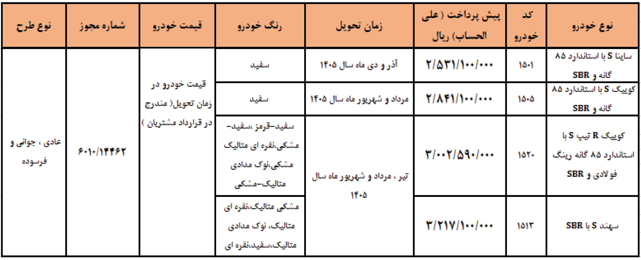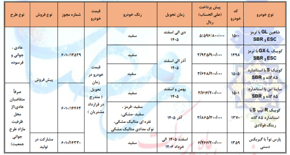 | موعد تحویل | آذر الی اسفند 1404 | اردیبهشت و خرداد 1405 |