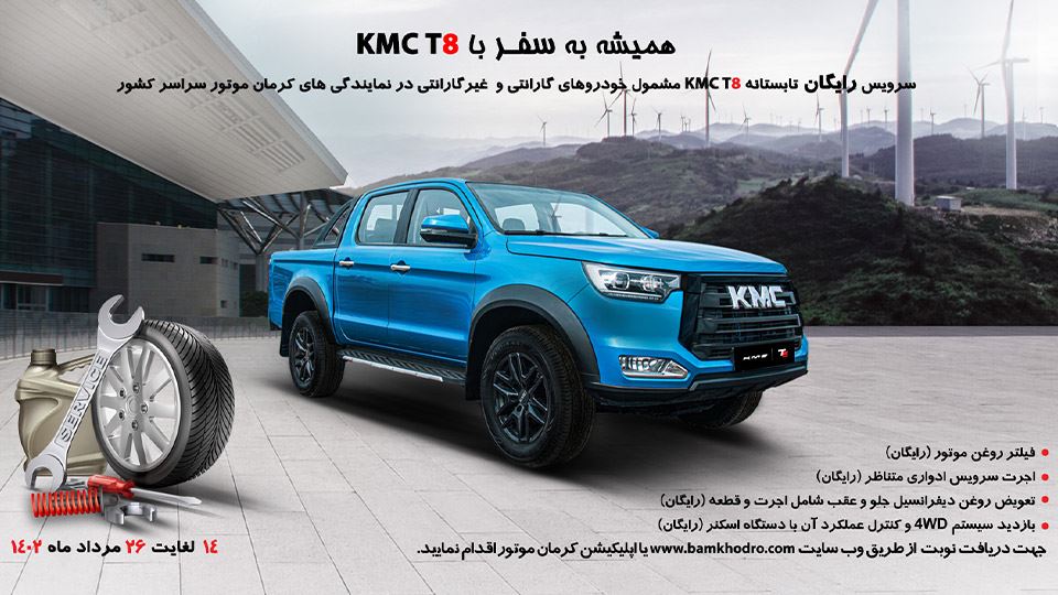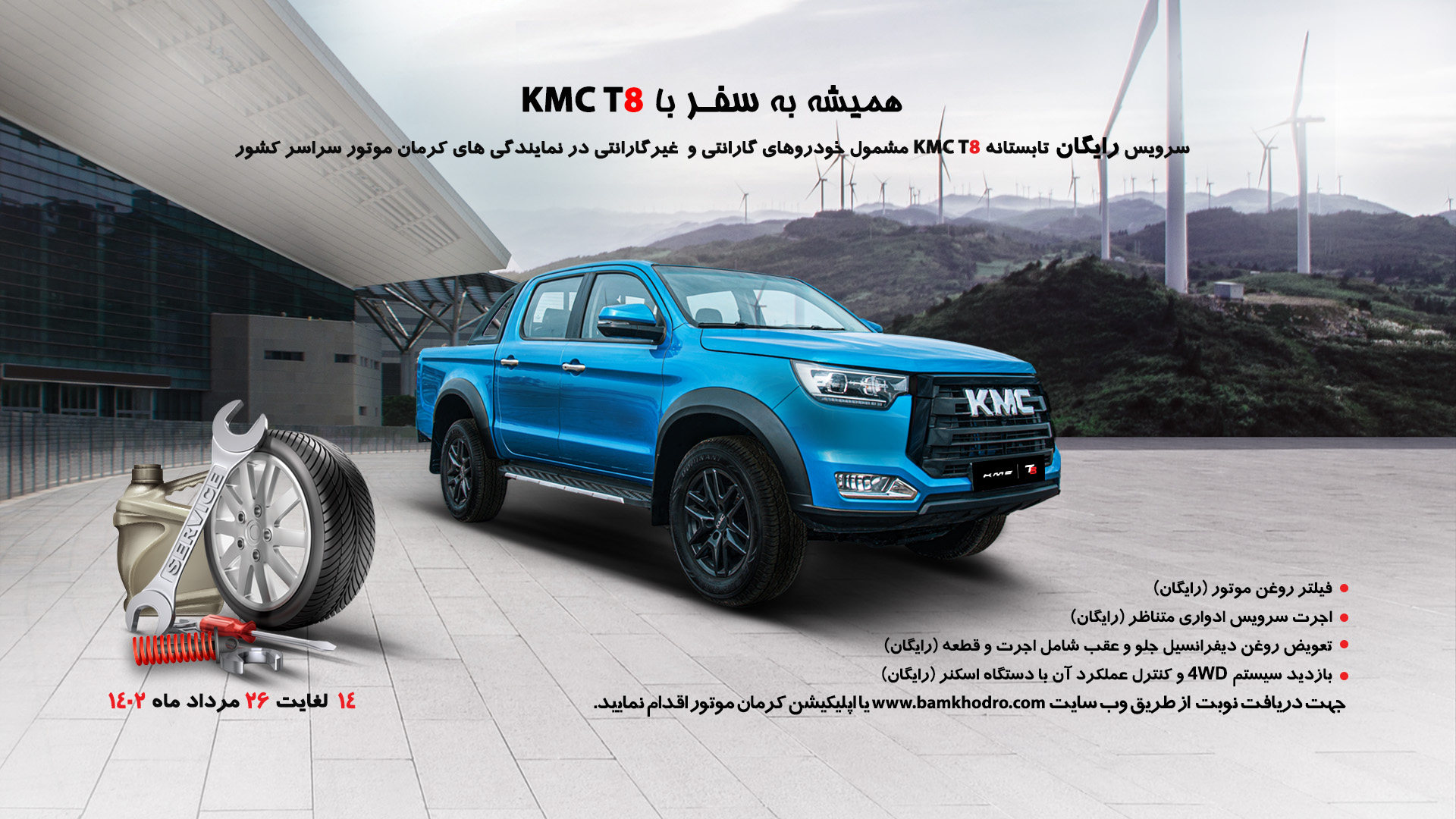 این کمپین ویژه تمام خودروهای کی ام سی T8 ، اعم از خودروهایی که مشمول گارانتی و غیر گارانتی هستند، میشود. از جمله فعالیت های اجرایی طرح مذکور برای خودرو KMC T8 می توان به قطعات رایگان روغن موتور، فیلتر روغن و فیلتر هوا به همراه اجرت رایگان سرویس دوره ایی اشاره کرد.