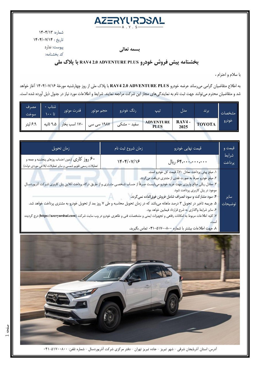 شرایط فروش آذریوردسال برای متقاضیان ثبت نام تویوتا RAV4 وارداتی این شرکت، از روز چهارشنبه مورخ 1404/07/16 و فقط از طریق نمایندگیهای مجاز، آغاز میشود:
