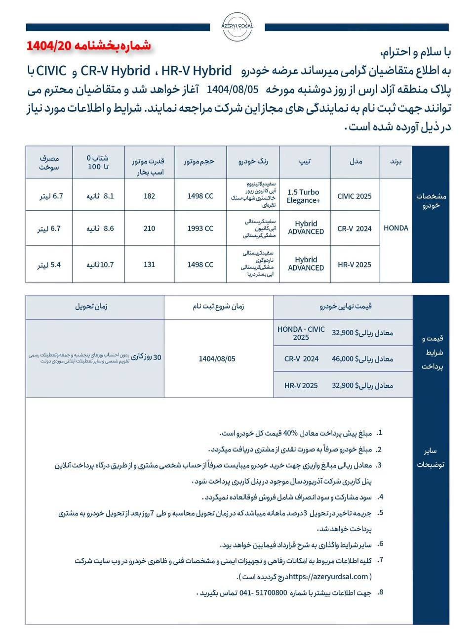 فراخوان شرکت آذریورد از خریداران هوندا: دی 1403