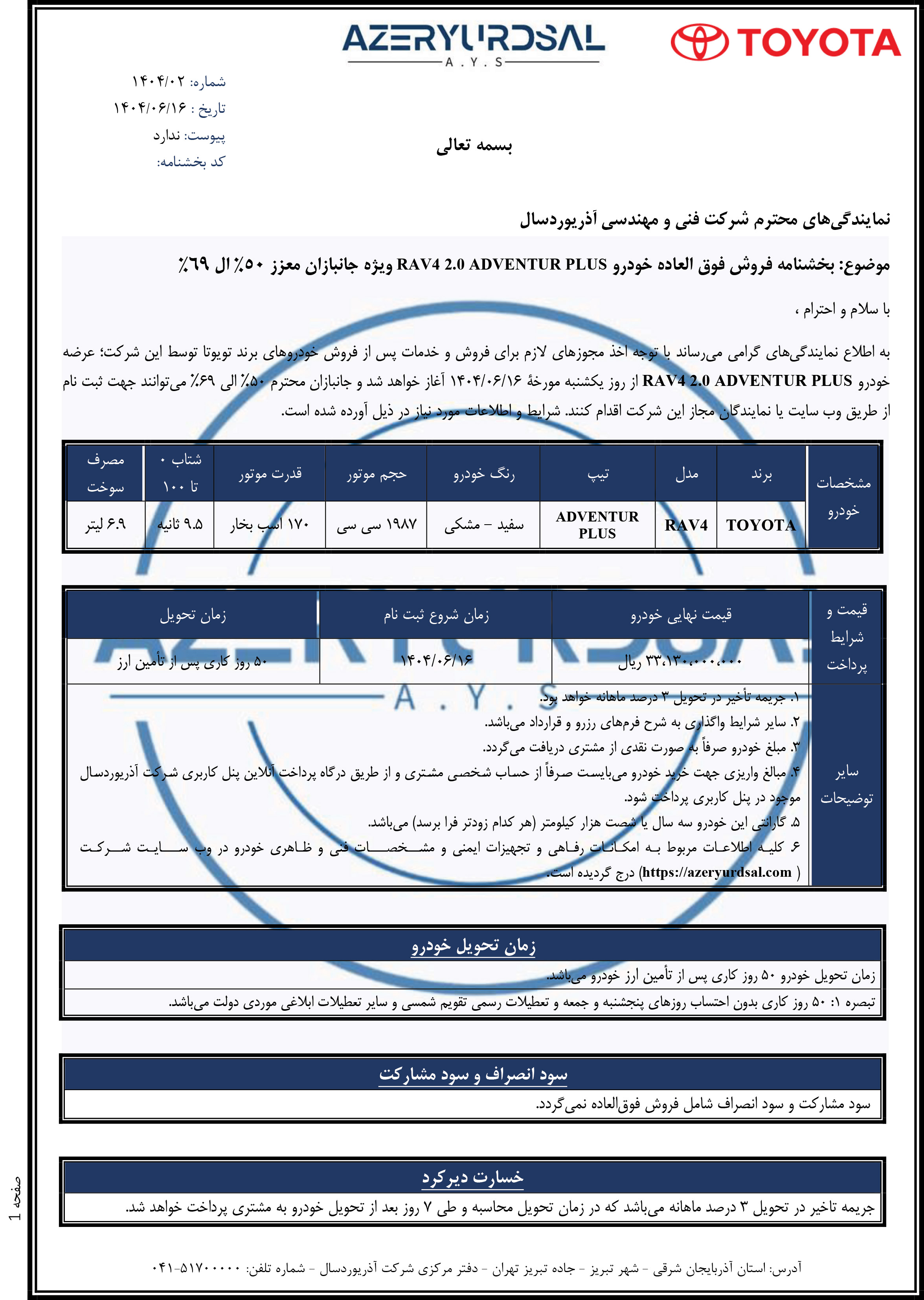 براساس بخشنامه فروش شرکت آذریورد، قیمت نهایی خودرو در زمان صدور دعوتنامه، به اطلاع خریداران میرسد. جزییات بیشتر را از لینک زیر دریافت کنید: