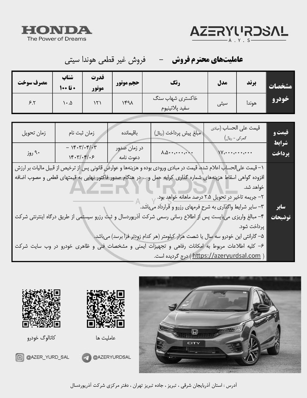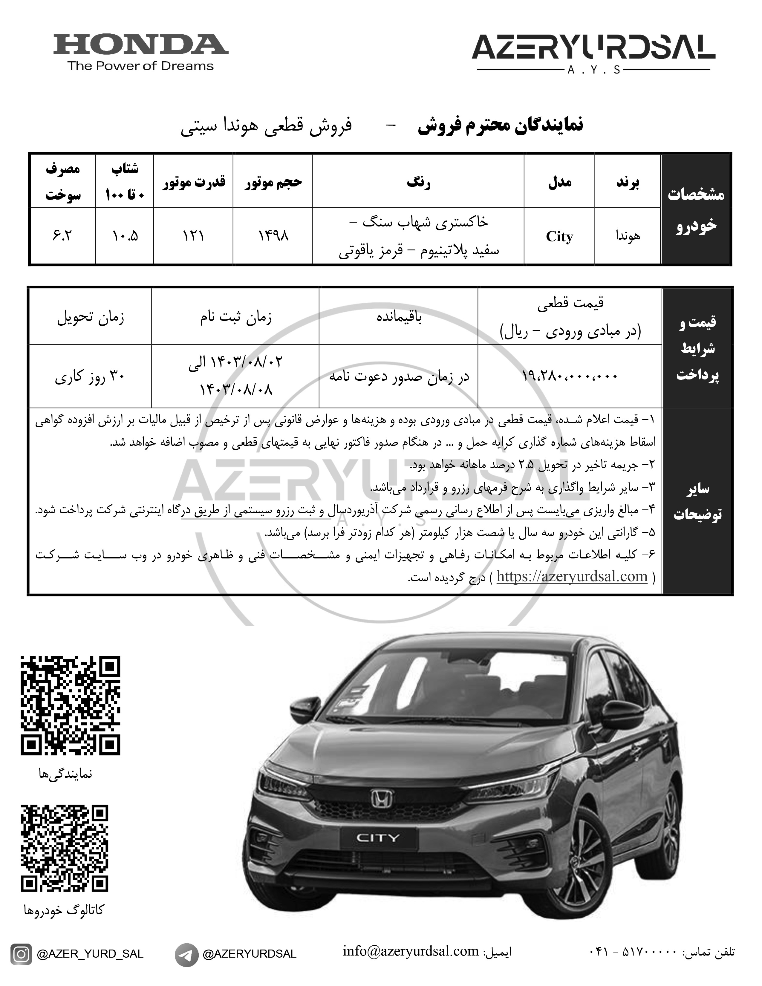 سومین فراخوان پیش فروش هوندا سیتی، از سوی شرکت آذریوردسال اعلام شد. ثبت نام هوندا، صرفا ویژه منتخبین سامانه یکپارچه وارداتی بوده و از تاریخ 1403/04/03 لغایت 1403/04/06 فعال است: