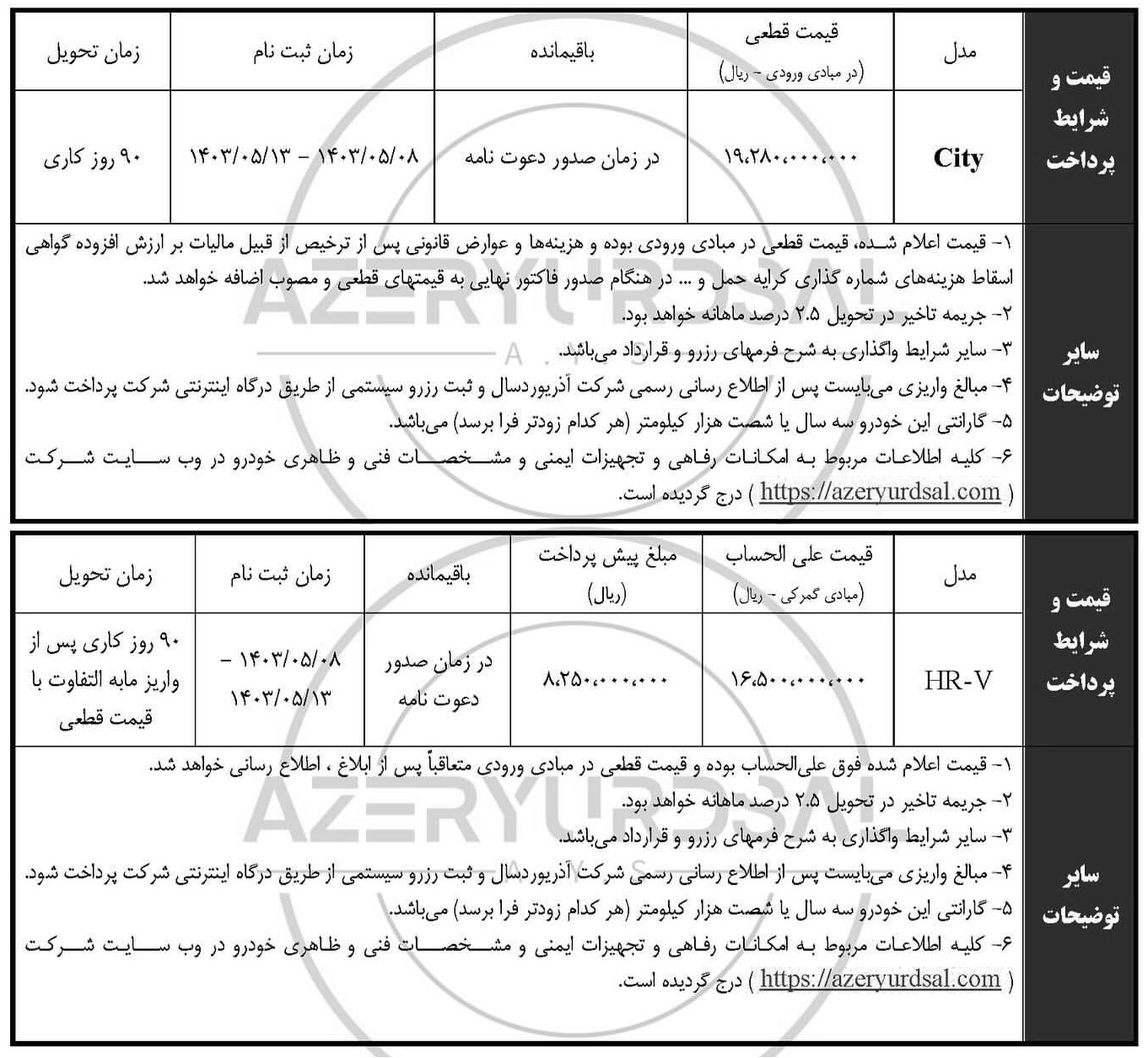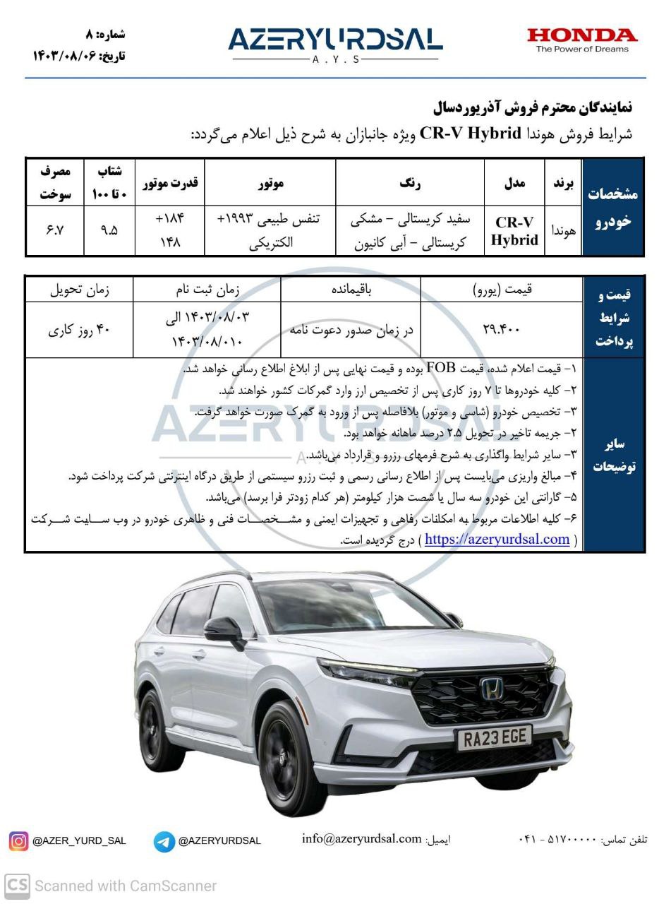 «با عنایت به ورود خودروهای ZR-V وارداتی CR-V هیبریدی به گمرکات کشور و در راستای تأمین حداکثری رنگ مورد علاقه آن جانباز گرامی، خواهشمند است به پنل کاربری خود در سایت azeryurdsal.com مراجعه و ترتیب اولویت رنگ مورد نظرتان را در اسرع وقت انتخاب نمائید. بدیهی است رنگ انتخابی قطعی نبوده و تخصیص رنگ با توجه به موجودی از نظر رنگ ترجیهی و توسط شرکت آذریوردسال خواهد بود».