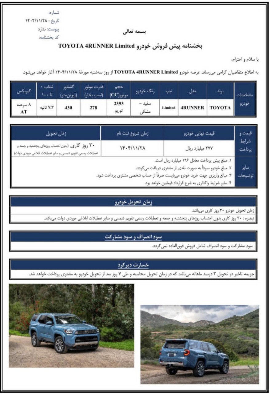 | تویوتا فوررانر لیمیتد | 27,700,000,000 | 30 روز کاری |