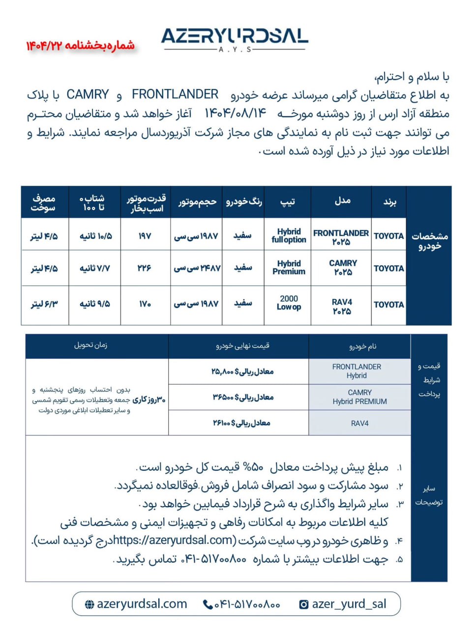 شرایط فروش آذریوردسال ویژه متقاضیان ثبت نام تویوتا وارداتی با پلاک منطقه آزاد ارس، از روز چهارشنبه مورخ 14 آبانماه 1404 آغاز شده و تا زمان تکمیل ظرفیت فروش نیز ادامه خواهد داشت: