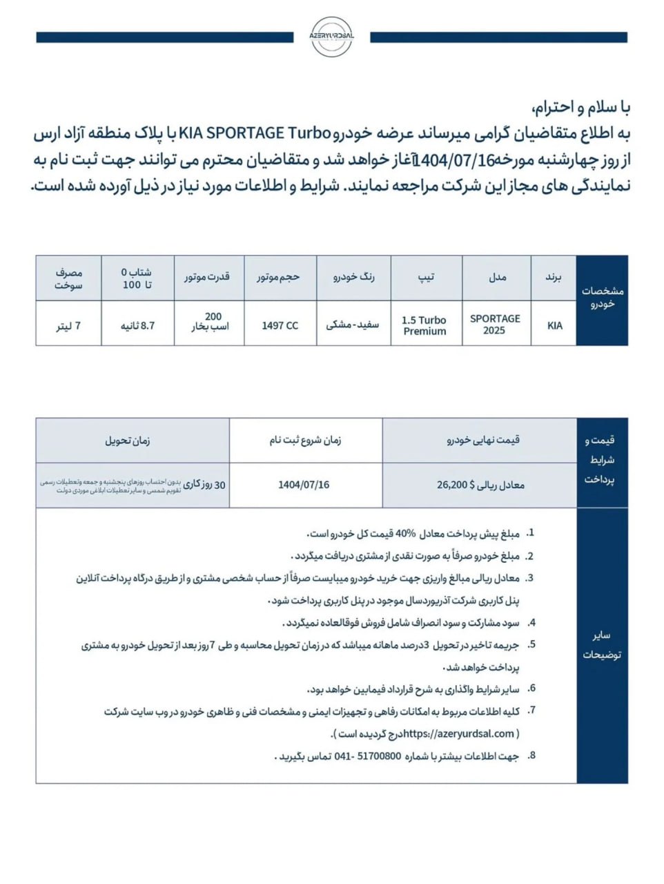 شرایط فروش آذریوردسال ویژه ساکنین منطقه آزاد ارس، که قصد خریداری کیا اسپورتیج توربو و همچنین کیا K3 وارداتی این شرکت با پلاک منطقه آزاد را دارند، از تاریخ 1404/08/11 مطابق جدول زیر اعلام شده است: