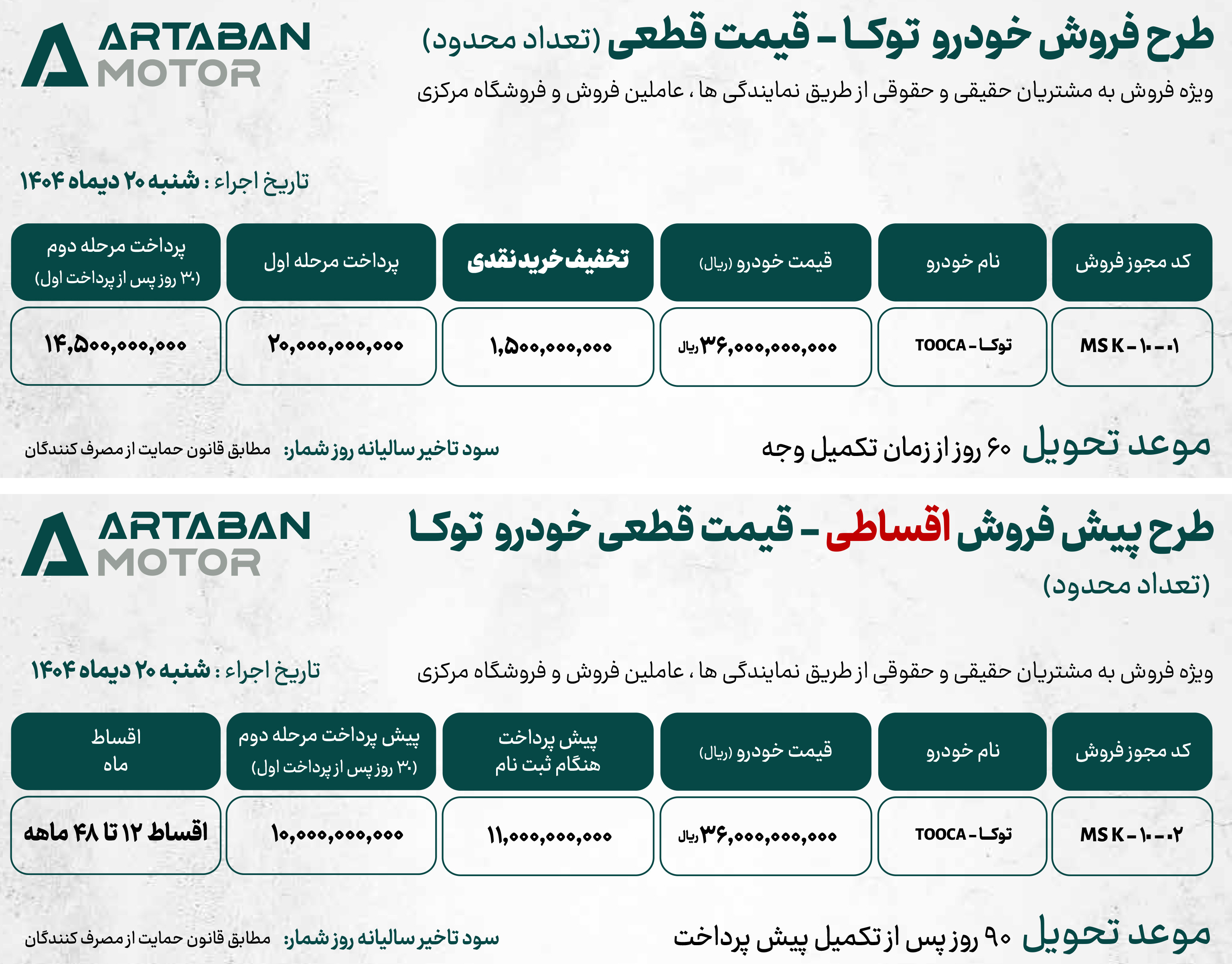 پیش فروش آرتابان موتور، ویژه متقاضیان ثبت نام ای ام جی توکا، از روز شنبه مورخ 1404/10/20 در نمایندگیهای مجاز این شرکت، آغاز شده و به مدت 10 روز نیز ادامه خواهد داشت: