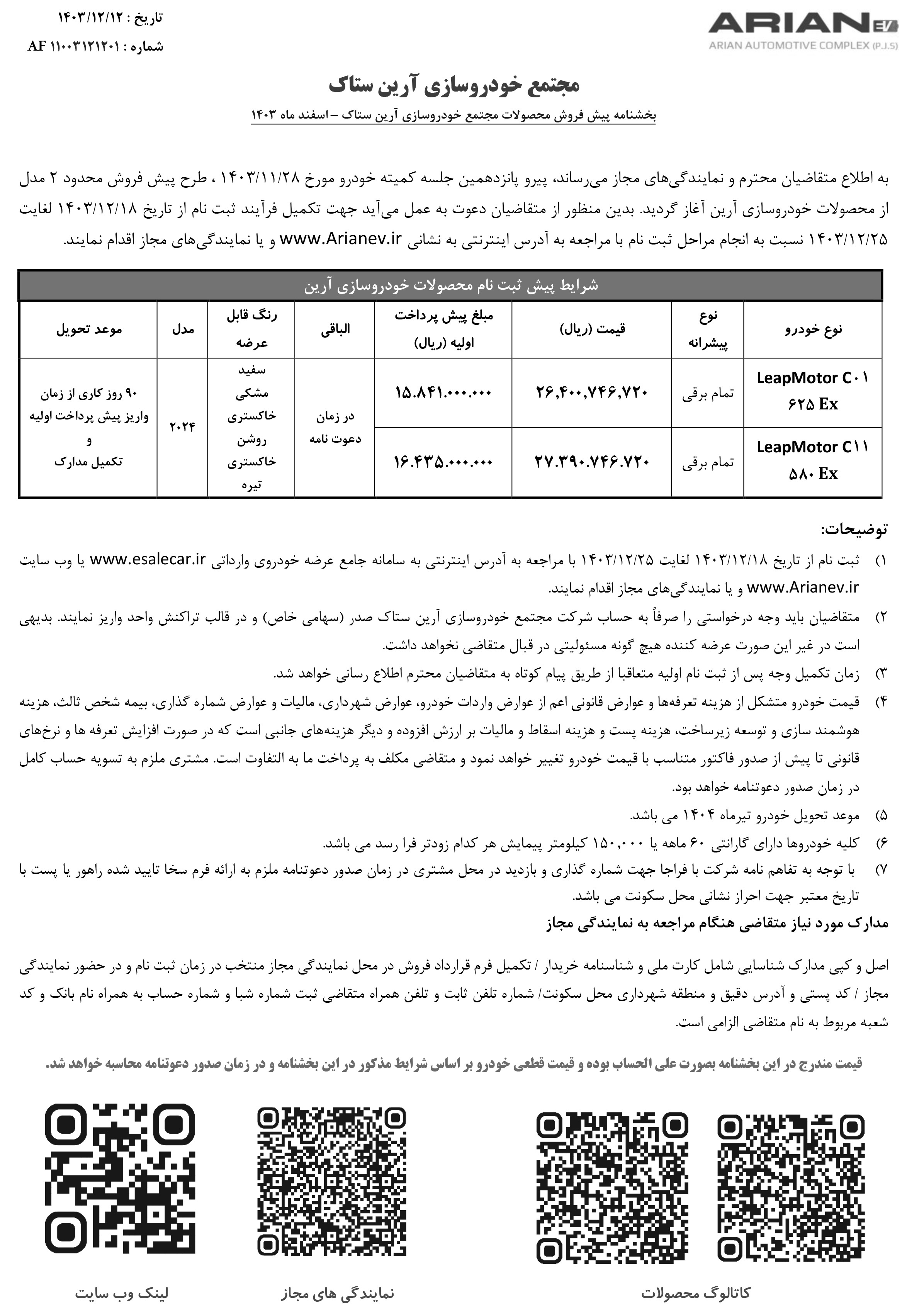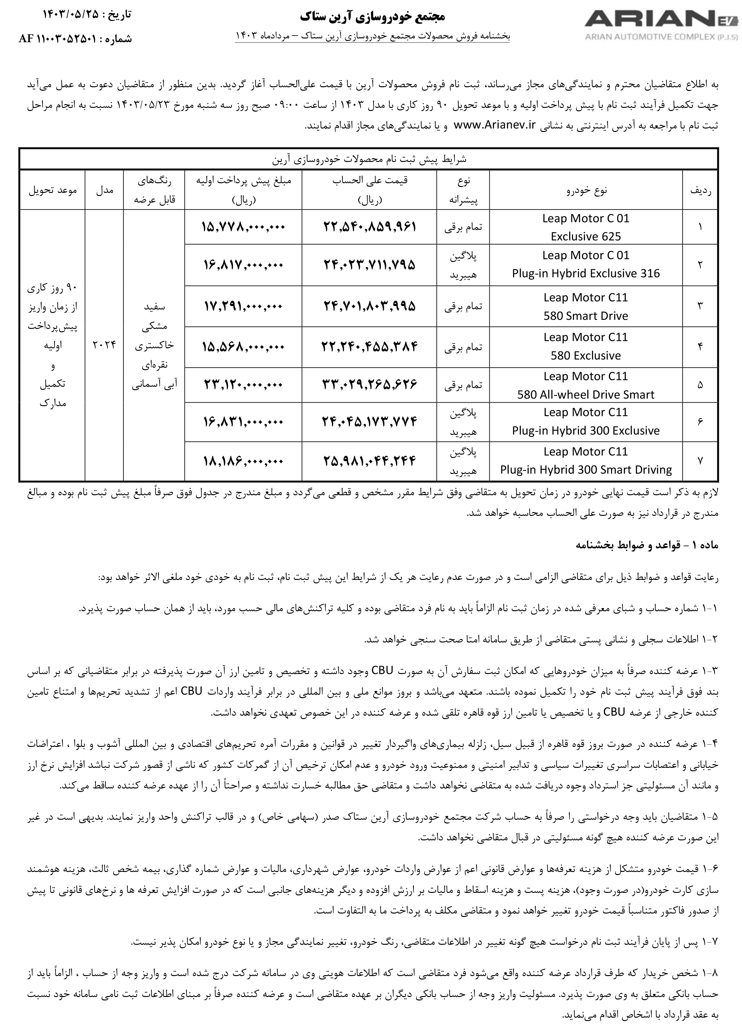 گفتنی است اولین پیش فروش لیپ موتور در ایران، توسط شرکت خودروسازی آرین ستاک انجام شده و از روز سهشنبه مورخ 1403/05/23 نیز ثبت نام از متقاضیان واجد شرایط آغاز شده است. جزییات بیشتر را از لینک زیر دریافت کنید:
