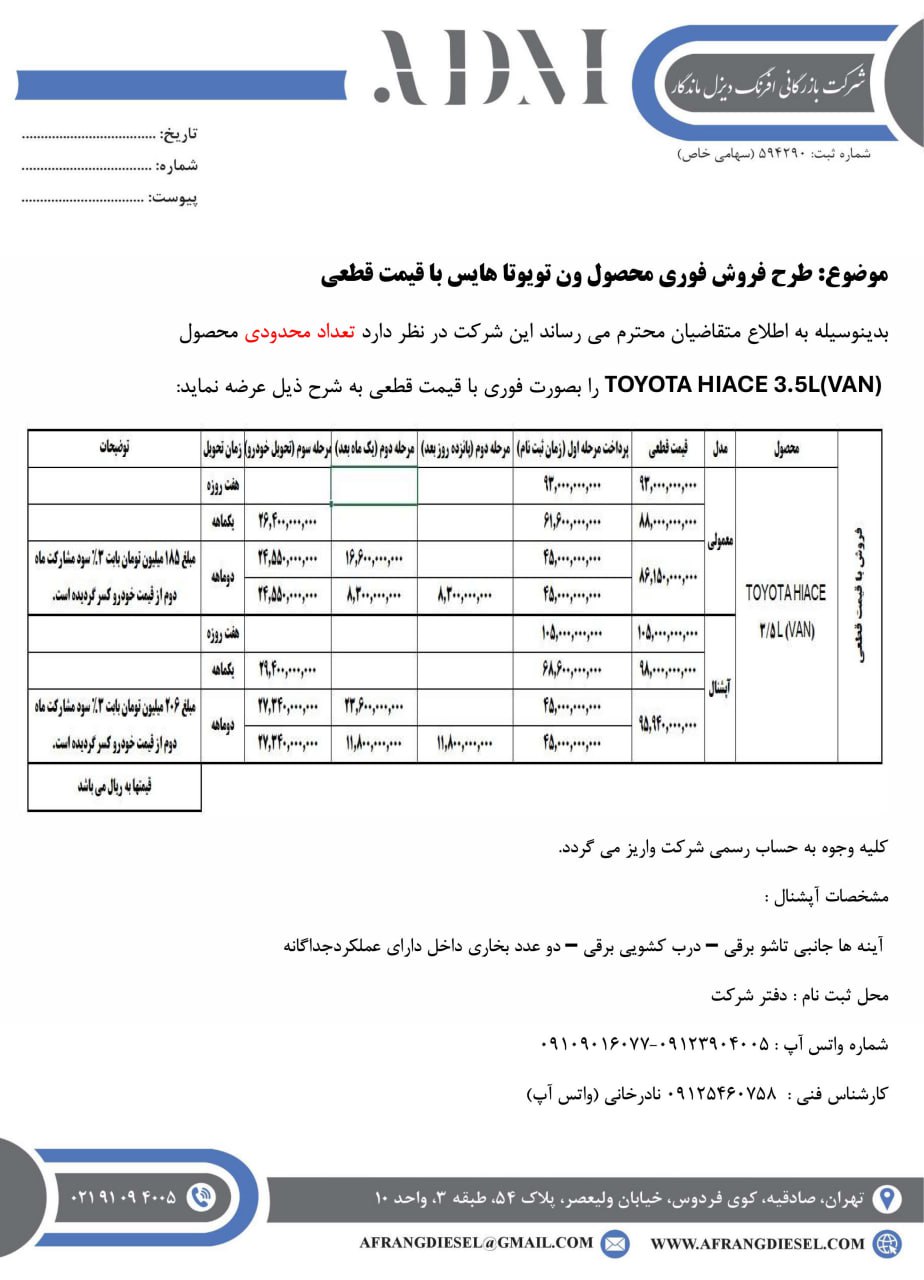 مرحله جدید فروش افرنگ دیزل ویژه متقاضیان ثبت نام تویوتا هایس وارداتی این شرکت، از روز یکشنبه مورخ 1404/08/11 صرفا از طریق نمایندگی‌ها مجاز، مطابق شرایط زیر آغاز شده و تا زمان تکمیل ظرفیت فروش نیز ادامه دارد: