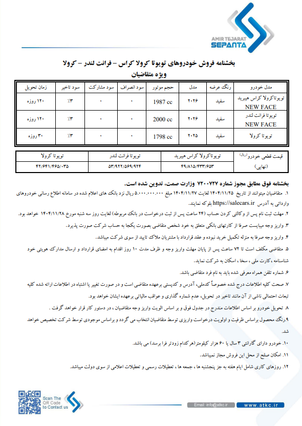 در لیست فروش 3 مدل کرولا کراس هیبرید نیو فیس 2026، فرانتلندر هیبرید نیو فیس 2026 و کرولا هیبرید الیت 2025 به چشم می‌خورد.