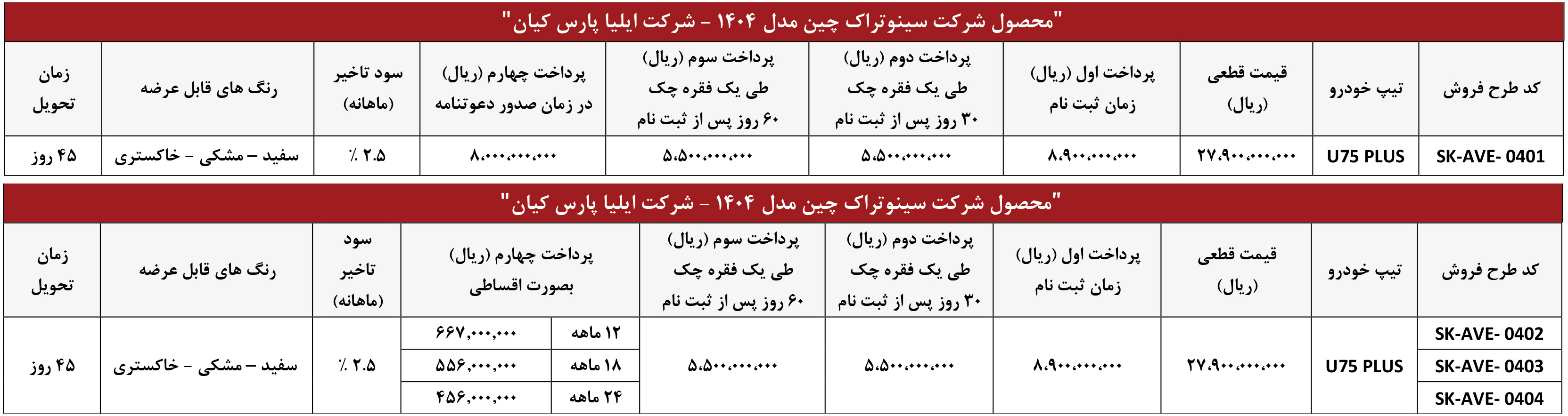 شرایط فروش ایلیا پارس کیان، ویژه متقاضیان ثبت نام اونترا U75 پلاس، از روز شنبه مورخ 1404/07/12 مطابق جدول زیر اعلام شده است: