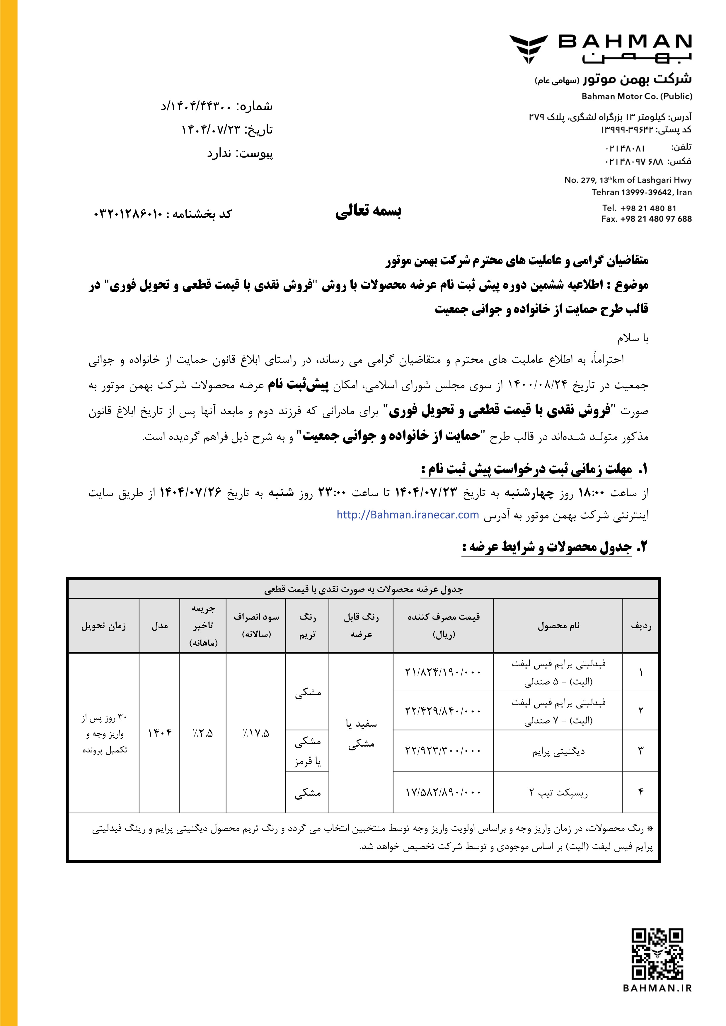 شرایط فروش بهمن موتور در قالب طرح نقدی، اعتباری و پیش فروش، از روز شنبه مورخ 1404/07/05 راس ساعت 10 صبح آغاز شده و تا پایان روز پنجشنبه مورخ 1404/07/10 یا تا زمان تکمیل ظرفیت فروش، ادامه خواهد داشت: