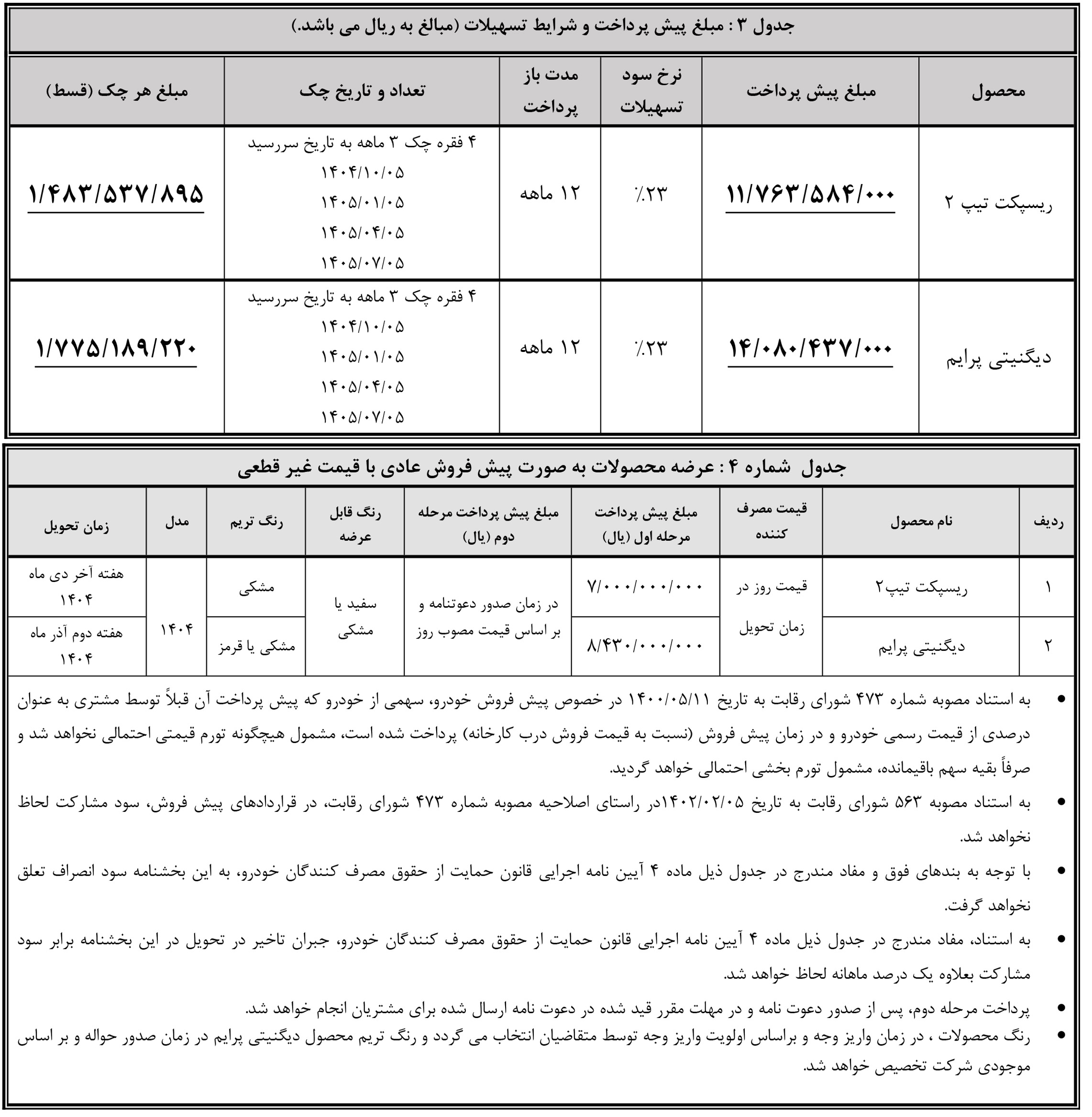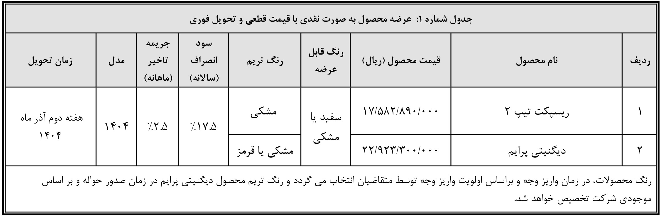 | ریسپکت پرایم | 973,760,000 | ثابت | - |
