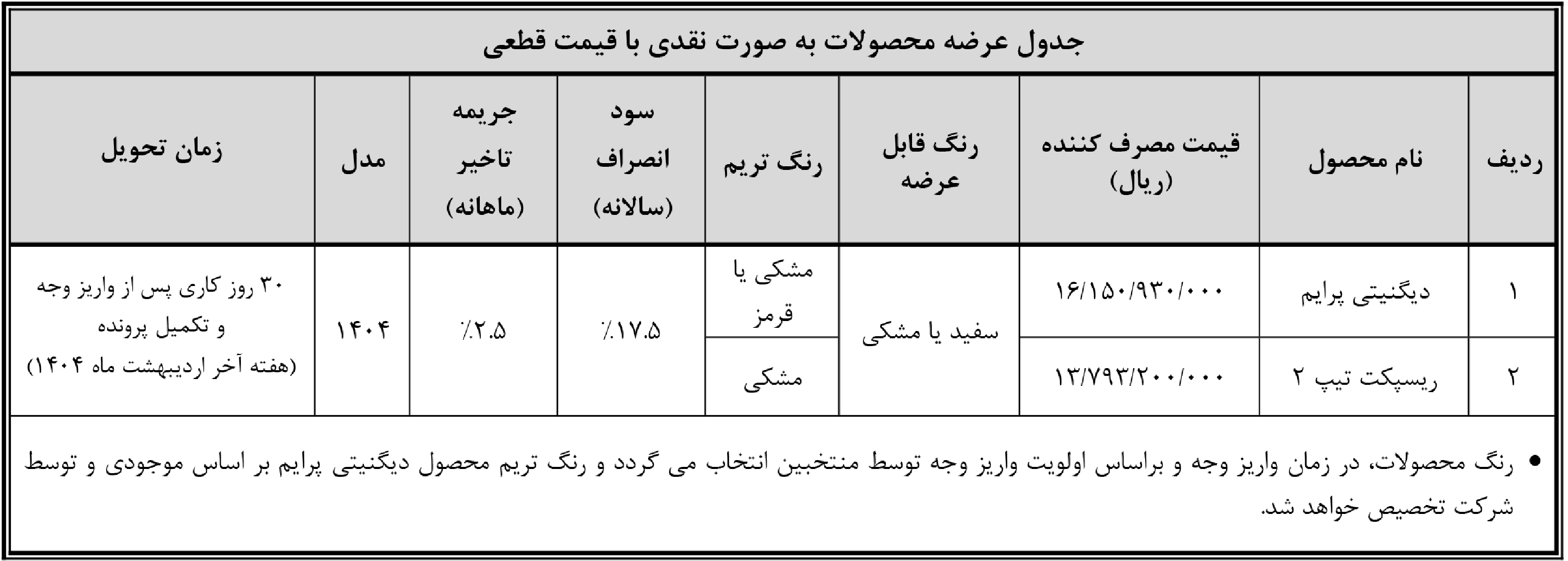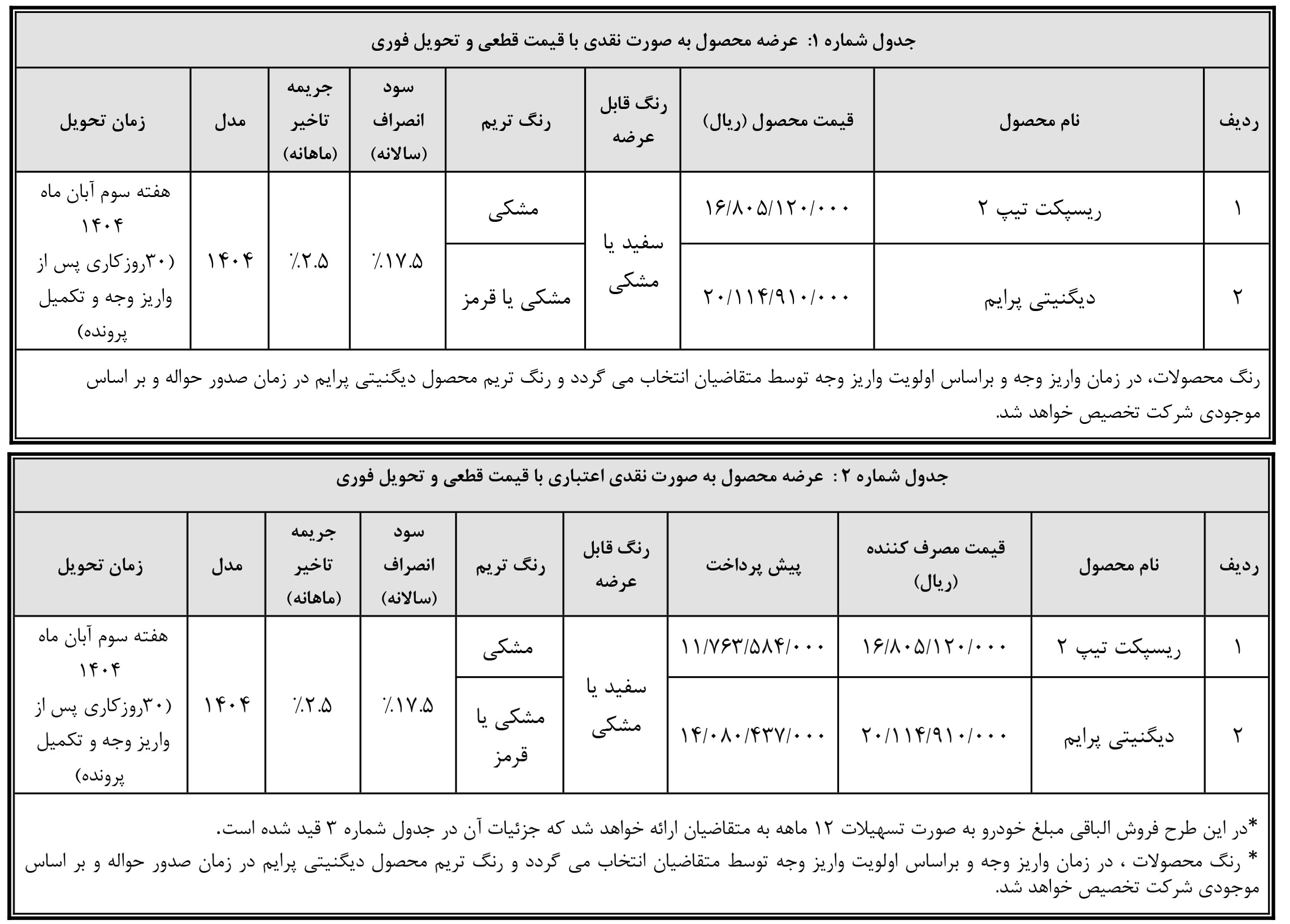 | ریسپکت پرایم تیپ 2 | - | - | 1,084,000,000 |