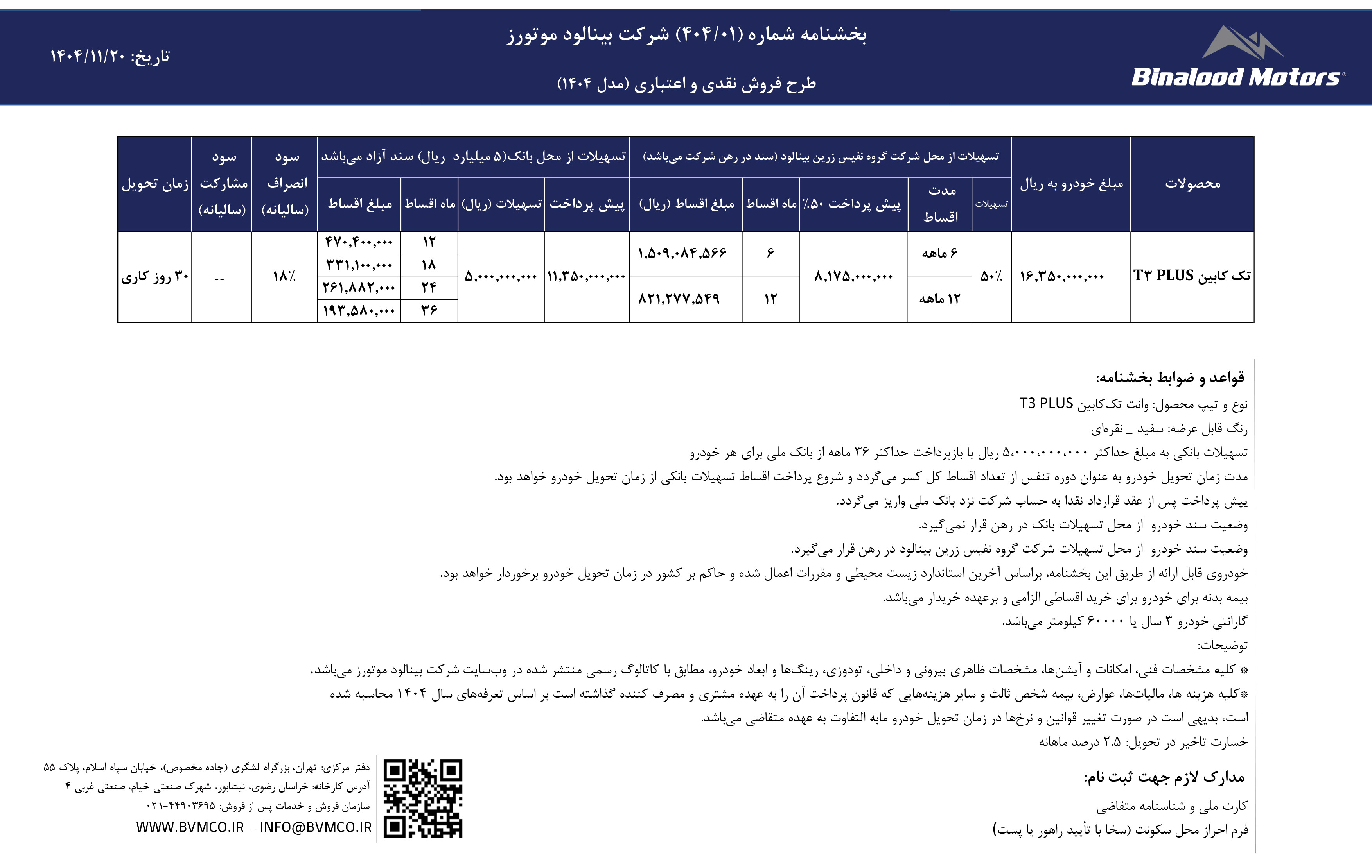 در این مرحله از ثبت نام وانت بینالود موتور، قیمت خودروها قطعی بوده اما مشتریان میتوانند با انتخاب طرح فروش اقساطی با بازپرداخت 6 ماهه و 12 ماهه، از تسهیلات 500 میلیون تومانی نیز بهره ببرند. جزییات بیشتر را از لینک زیر دریافت کنید: