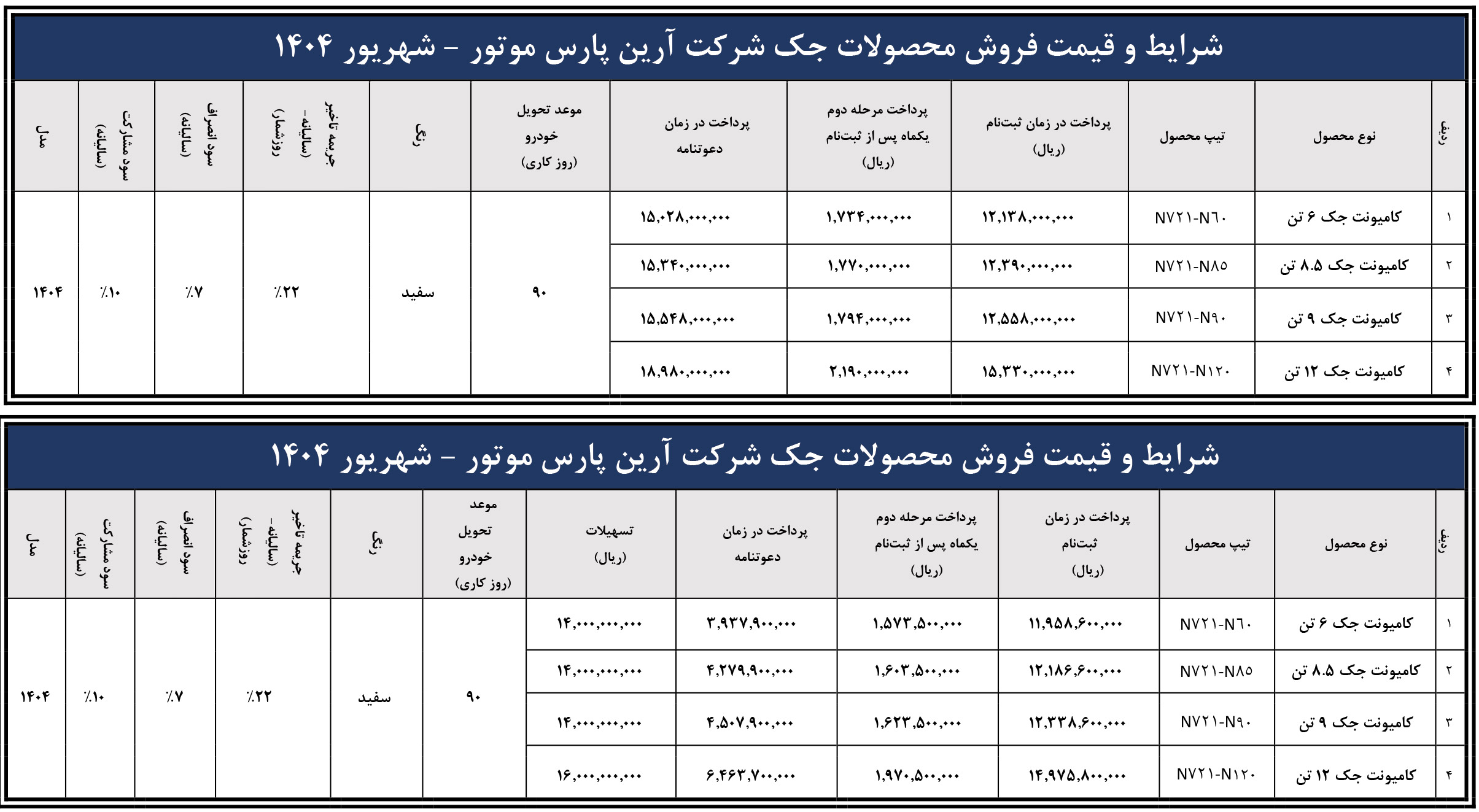 شرایط فروش اقساطی آرین دیزل ویژه متقاضیان طرح ثبت نام کامیونت جک، از روز شنبه مورخ 1404/06/15 آغاز شده و تا زمان تکمیل ظرفیت فروش نیز ادامه خواهد داشت: