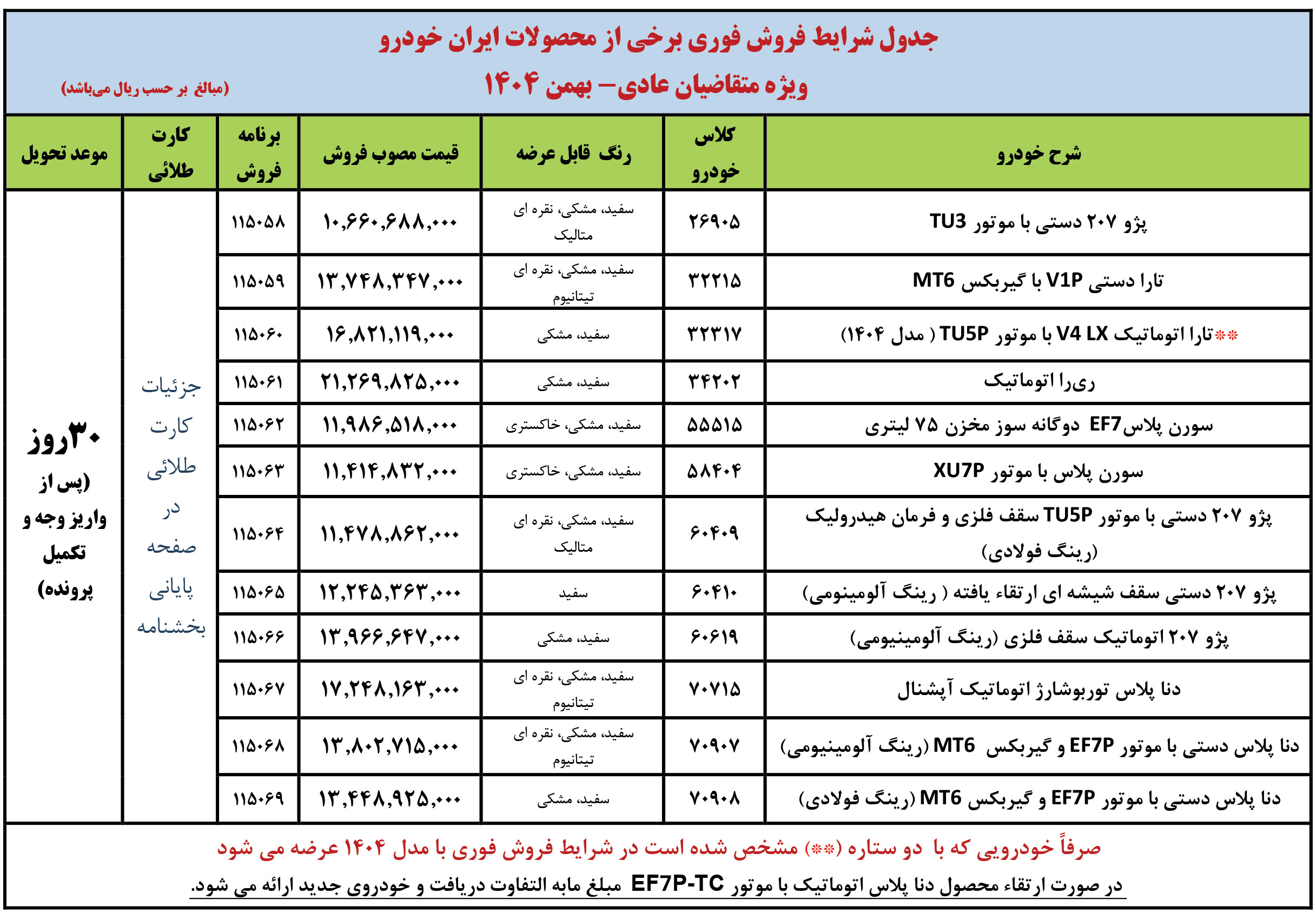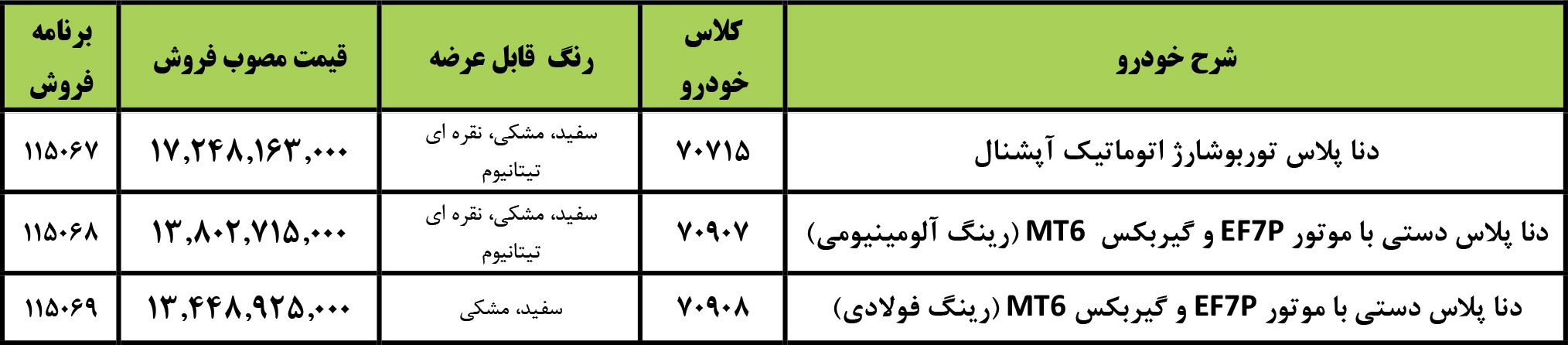 همزمان با اعلام هشتمین مرحله فروش سراسری شرکت ایران خودرو ویژه مهرماه 1404، شرایط فروش انواع محصولات خانواده دناپلاس، در مدل‌های تنفس طبیعی و توربوشارژ، نیز از سوی این شرکت اعلام شده است که براساس آن، متقاضیان از روز یکشنبه مورخ 1404/07/06 تا پایان روز پنجشنبه مورخ 1404/07/10 جهت نام‌نویسی و انتخاب حداکثر یک خودرو (مطابق جدول زیر) مهلت دارند: