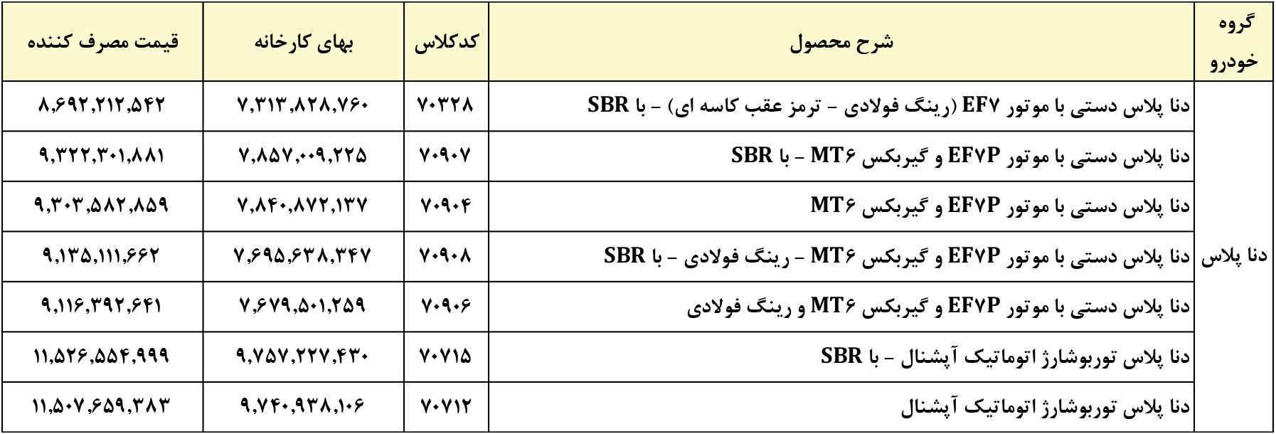 همزمان با اعلام قیمت انواع محصولات ایران خودرو در تاریخ 1404/01/09، قیمت جدید انواع دناپلاس نیز مطابق جدول زیر مشخص شده است: