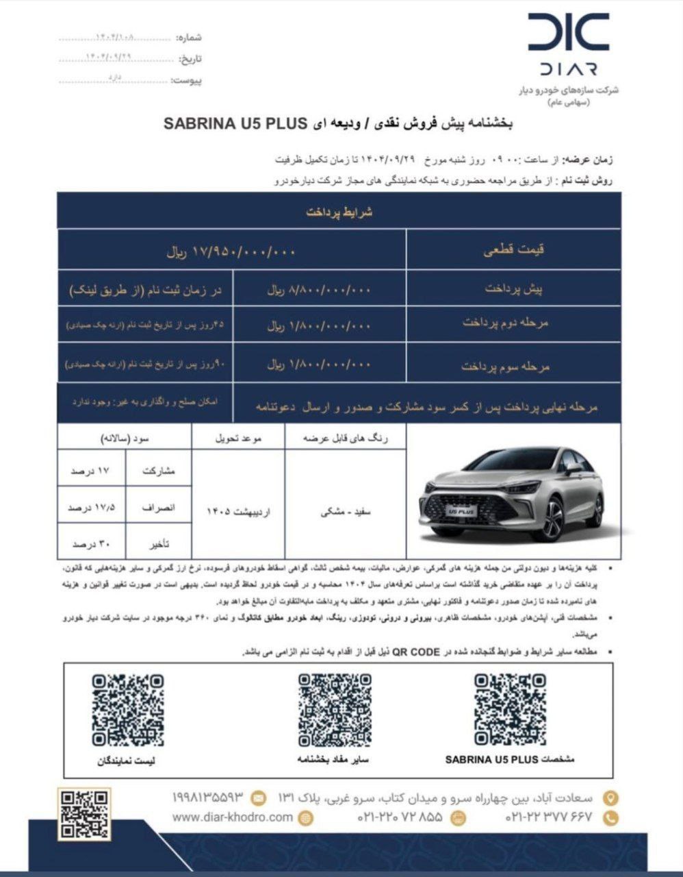 ثبت نام نقدی یو 5 پلاس دیار خودرو: مرداد 1404