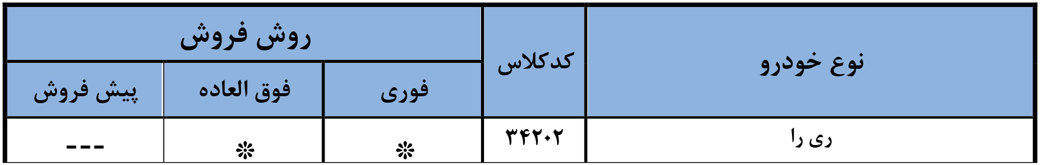 شرکت ایران خودرو از تاریخ 1404/01/09 قیمت جدید خودروی ریرا با کدکلاس 34201 را مطابق جدول زیر اعلام کرده است: