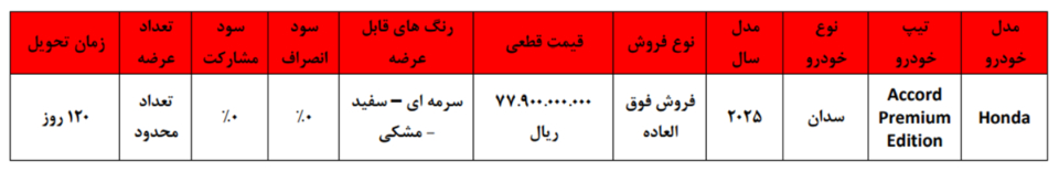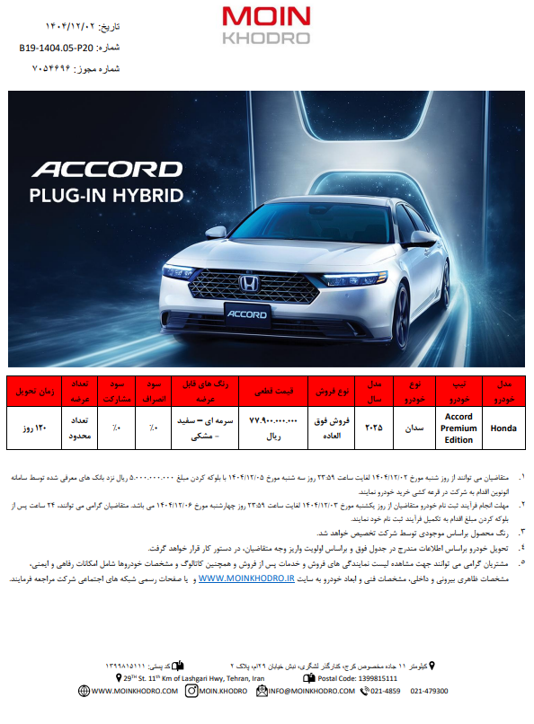 شرایط فروش شرکت معین خودرو ویژه متقاضیان ثبت نام هوندا آکورد وارداتی از طریق سامانه یکپارچه وارداتی ، از روز یکشنبه مورخ 1404/11/05 آغاز میشود و تا پایان روز سهشنبه مورخ 1404/11/07 نیز ادامه دارد.