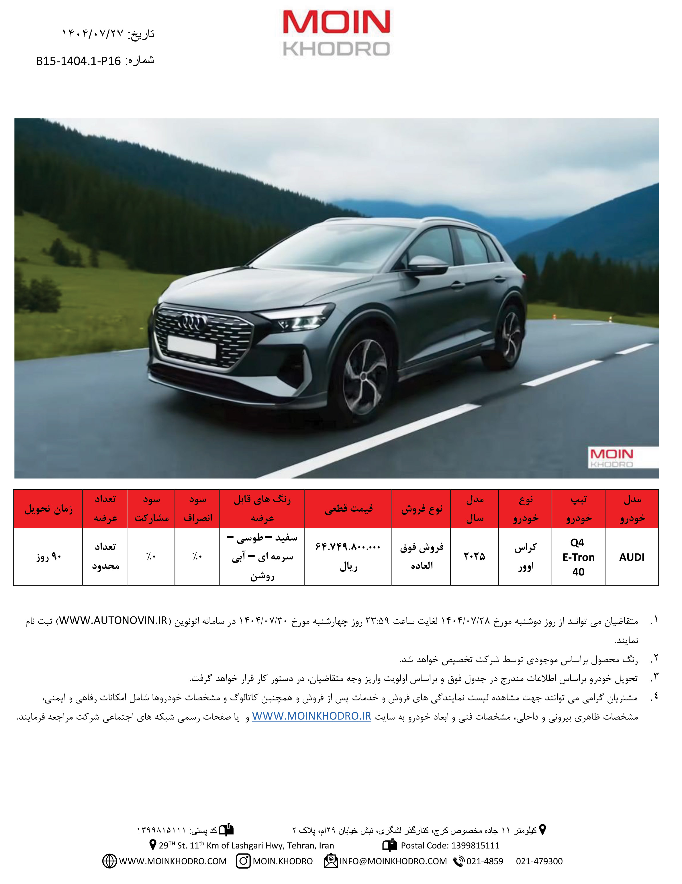 شرایط فروش معین خودرو ویژه متقاضیان ثبت نام آئودی Q4 وارداتی این شرکت، از روز دوشنبه مورخ 28 مهرماه 1404 مطابق جدول زیرف اعلام شده است: