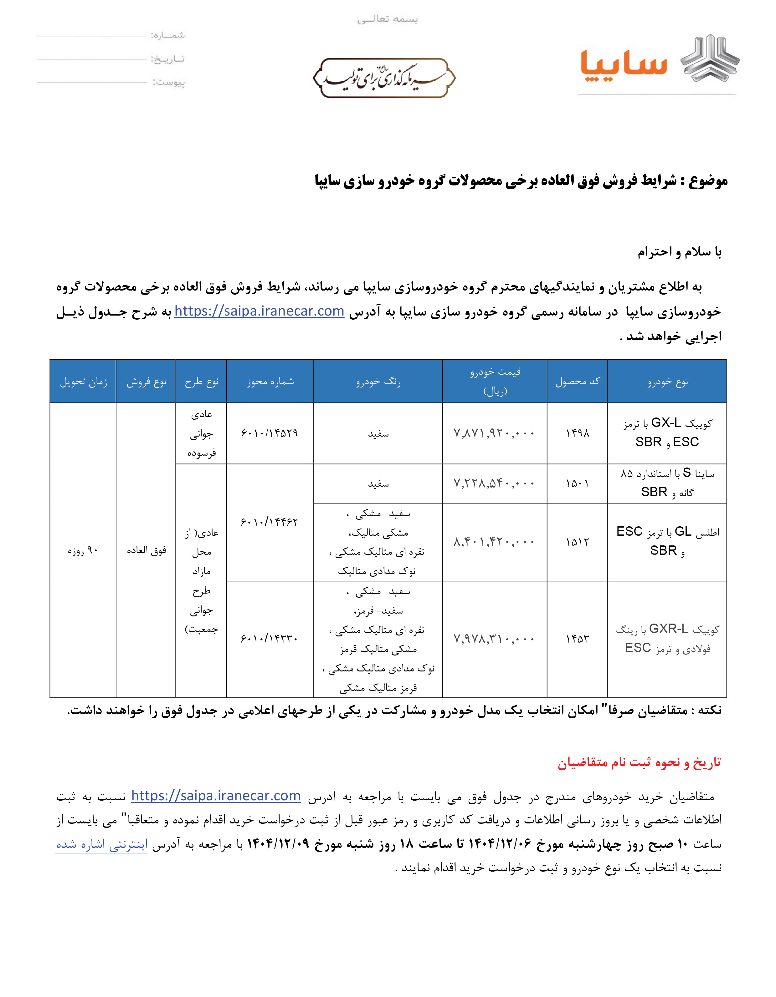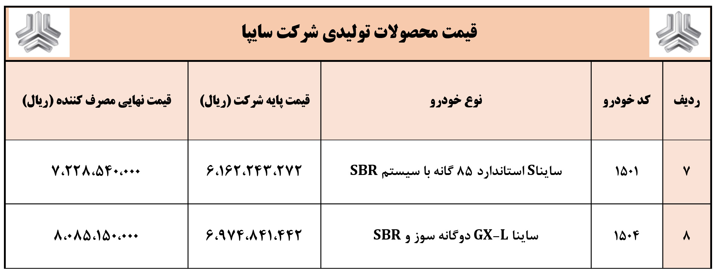 شرکت خودروسازی سایپا در تیرماه 1404، لیست قیمت ثبت نام خودرو ساینا را مطابق جدول زیر اعلام کرده است:
