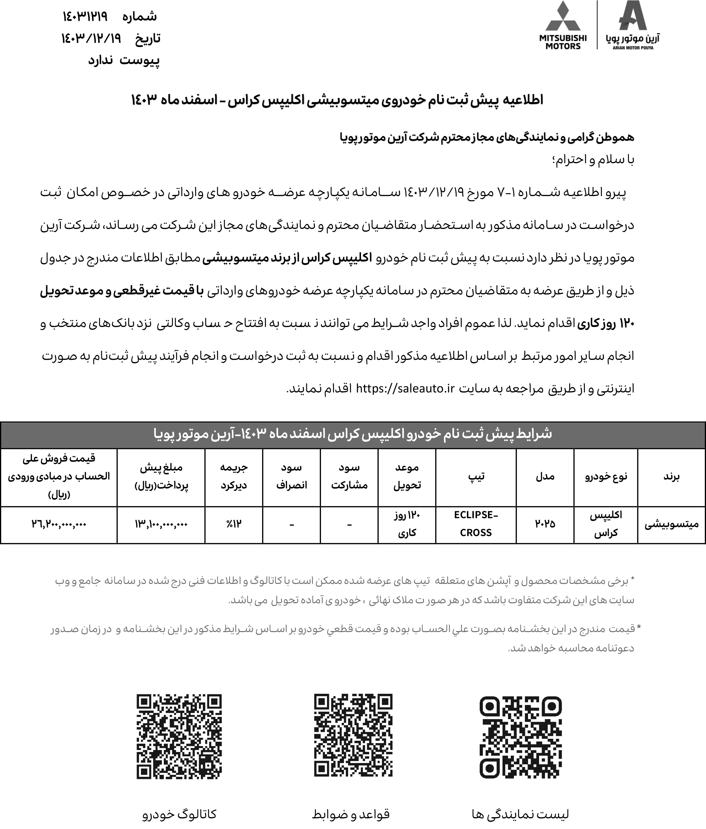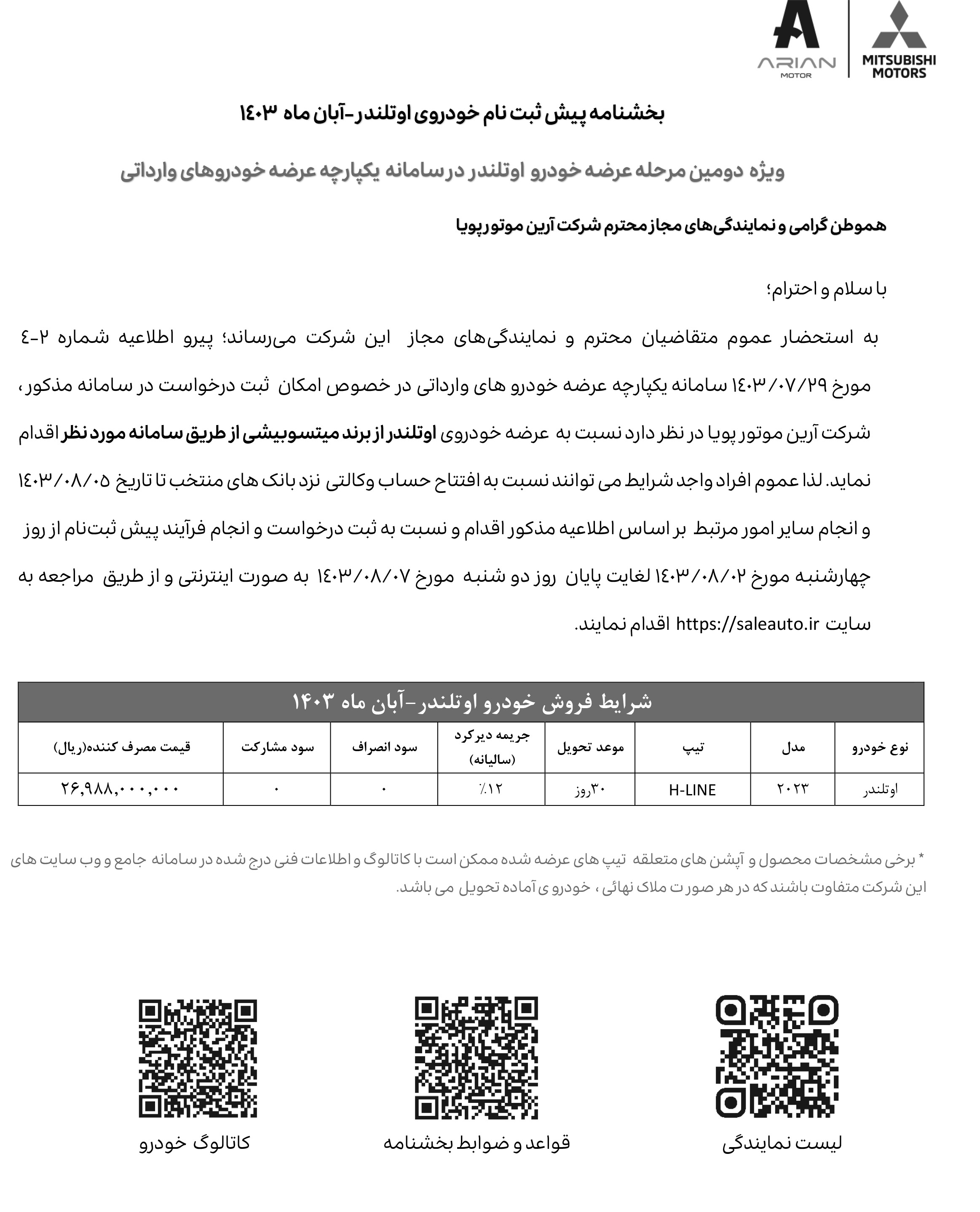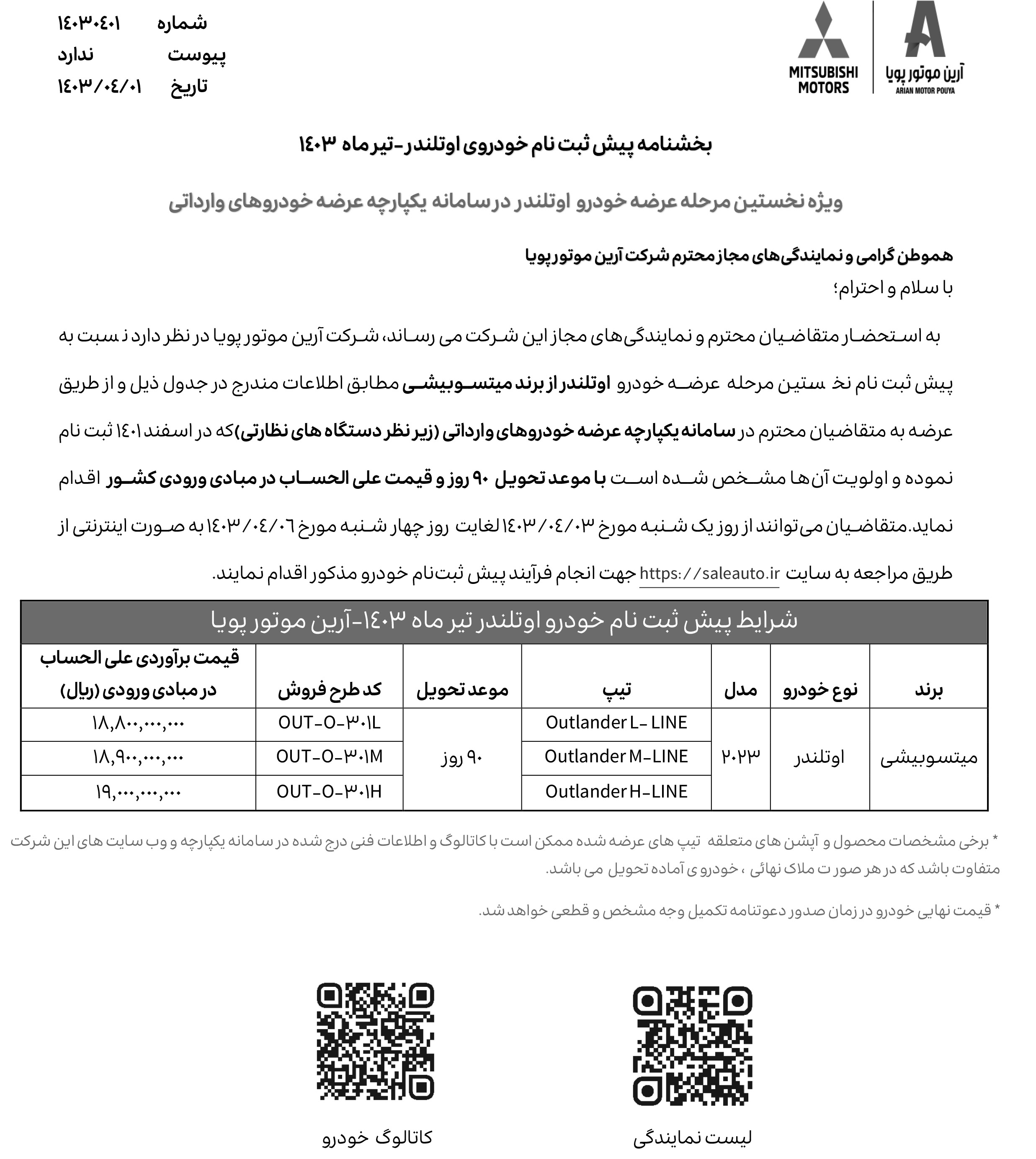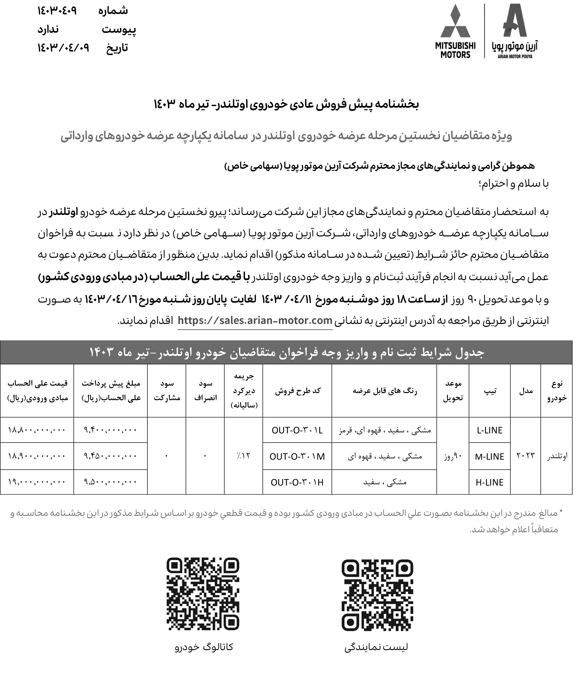 همزمان با آغاز عرضه خودروهای وارداتی از تاریخ 1403/04/03، شرکت آرین موتور نیز برای نخستینبار، شرایط فروش خودروهای اوتلندر تکدیفرانسیل را اعلام کرده است. این مرحله از ثبت نام میتسوبیشی، صرفا ویژه منتخبین سامانه یکپارچه وارداتی بوده و از روز یکشنبه مورخ 1403/04/03 شروع شده و تا روز چهارشنبه مورخ 1403/04/06 نیز ادامه خواهد داشت: