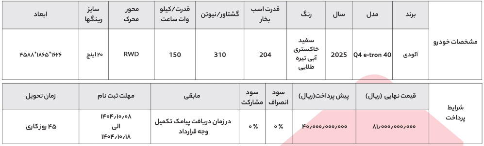 شرایط فروش نادین خودرو ویژه آذرماه 1404 و برای متقاضیان ثبت نام آئودی Q4 ایترون وارداتی این شرکت، مطابق جدول زیر اعلام شده است:
