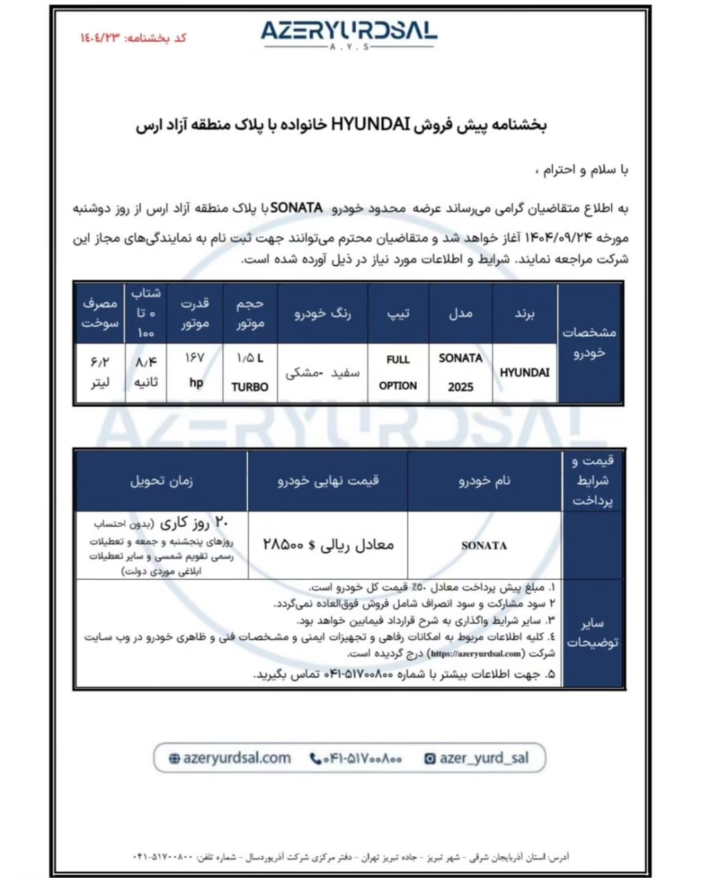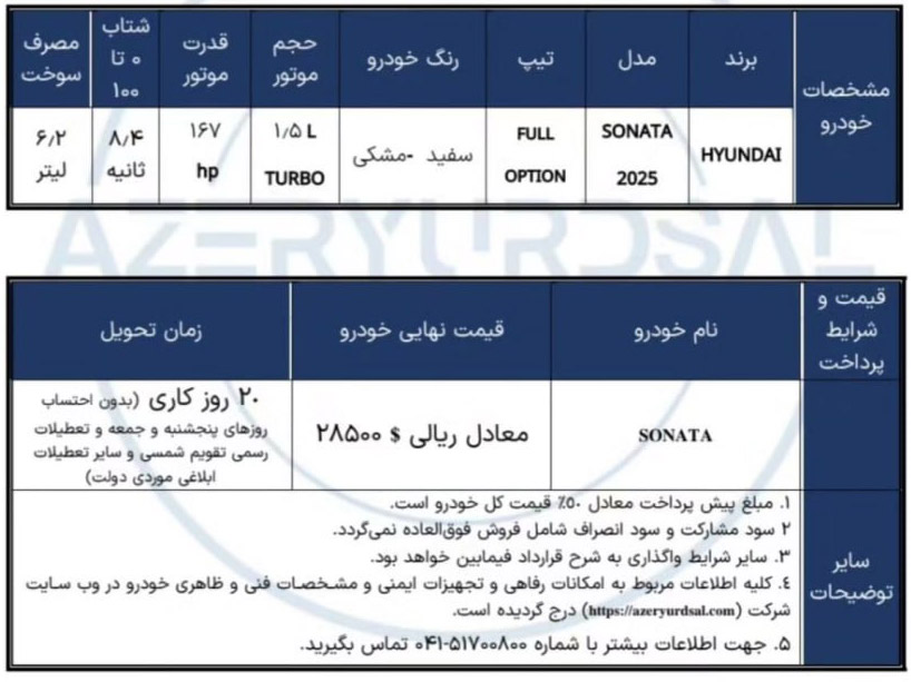 شرایط فروش هیوندای ویژه متقاضیان ثبت نام سوناتا توربو مدل 2025 وارداتی شرکت آذریوردسال (با پلاک منطقه آزاد ارس)، از روز دوشنبه مورخ 1404/09/24 آغاز شده و تا زمان تکمیل ظرفیت فروش نیز ادامه دارد: