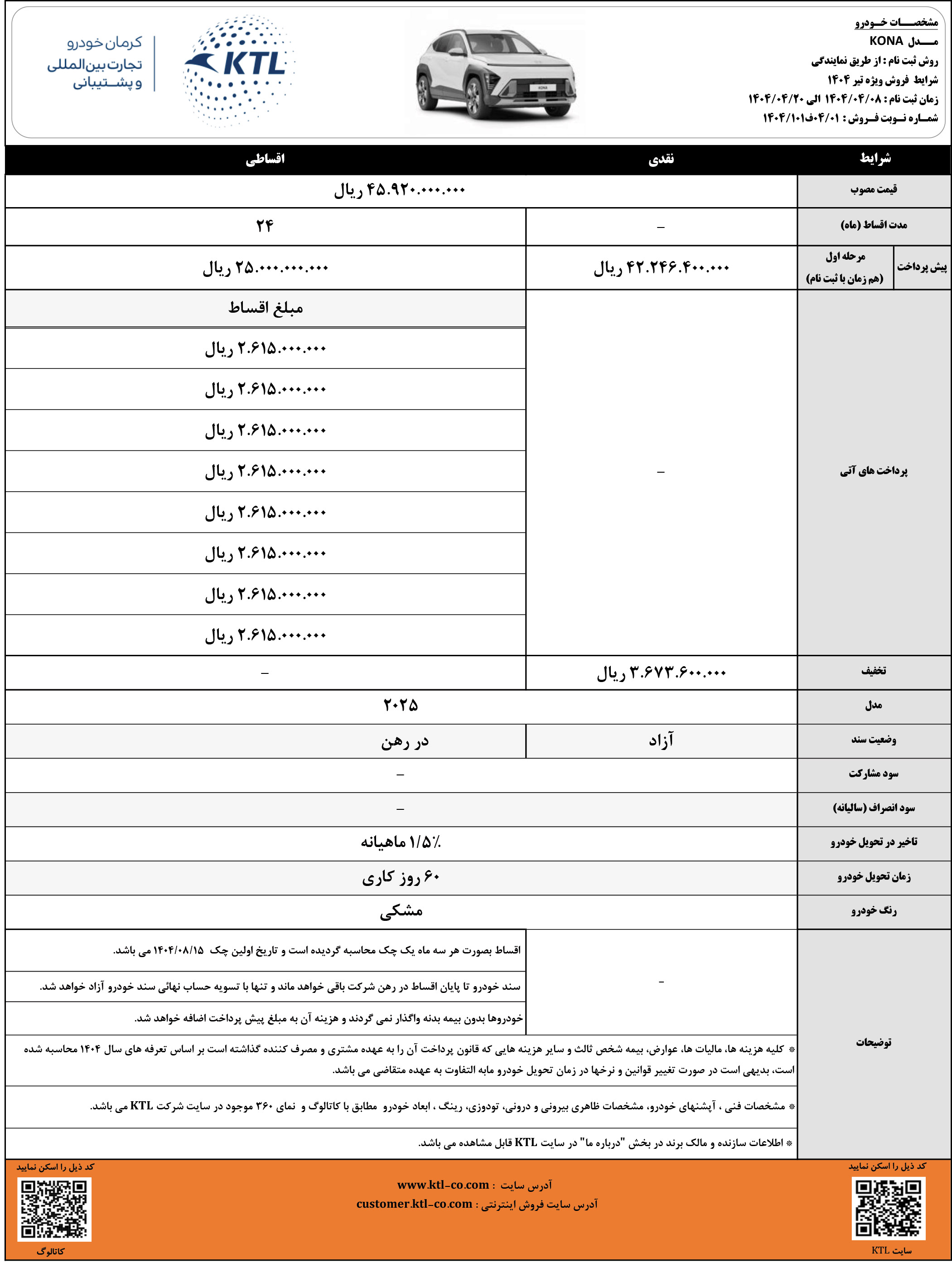 براساس بخشنامه فروش اقساطی هیوندای کونا، قیمت خودرو قطعی بوده و سند خودرو تا پایان تسویه نهایی، در رهن شرکت است. جزییات بیشتر را از لینک زیر دریافت کنید:
