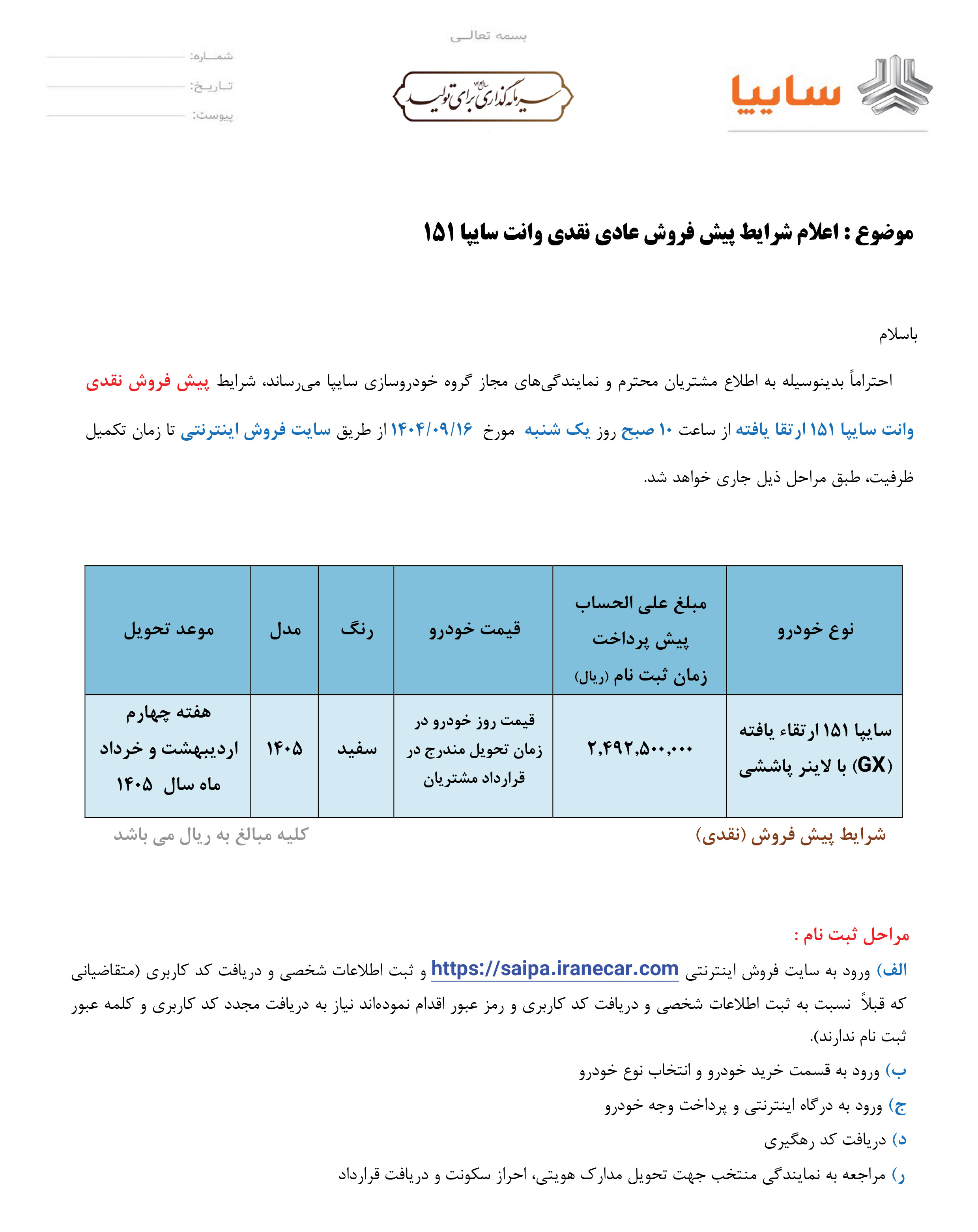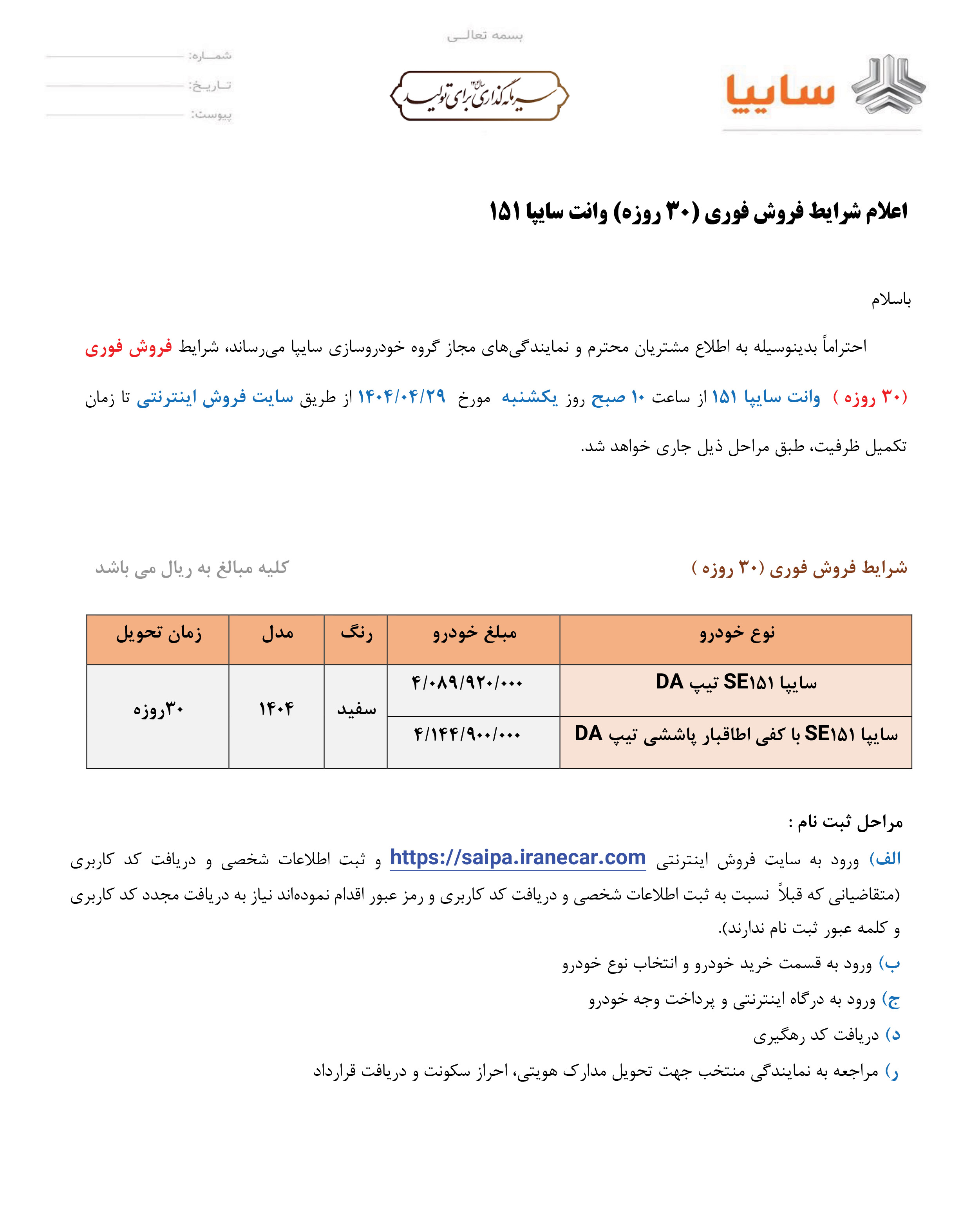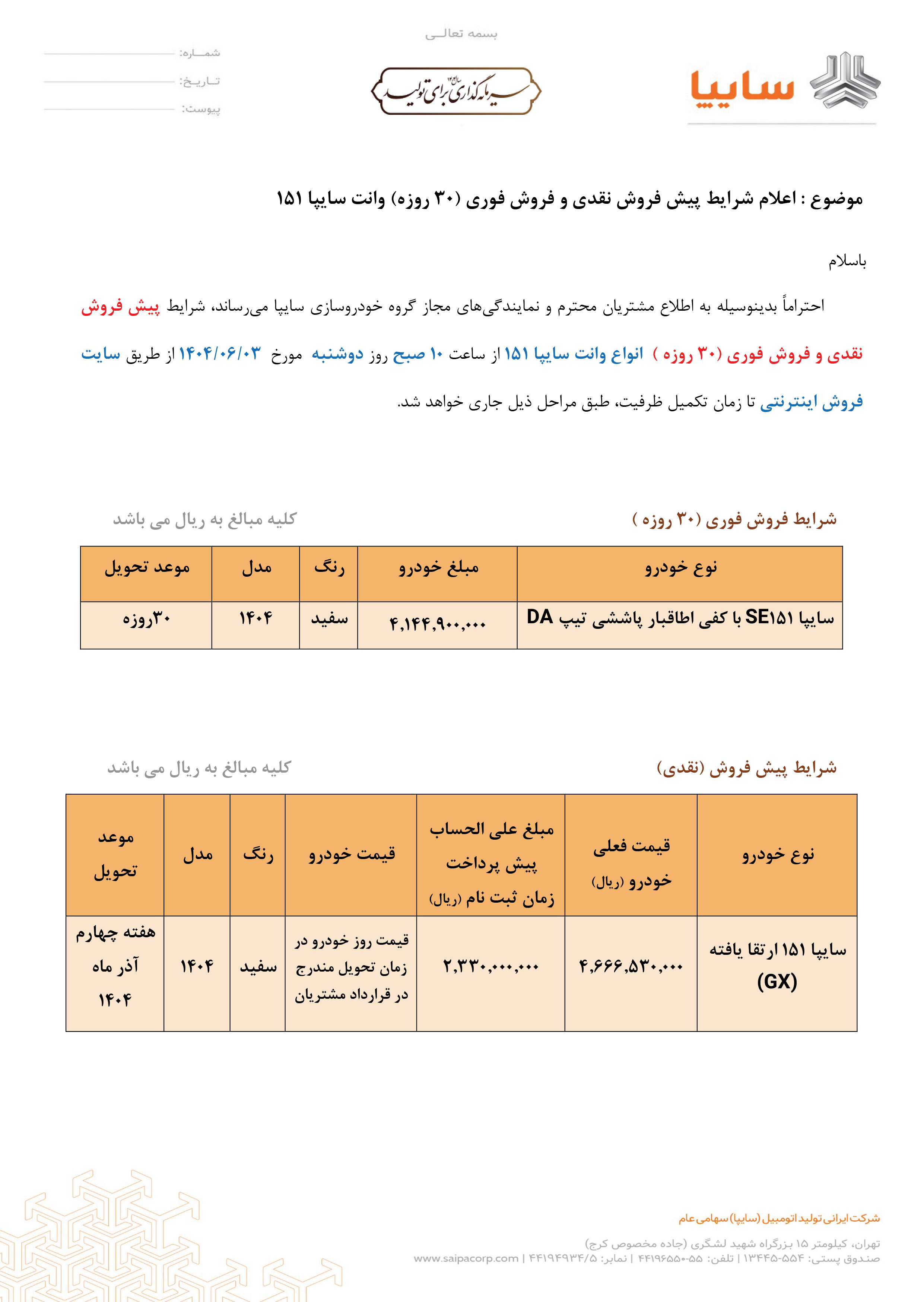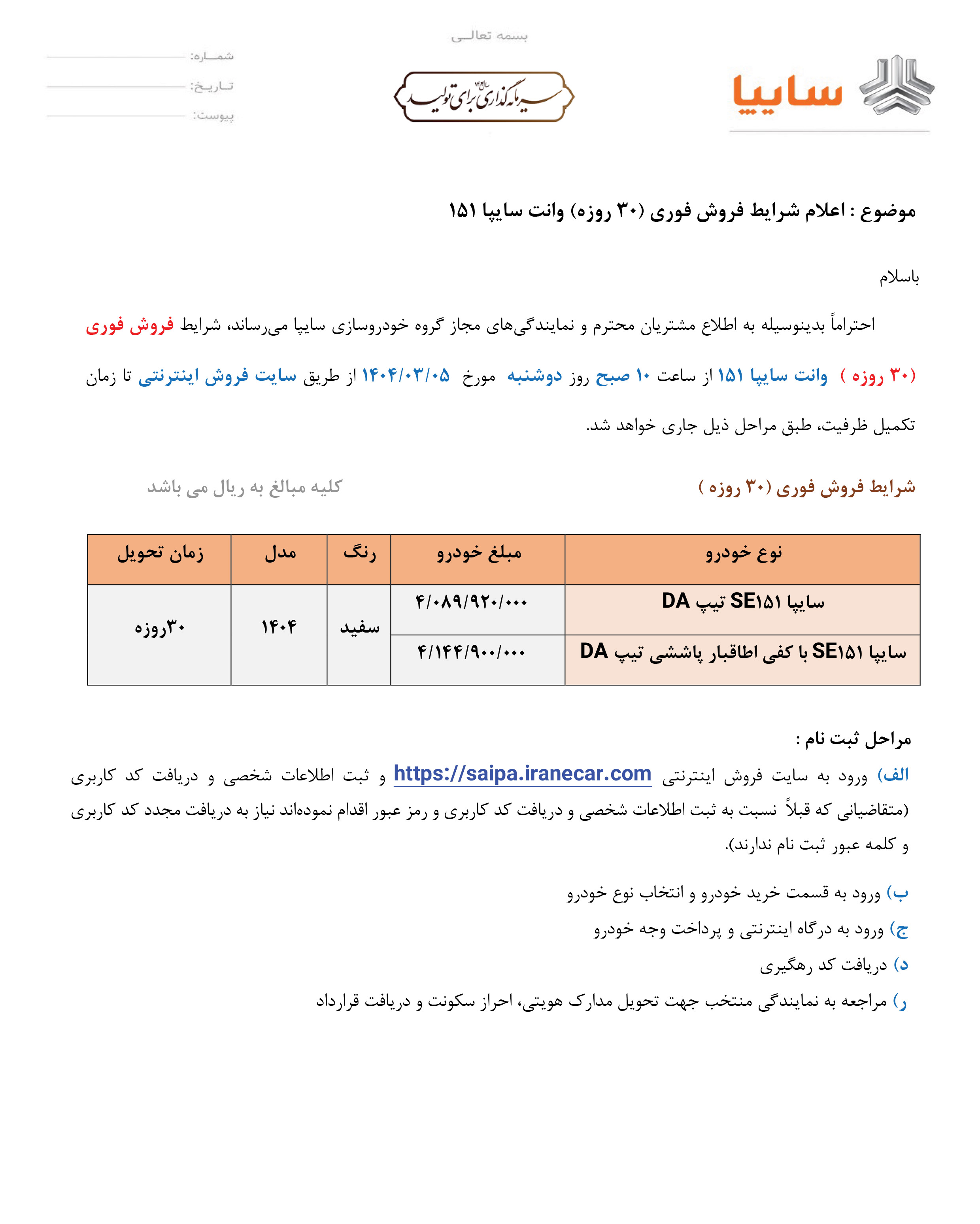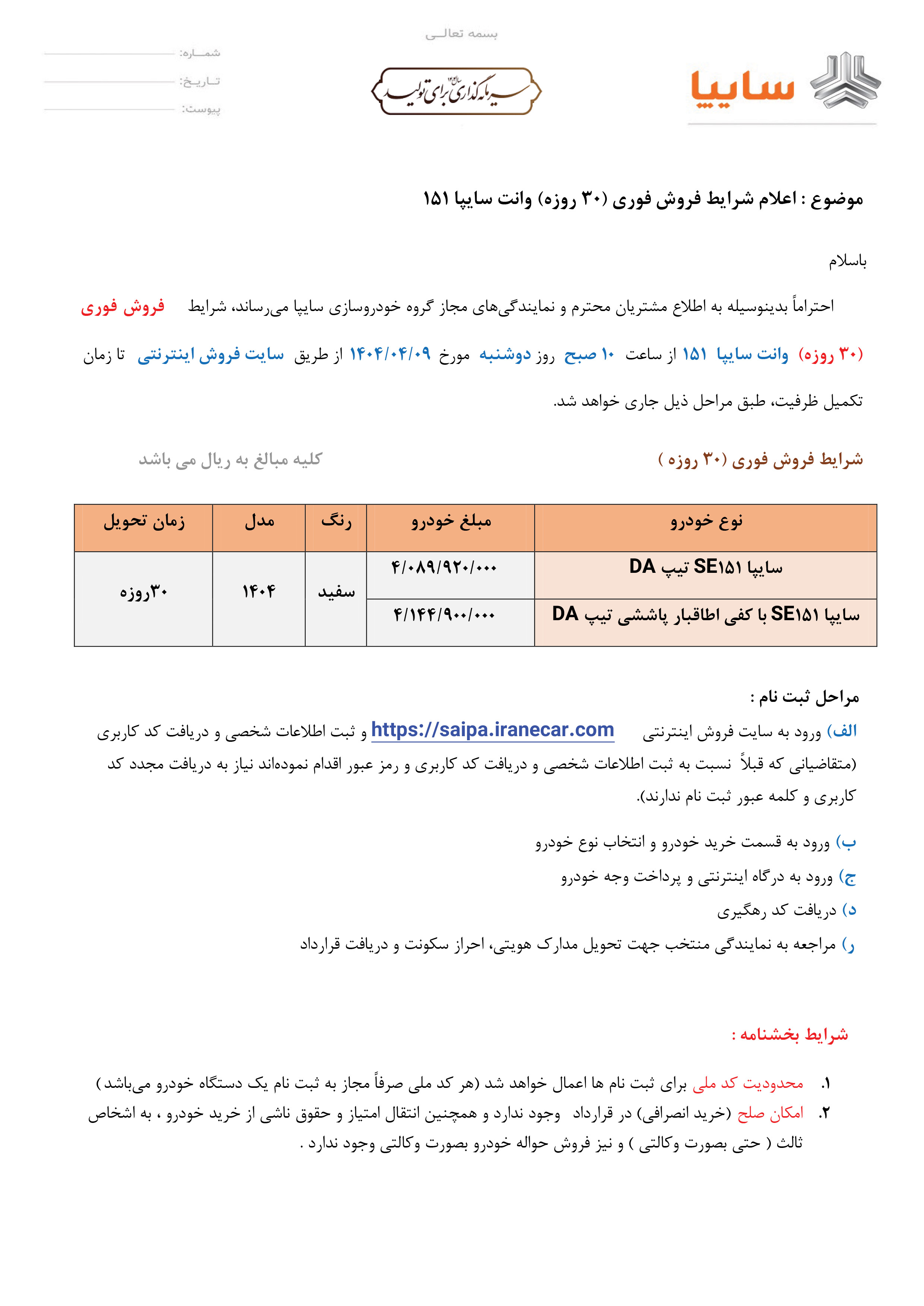 بخشنامه پیش فروش وانت 151 سایپا (PDF)