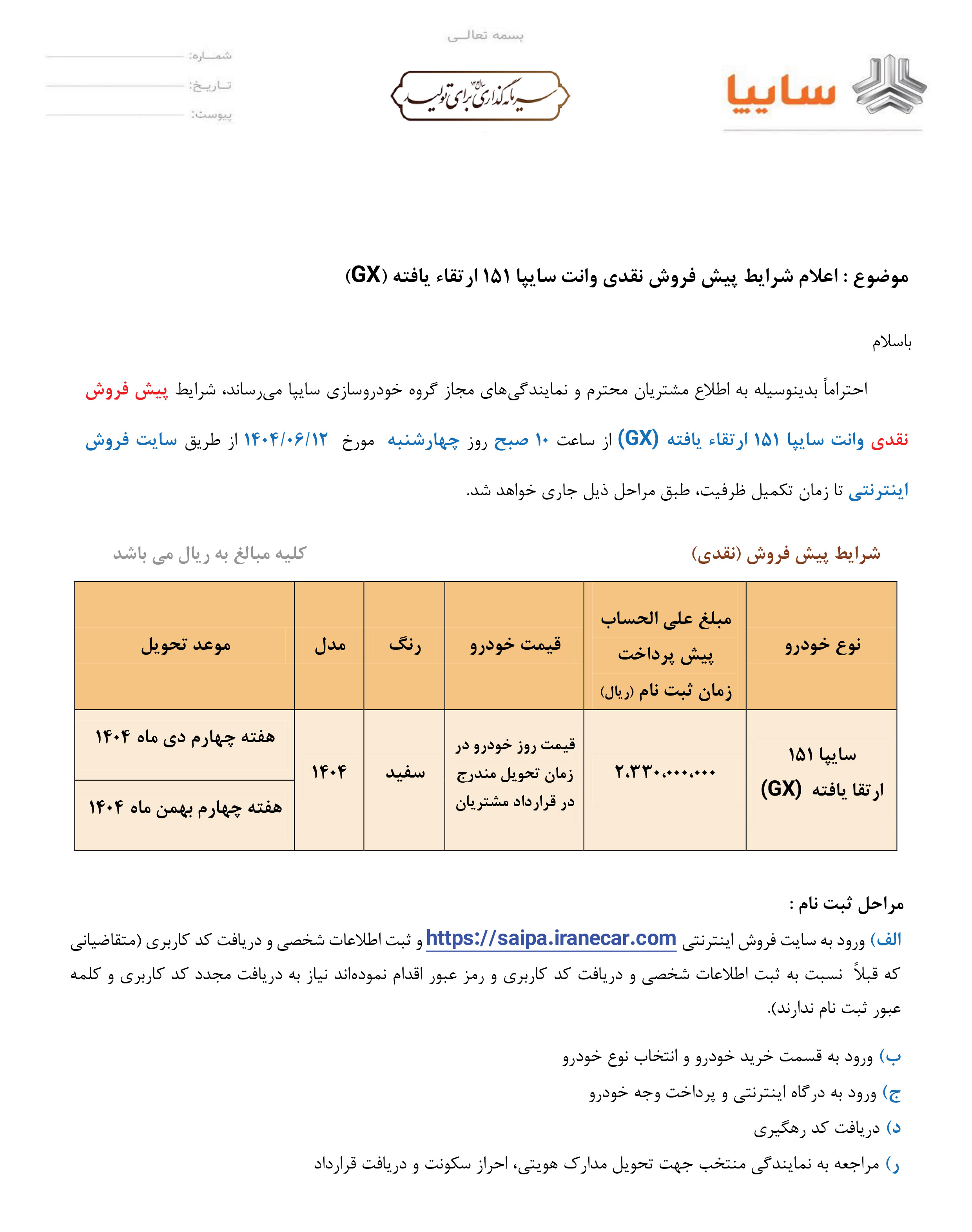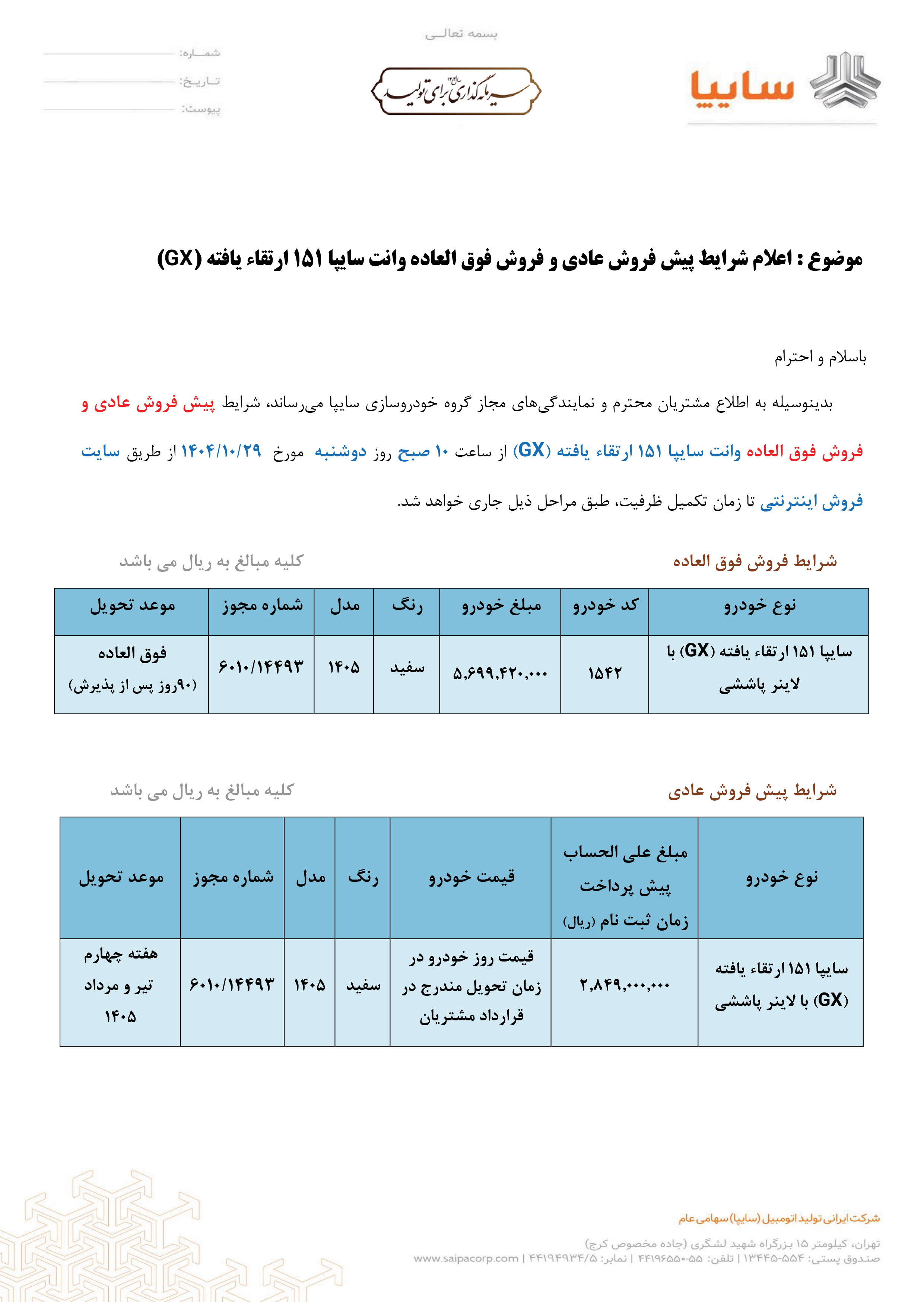 بخشنامه فروش وانت 151 جی ایکس (PDF)