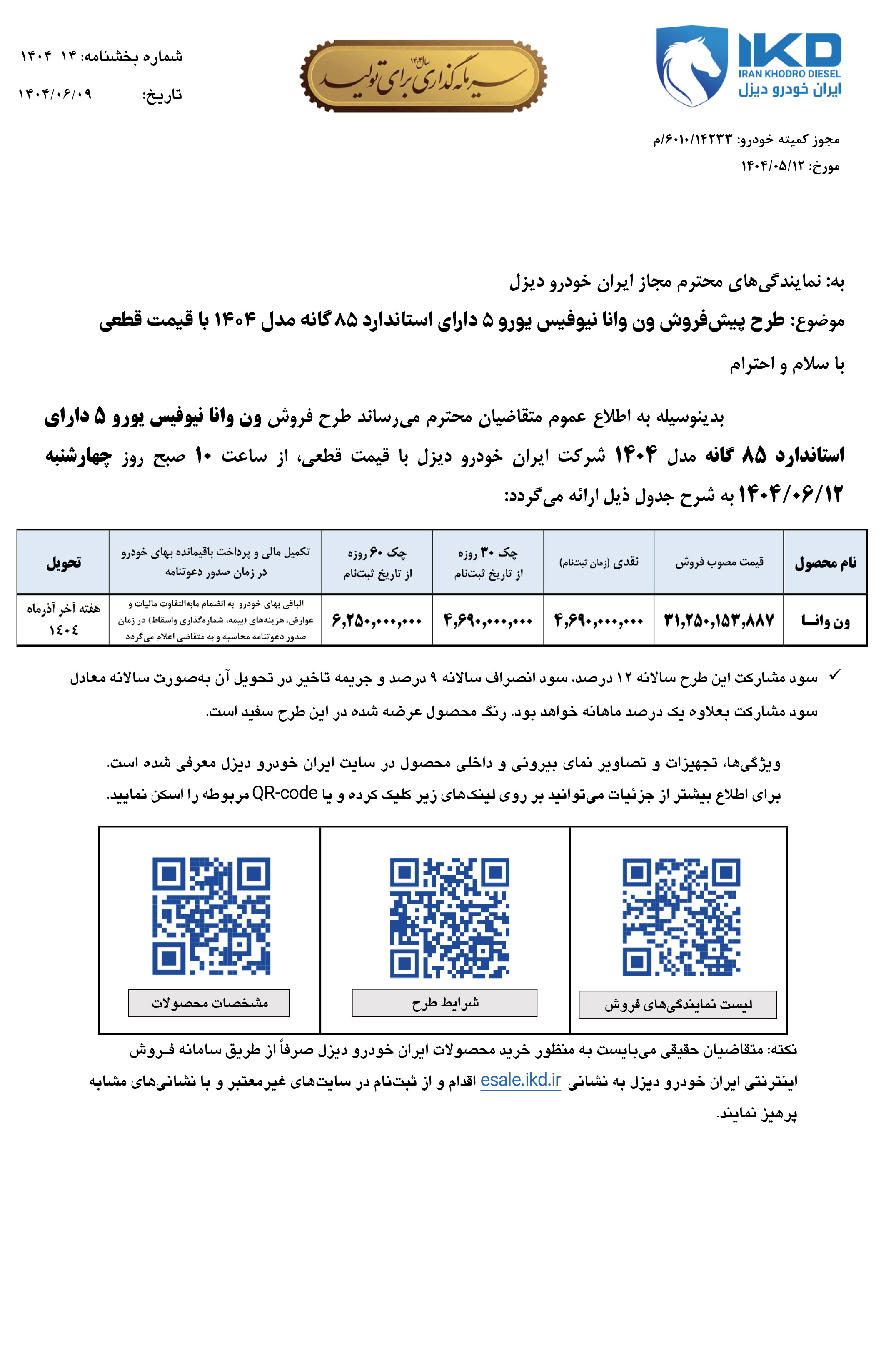 جزییات عرضه جدید ون وانا از طریق بورس کالا ویژه آبانماه 1404، از سوی شرکت ایران خودرو دیزل اعلام شده است: