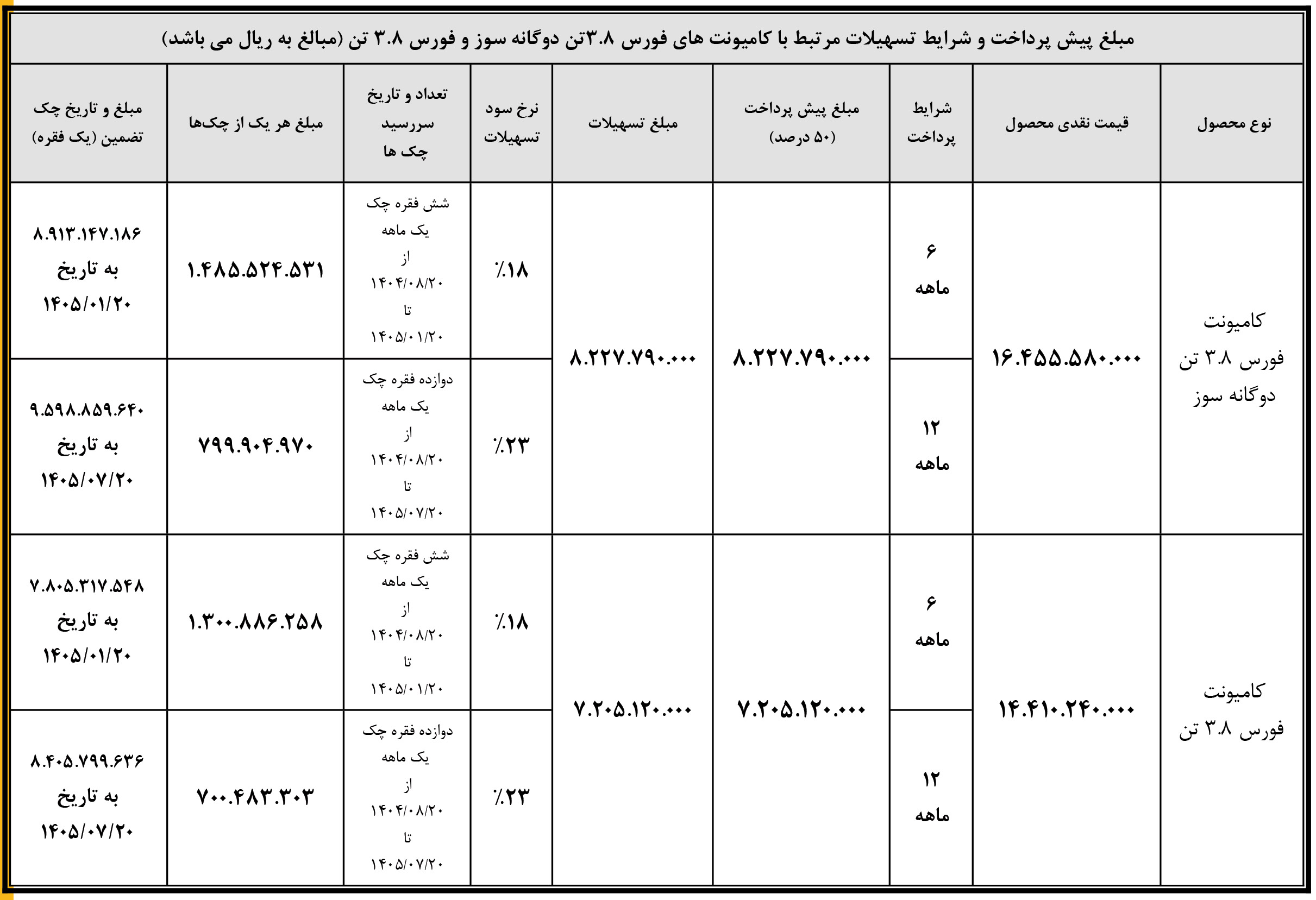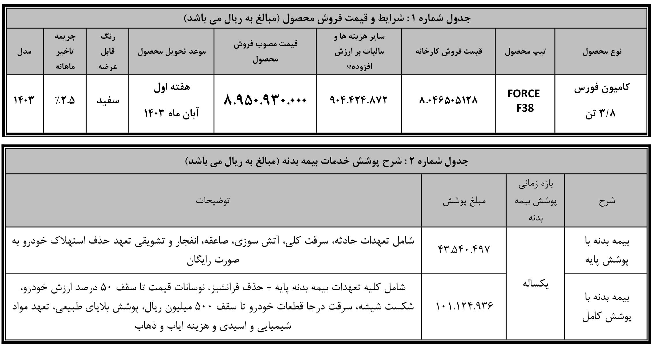 | فورس 3.8 تن دوگانه | 1,590,000,000 |