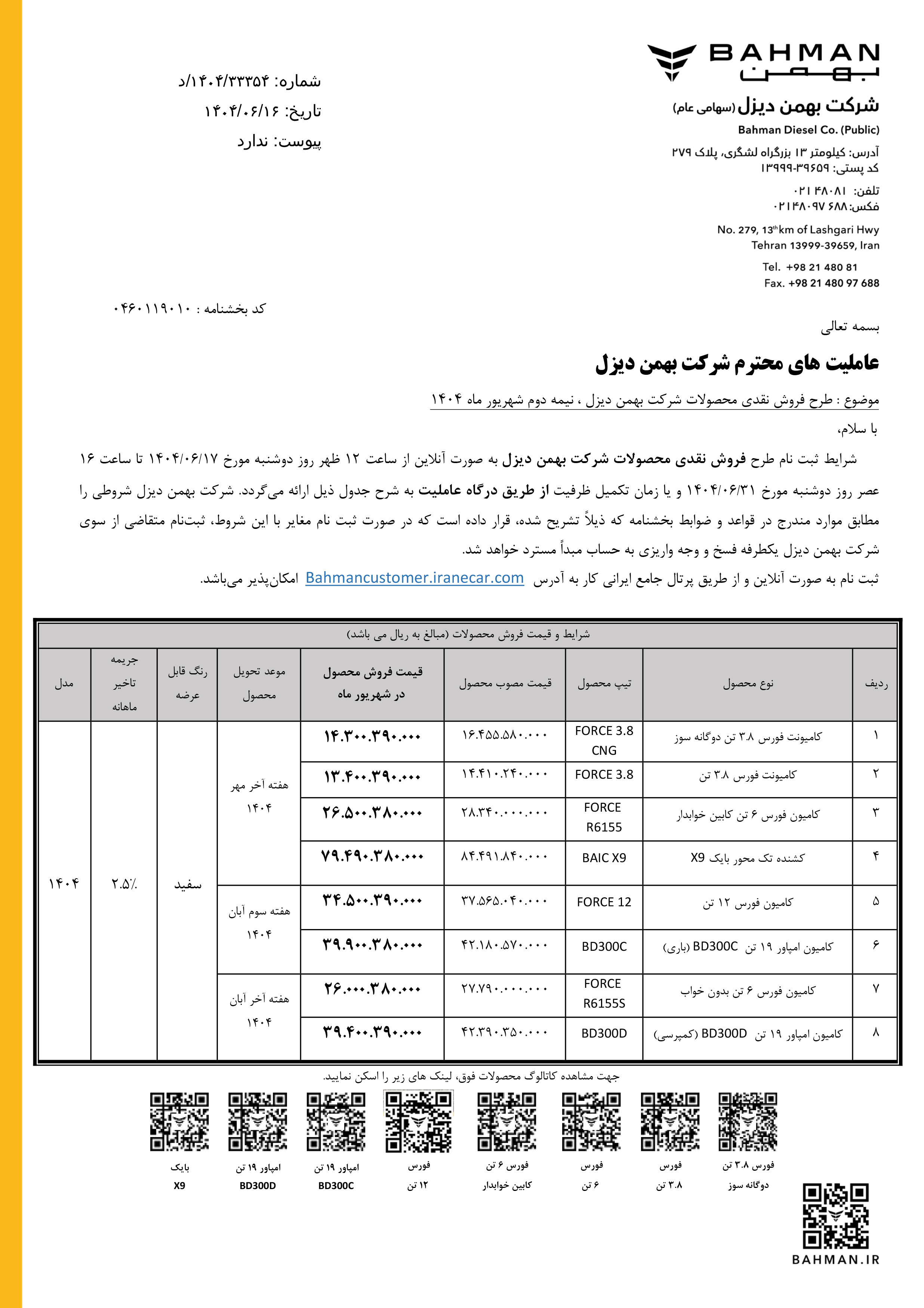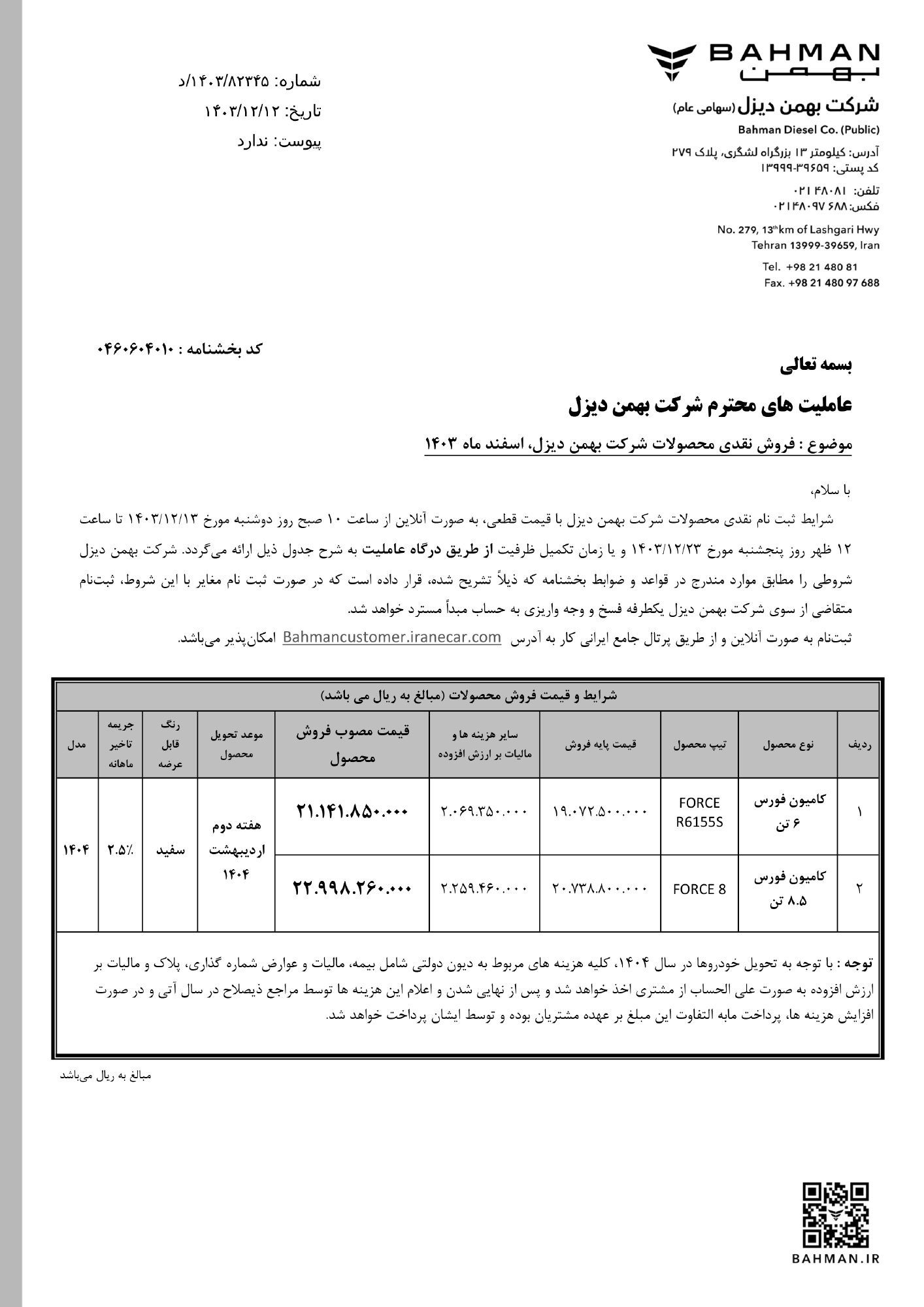 شرکت بهمن دیزل با صدور اطلاعیهای، تاریخ و شرایط فروش نقدی کامیون فورس 12 تن را اعلام کرد. در طرح فروش کامیون فورس 12 تن بهمن دیزل که از ساعت 10 صبح روز شنبه مورخ 1403/09/03 آغاز و تا ساعت 16 چهارشنبه 1403/09/14 ادامه دارد، این کامیون با رنگ سفید و مدل 1403 عرضه میشود: