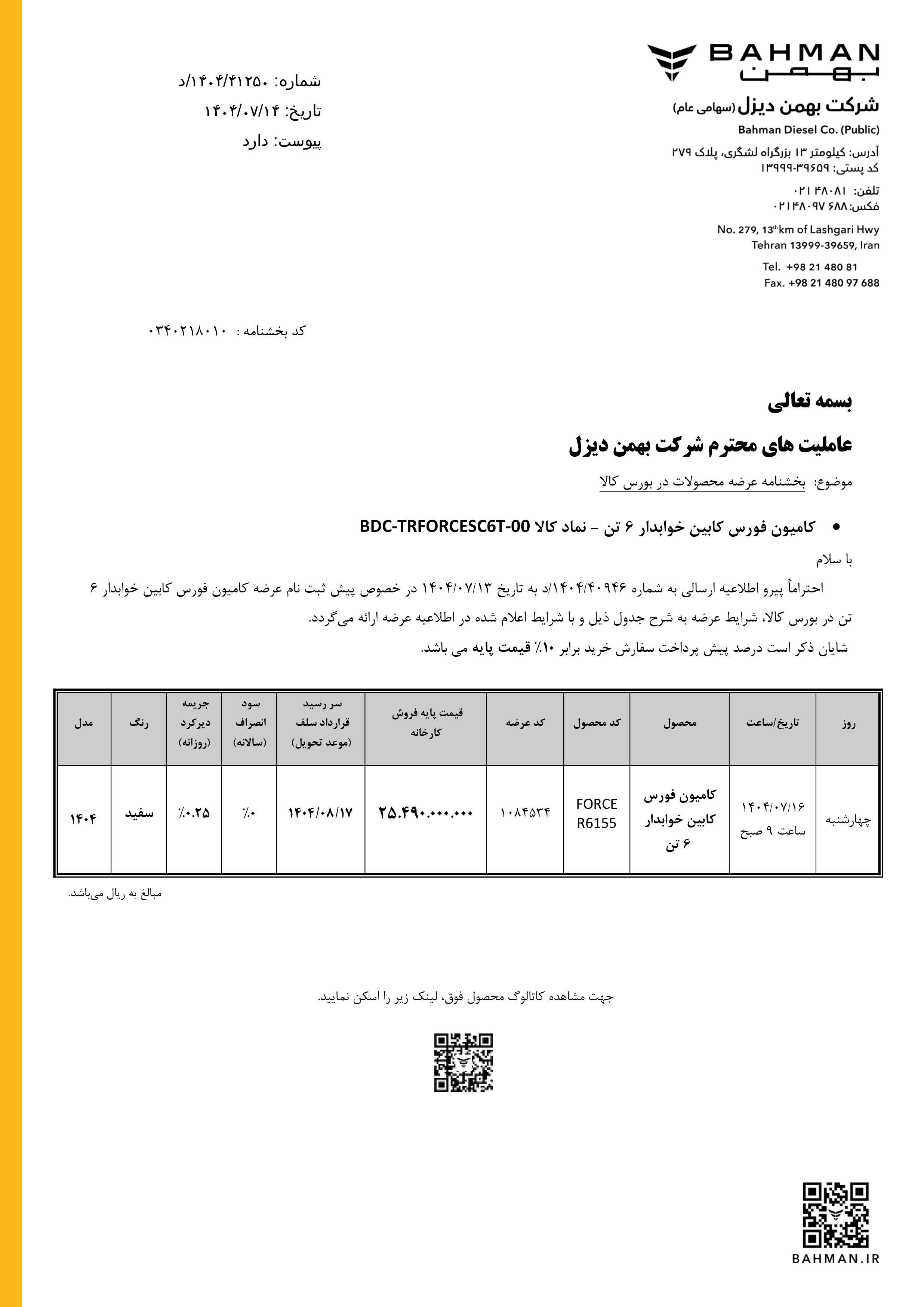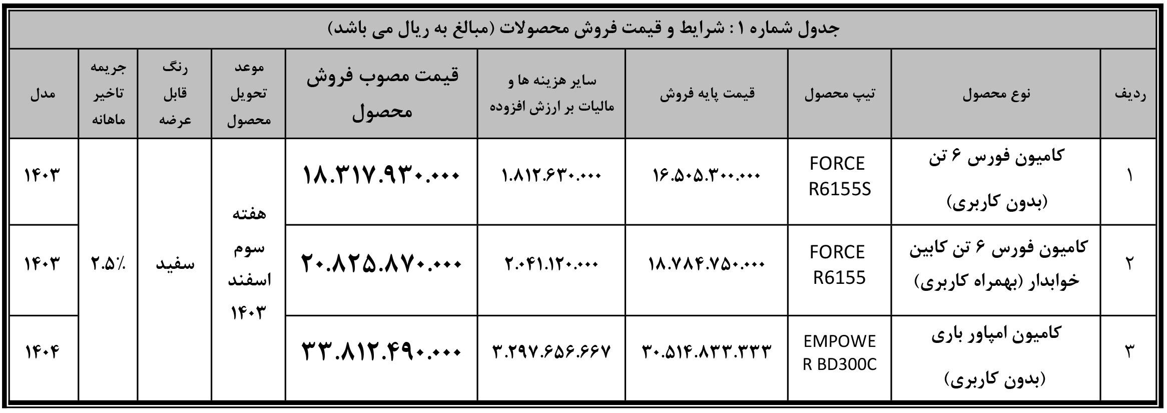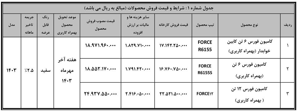 روز سهشنبه مورخ 18 اردیبهشتماه 1403، پنجاه دستگاه کامیونت فورس شش تن (بدون کاربری و با رنگ سفید) از شرکت بهمن دیزل، در بورس کالا و مطابق جدول زیر عرضه شد: