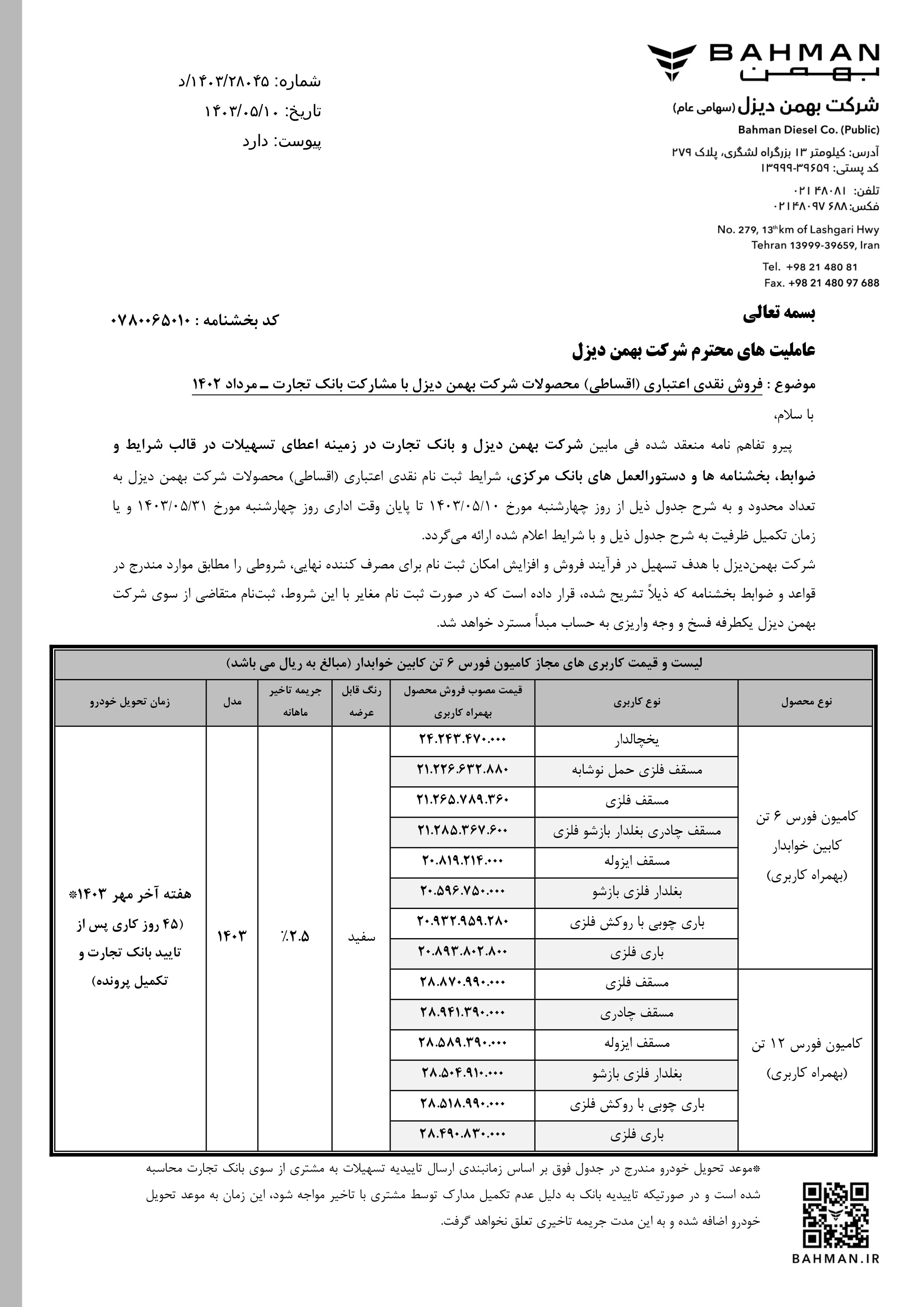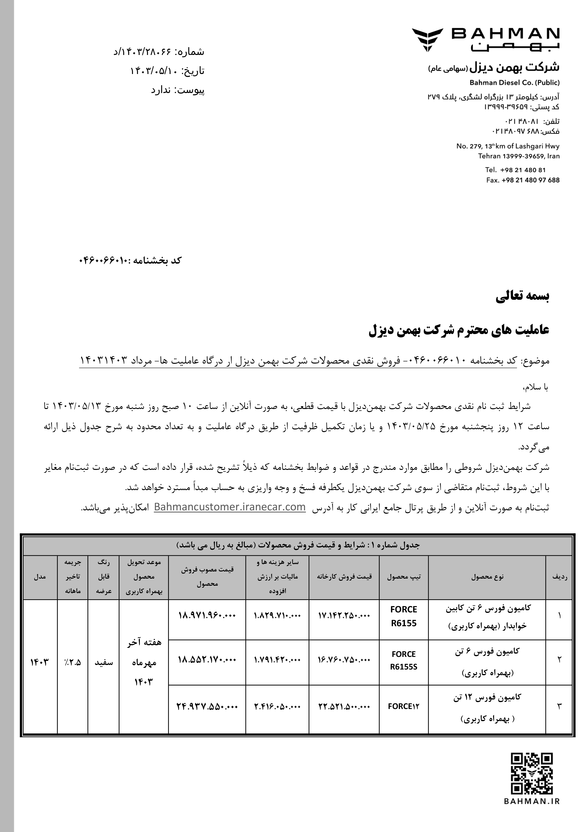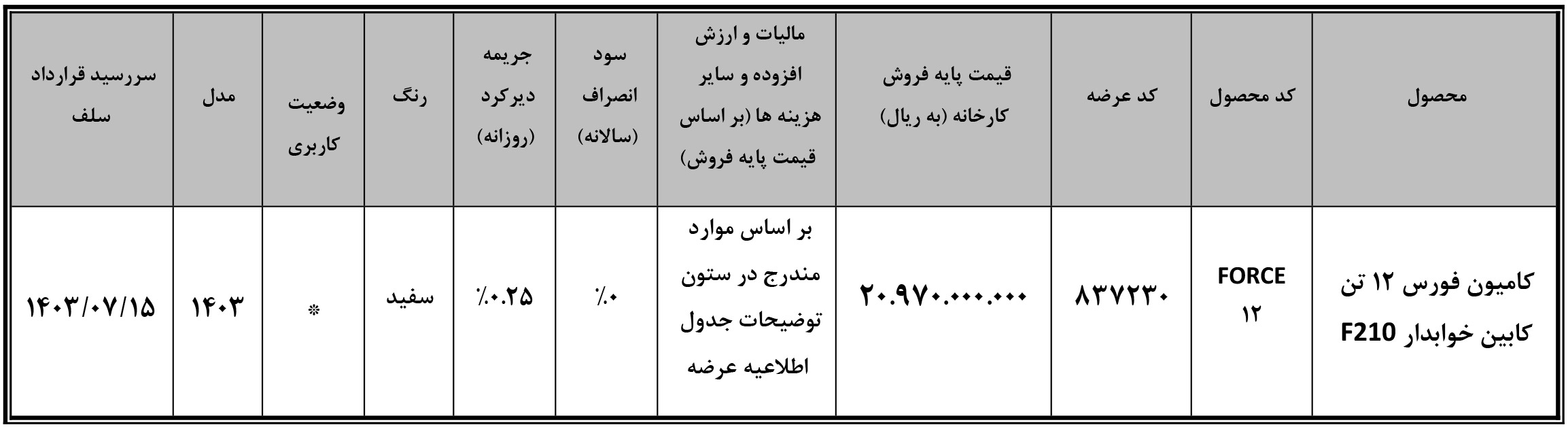روز سهشنبه مورخ 18 اردیبهشتماه 1403، پنجاه دستگاه کامیونت فورس شش تن (بدون کاربری و با رنگ سفید) از شرکت بهمن دیزل، در بورس کالا و مطابق جدول زیر عرضه شد: