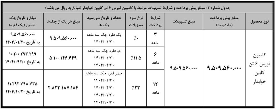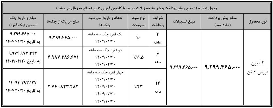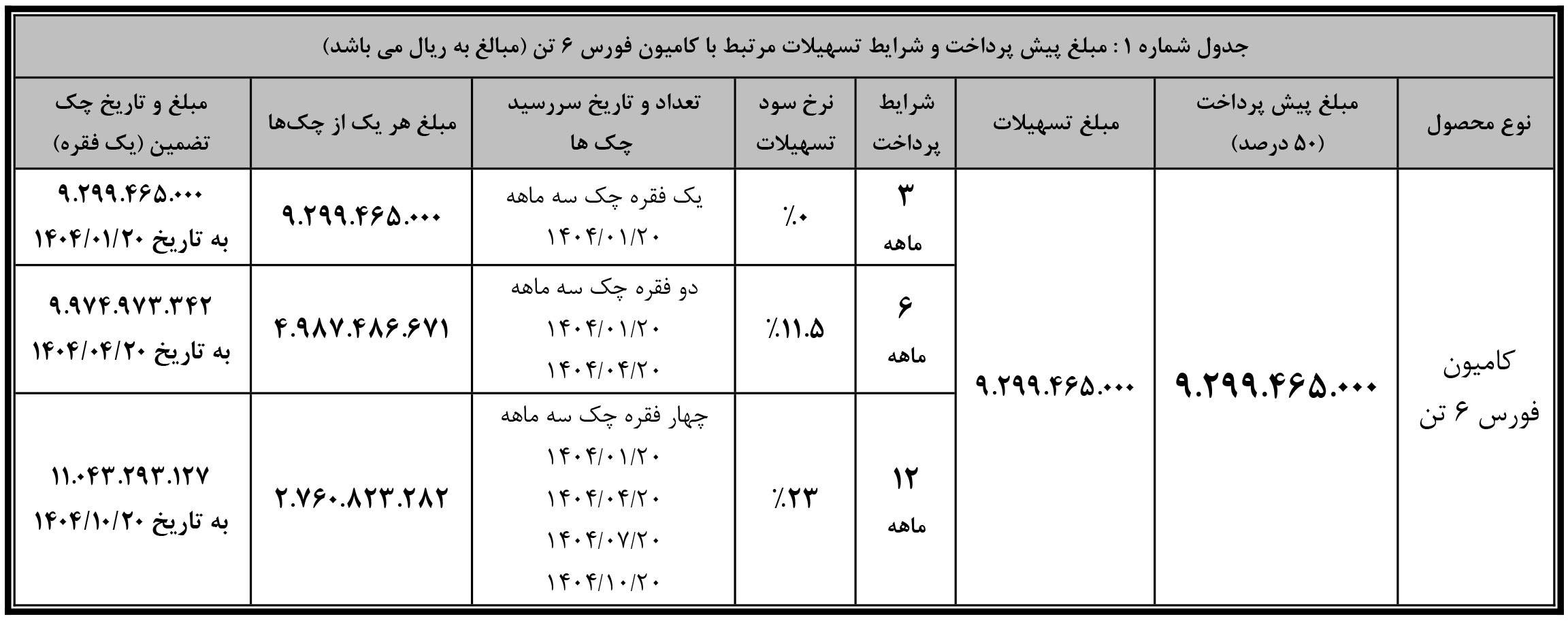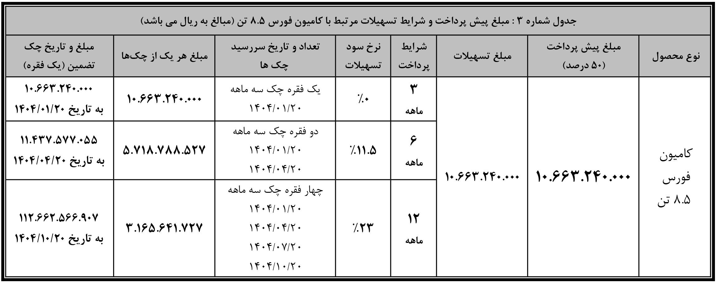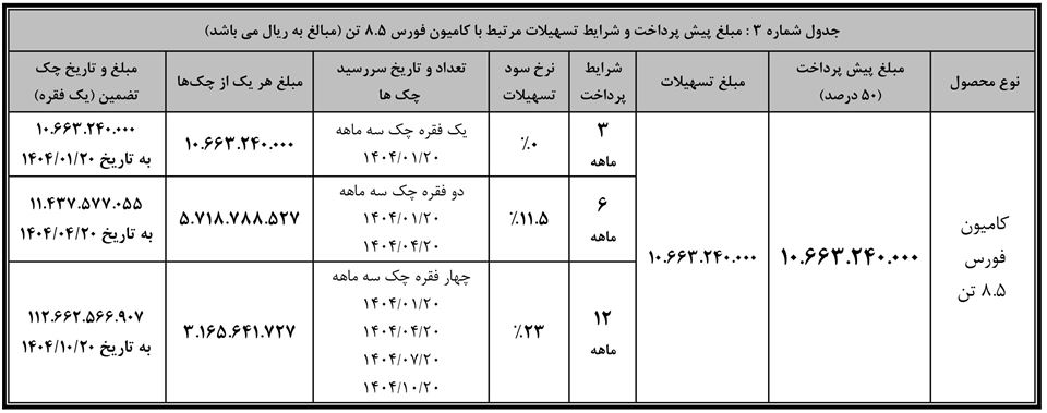 شرایط فروش کامیونت فورس 8.5 تن، از سوی شرکت بهمن دیزل مطابق با جدول زیر، ویژه اسفندماه 1404 اعلام شده است: