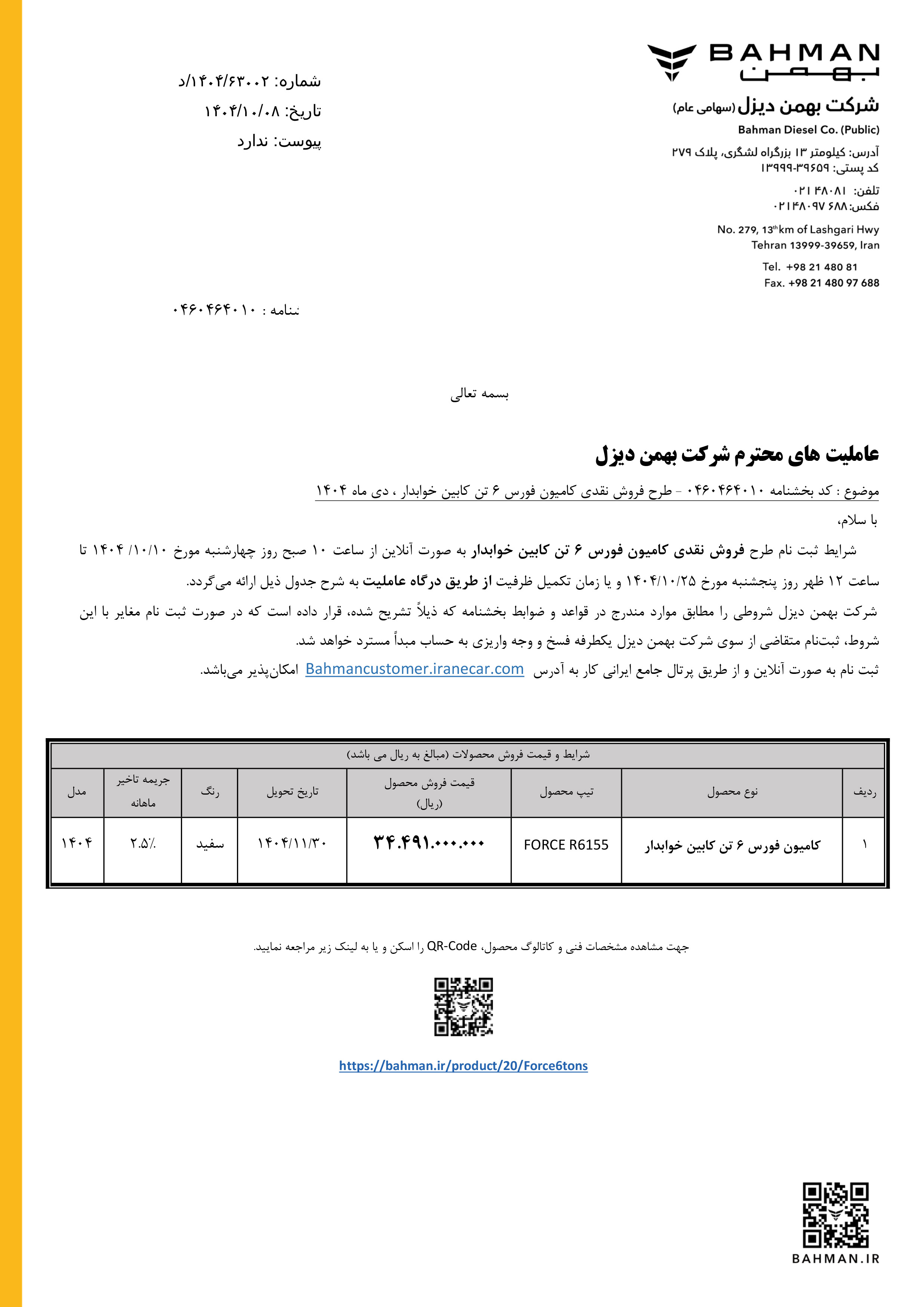 شرایط فروش نقدی فورس، ویژه متقاضیان ثبت نام کامیون فورس 6 تن خوابدار، از روز چهارشنبه مورخ 1404/10/10 آغاز شده و تا ساعت 12 ظهر روز پنجشنبه مورخ 1404/10/25 یا تا زمان تکمیل ظرفیت فروش ادامه خواهد داشت: