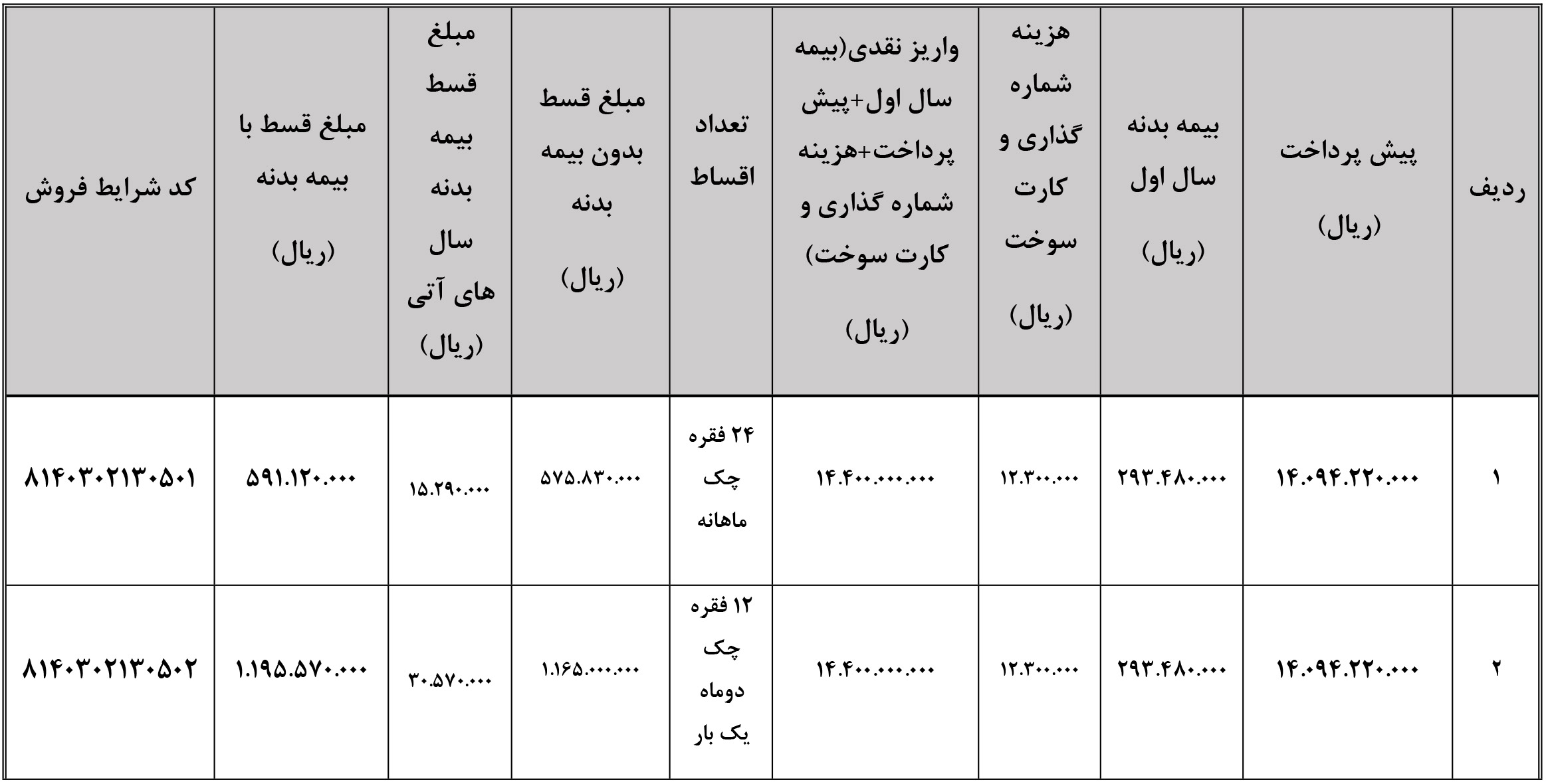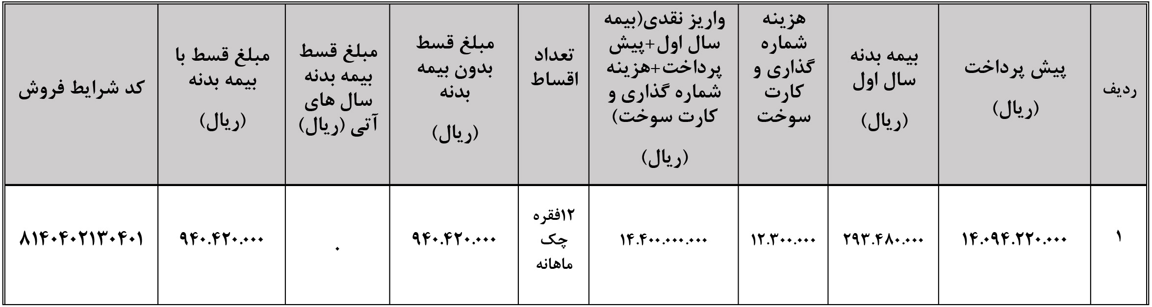 در این طرح که با اقساط متنوع 3 و 6 و 12 ماهه شروع میشود، تسهیلات 900 تا یک میلیارد تومانی نیز به خریداران تعلق میگیرد. نرخ سود تسهیلات در بازپرداخت 3 ماهه صفر در نظر گرفته شده اما در بازپرداخت 6 ماهه و 12 ماهه به ترتیب، 11.5 و 23 درصد تعیین شده است. شرایط پرداخت در روش 6 و 12 ماهه دارای بیمه بدنه است که قیمت آن در اقساط لحاظ خواهد شد. جزییات بیشتر را از لینک زیر دریافت کنید: