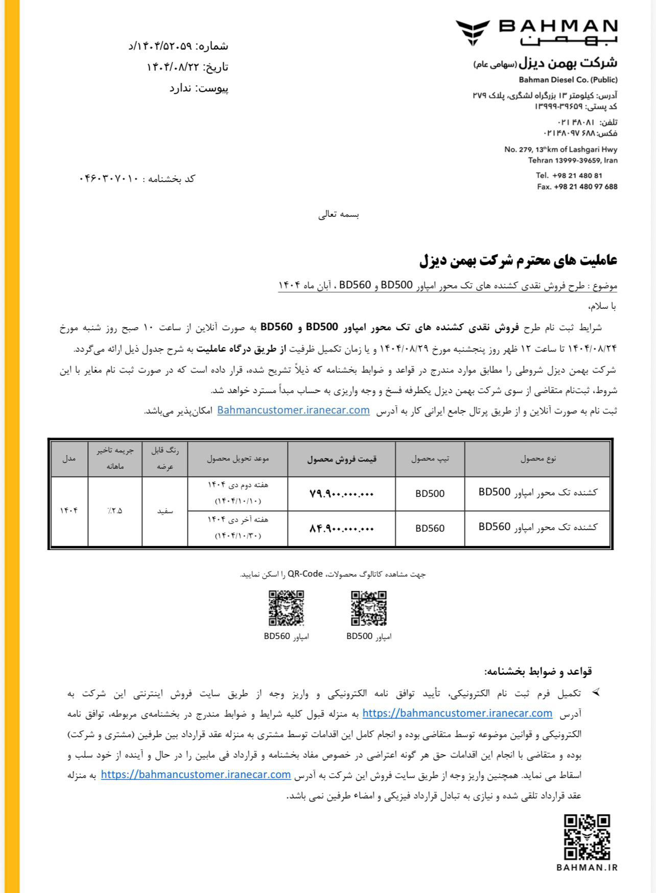 این مرحله از فروش کامیون و کشنده امپاور، ثبت نام از متقاضیان بصورت اینترنتی بوده و از طریق درگاه عاملیتهای مجاز بهمن دیزل، امکانپذیر است. جزییات بیشتر را از لینک زیر دریافت کنید: