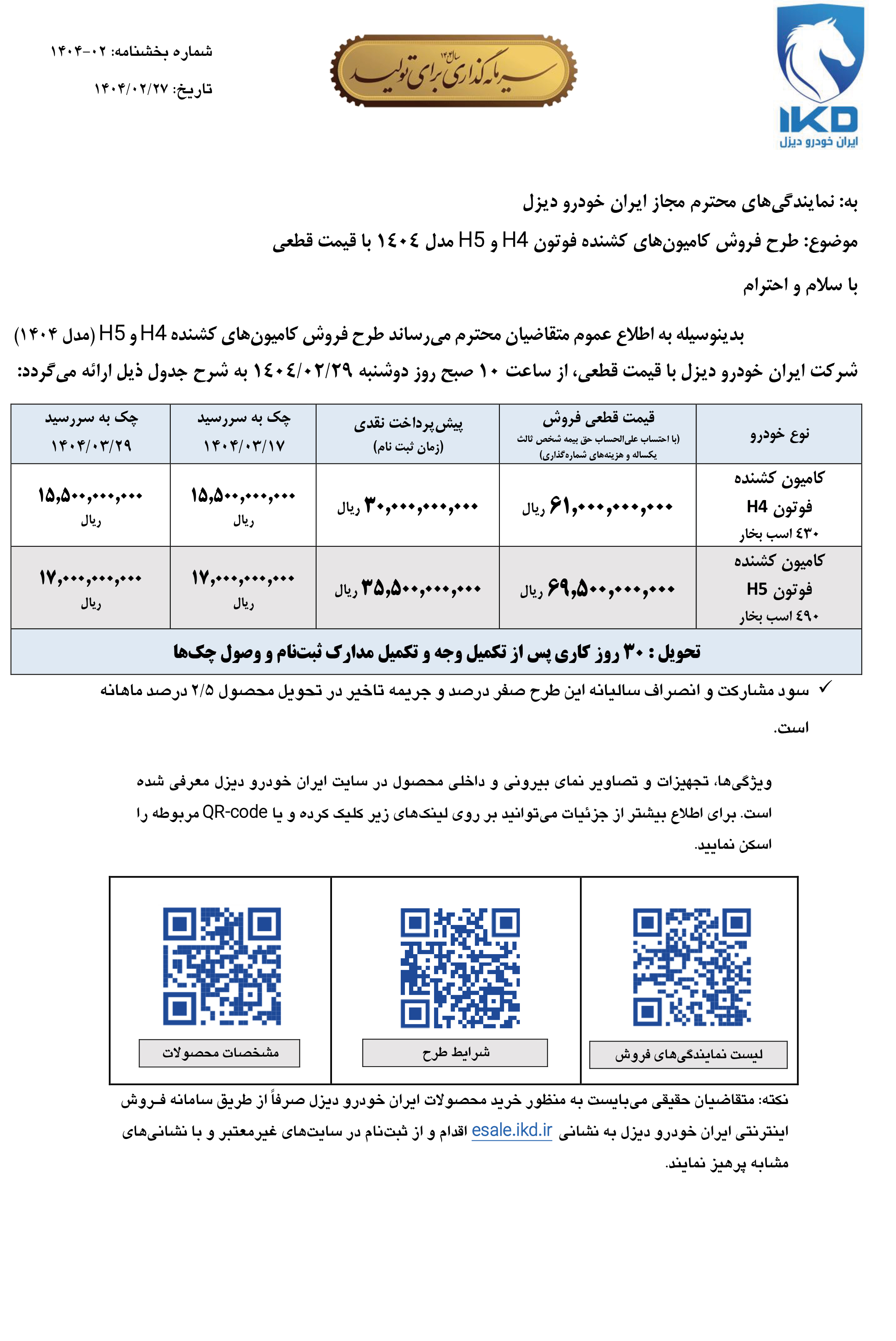 براساس بخشنامه فروش کشنده فوتون، قیمت خودروها قطعی بوده و موعد تحویل انها نیز 30 روز کاری (پس از تکمیل مدارک) است. جزییات بیشتر را از لینک زیر دریافت کنید: