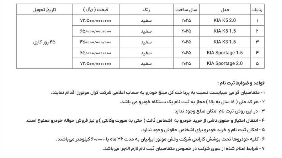 کرال موتورز شرایط فروش 5 مدل کیا 2025 را اعلام کرد. تحویل خودروها 45 روزه است.