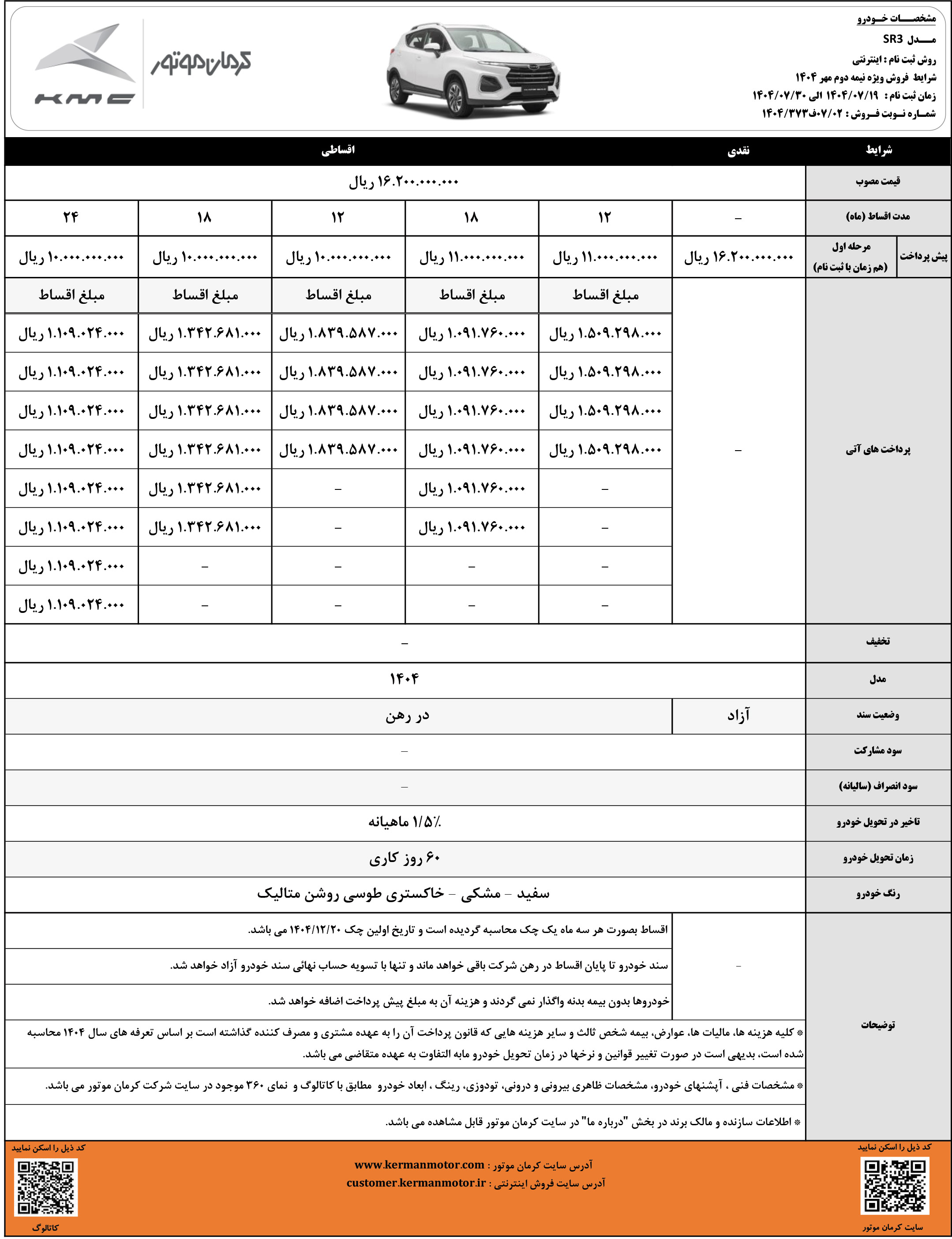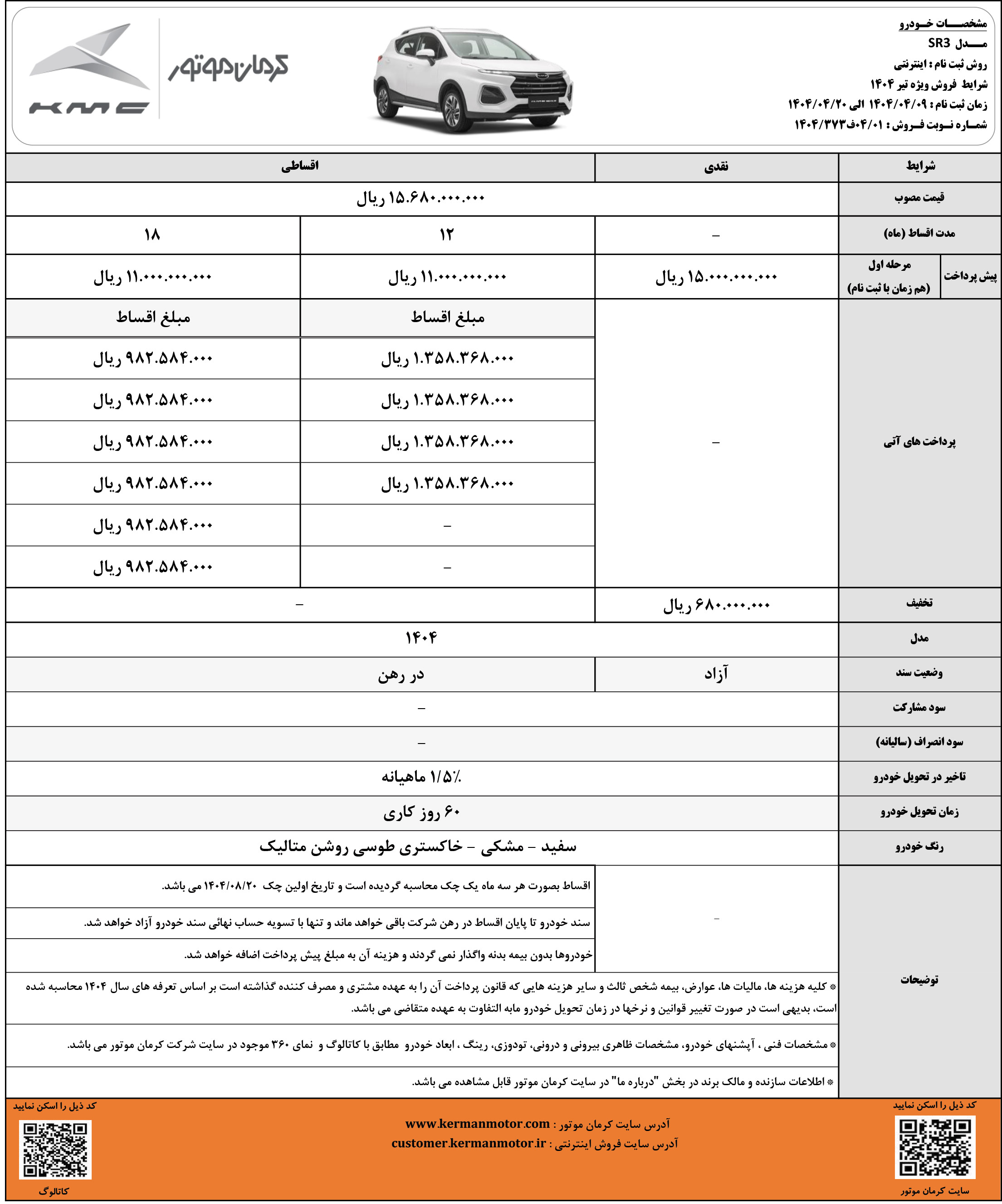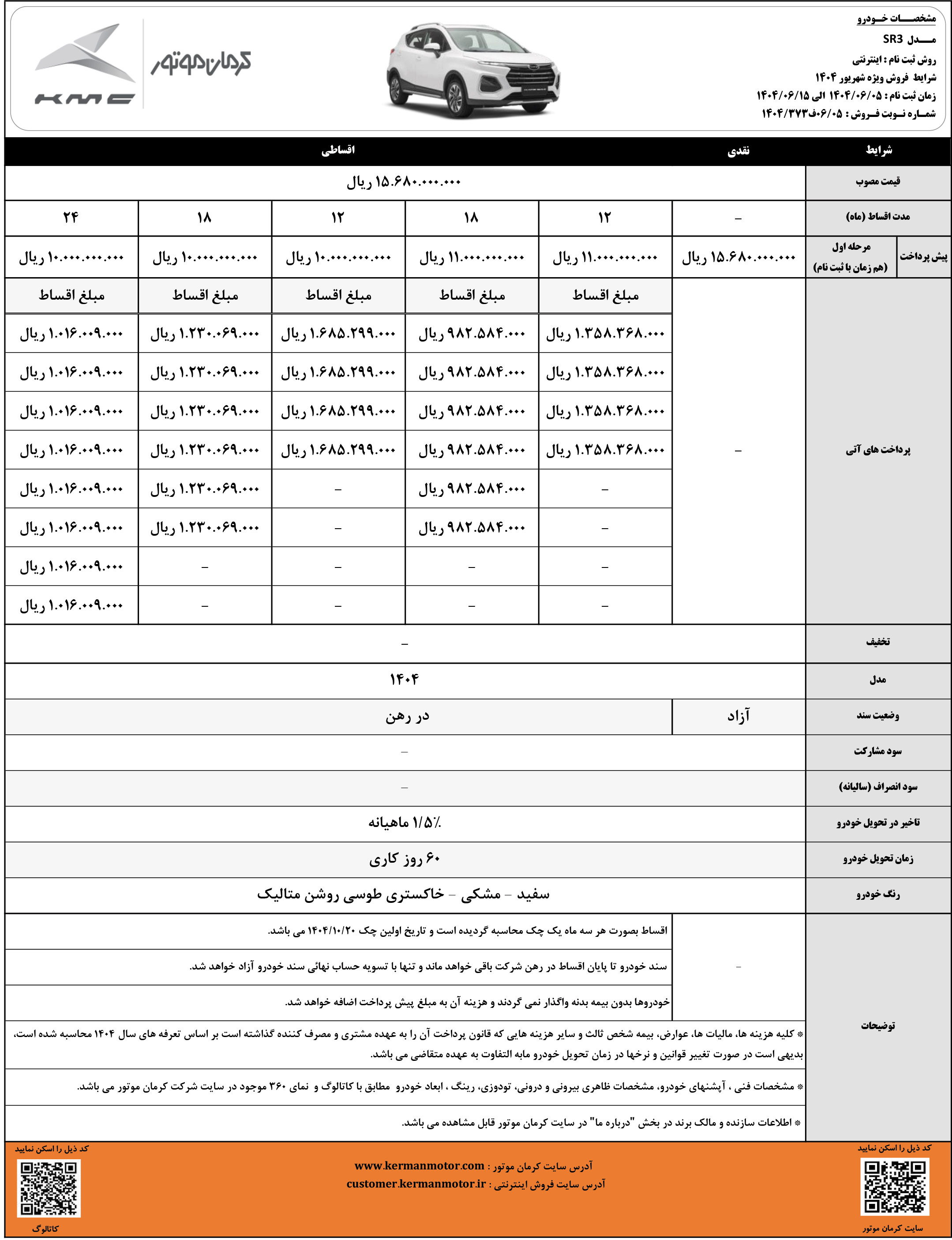 شرایط فروش نقدی و اقساطی کیامسی برای متقاضیان ثبت نام خودرو SR3 کرمان موتور، از روز شنبه مورخ 19 مهرماه 1404 مطابق جدول زیر آغاز شده و تا زمان تکمیل ظرفیت فروش نیز ادامه خواهد داشت: