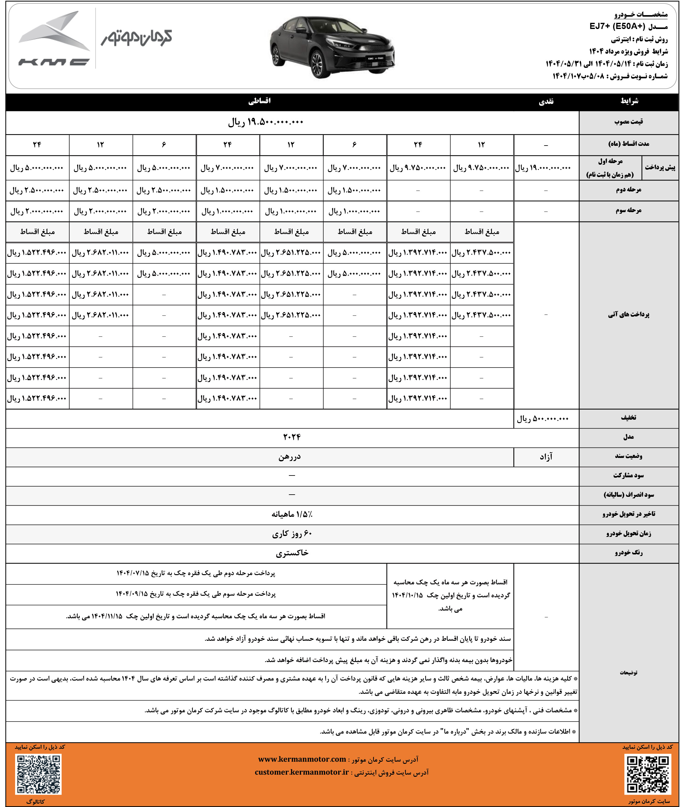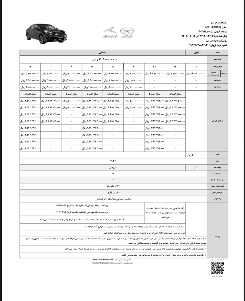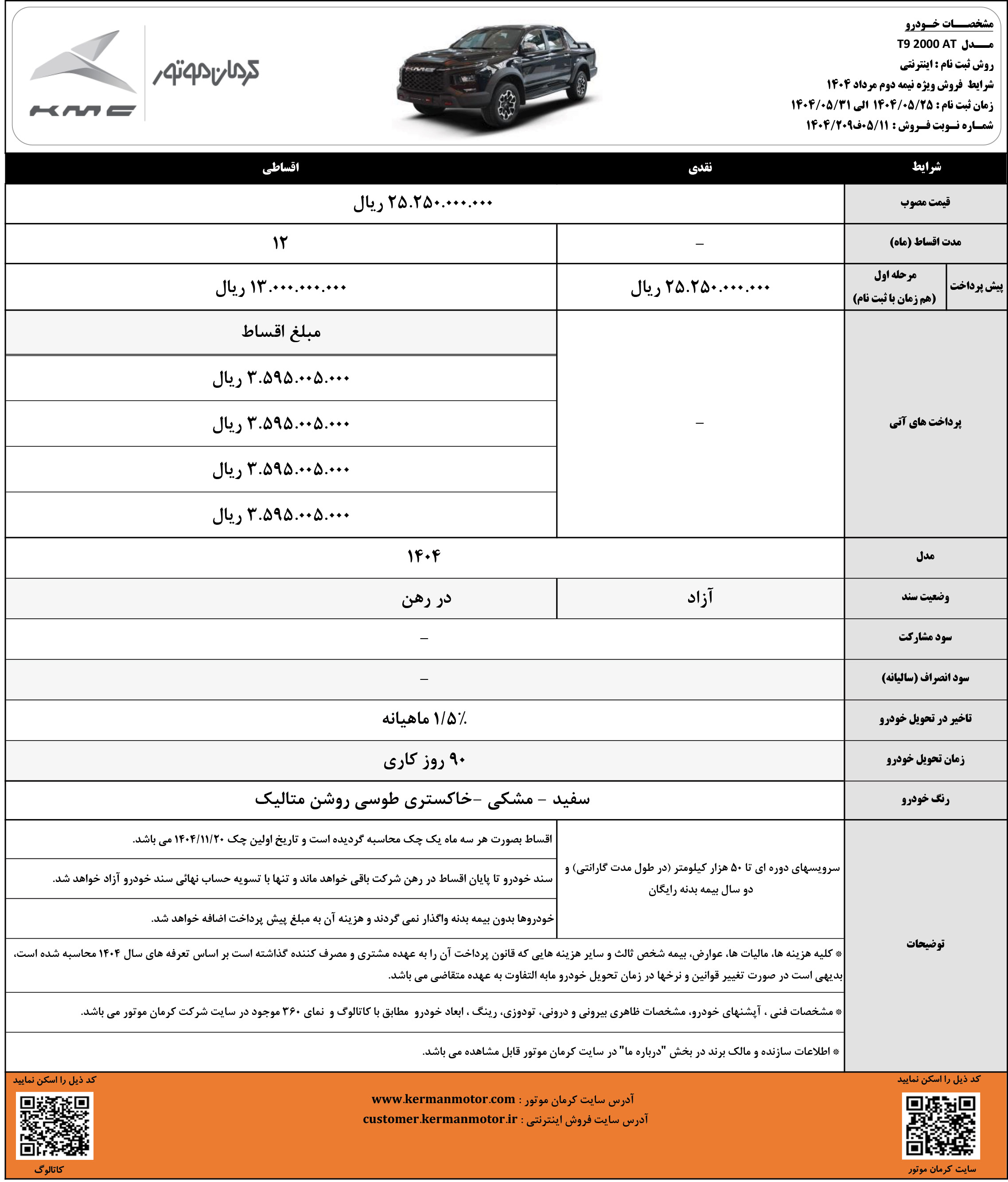 شرایط فروش نقدی و اقساطی کیامسی برای متقاضیان ثبت نام خودرو SR3 کرمان موتور، از روز شنبه مورخ 19 مهرماه 1404 مطابق جدول زیر آغاز شده و تا زمان تکمیل ظرفیت فروش نیز ادامه خواهد داشت: