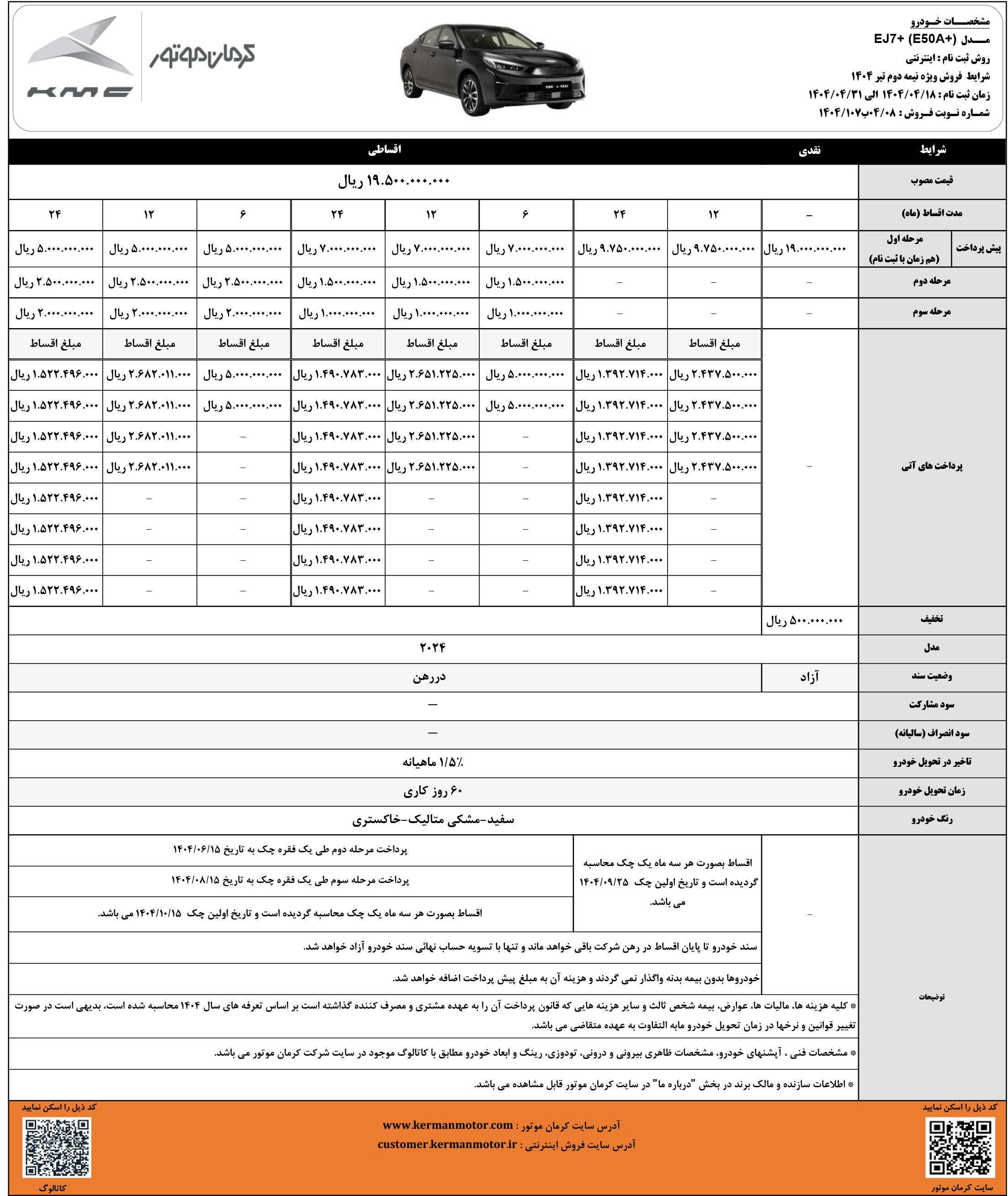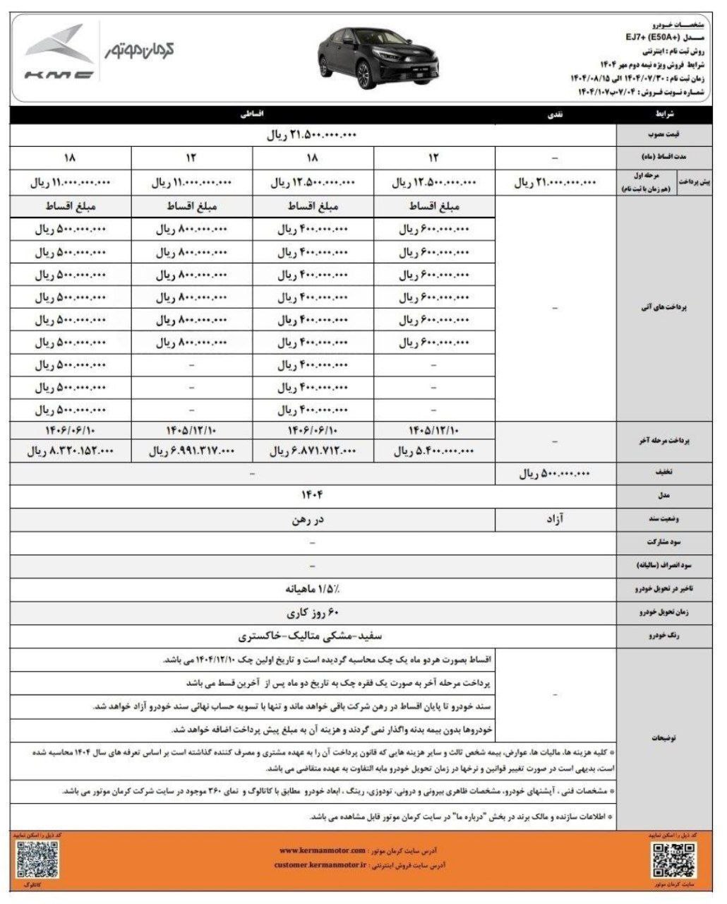 فروش نقدی و اقساطی کی ام سی eJ7 برقی، از روز شنبه مورخ 1404/01/23 آغاز شده و تا زمان تکمیل ظرفیت فروش نیز ادامه خواهد داشت. در این مرحله از ثبت نام کی ام سی، متقاضیان باید J7 برقی را با قیمت جدید، خریداری نمایند: