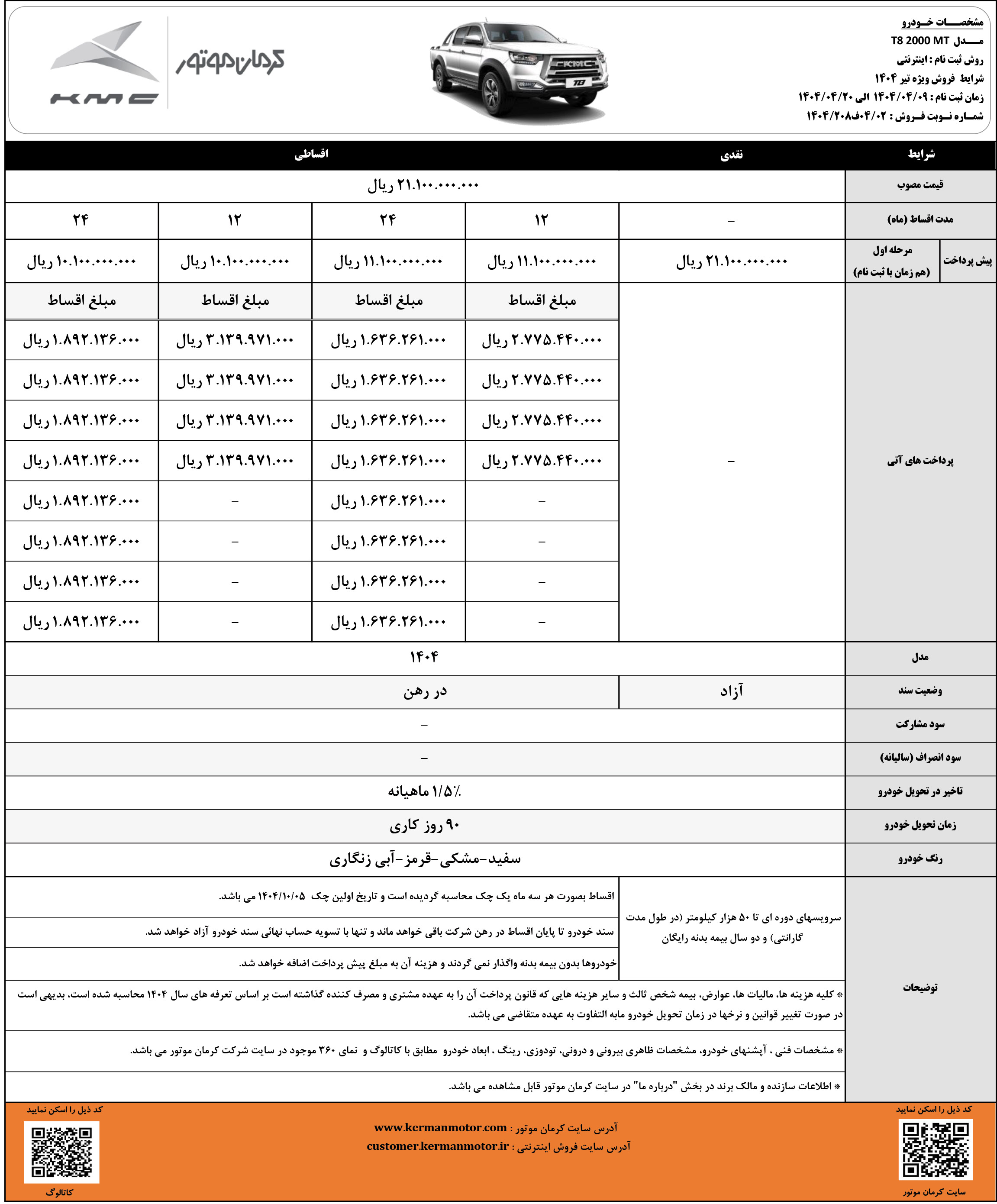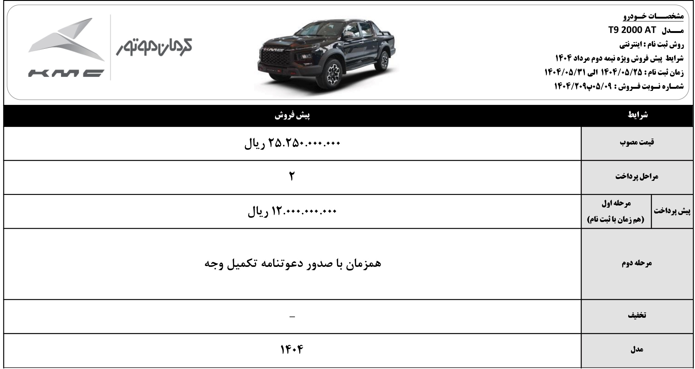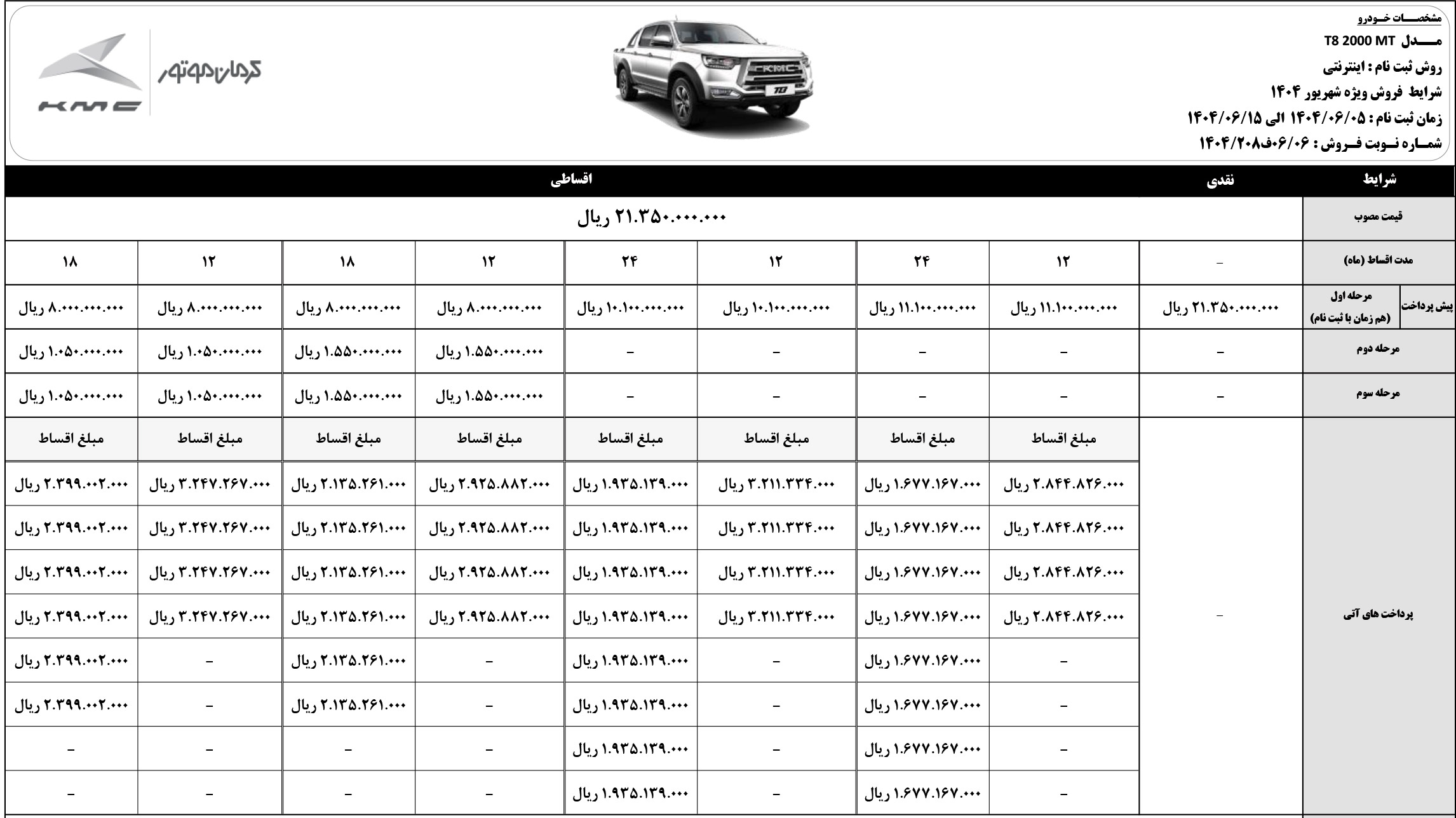 در این مرحله از ثبت نام کیامسی، به غیر از پیکاپ T8 که با مدل 1404 و قیمت جدید و در قالب طرح نقدی و اقساطی فروخته میشود، سایر محصولات KMC صرفا با مدل 1405 و به روش پیش فروش، قابل خریداری هستند. جزییات بیشتر را از لینک زیر دریافت کنید:
