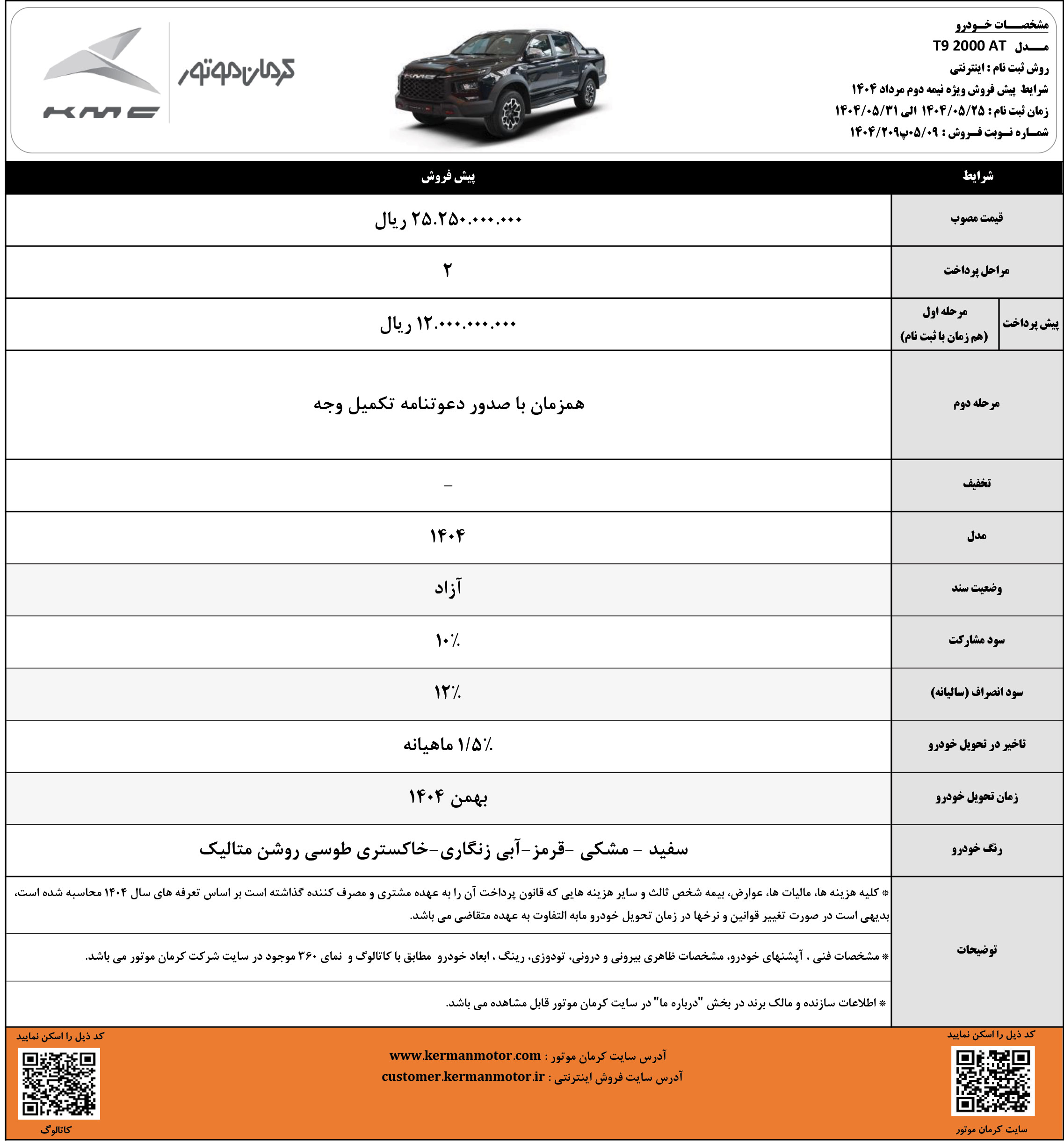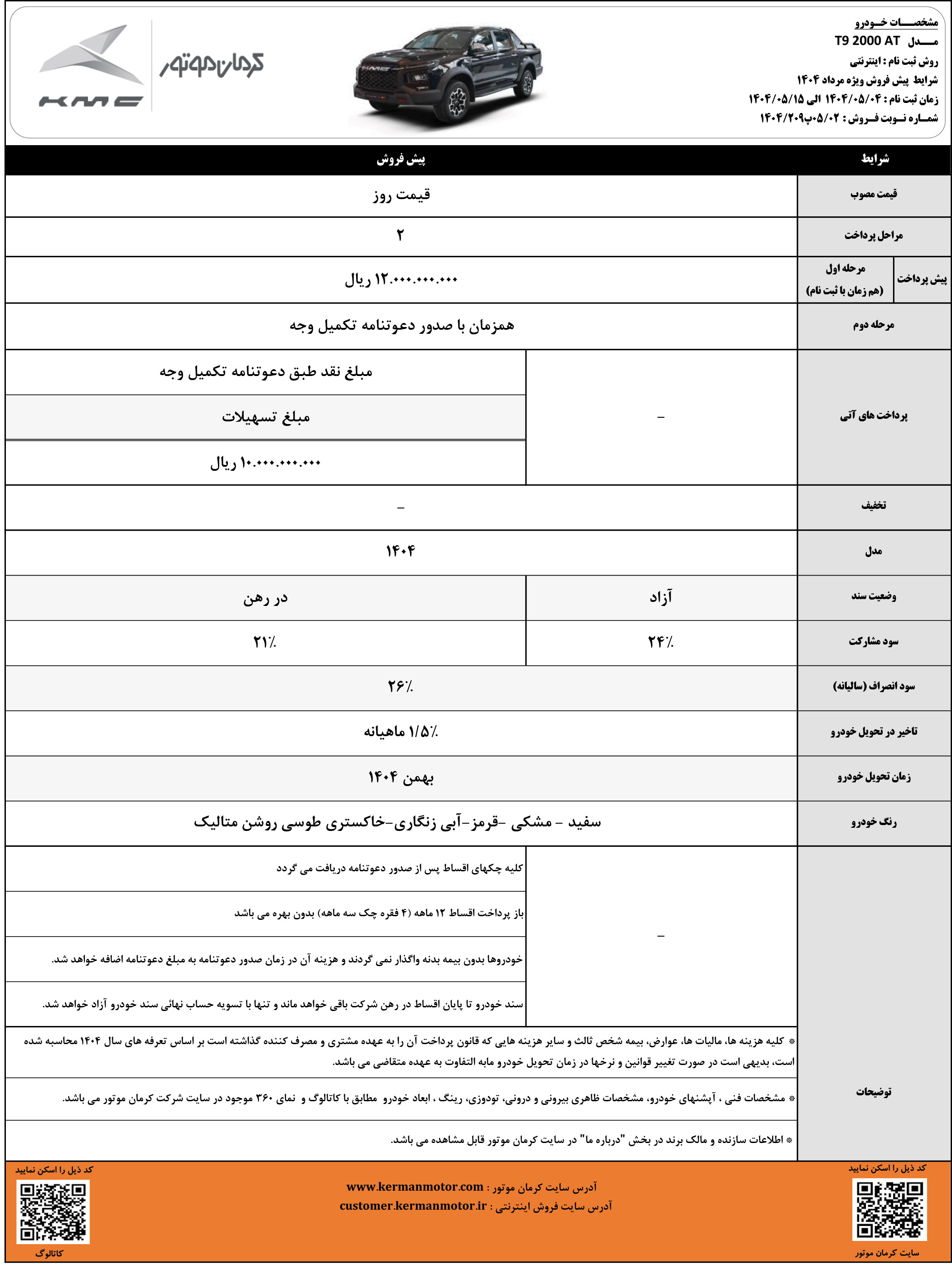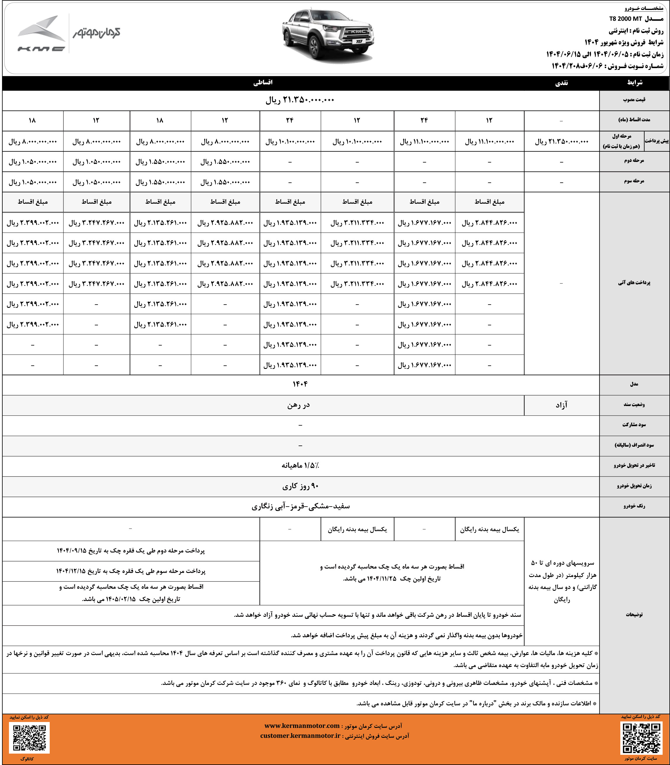 در این مرحله از ثبت نام کیامسی، به غیر از پیکاپ T8 که با مدل 1404 و قیمت جدید و در قالب طرح نقدی و اقساطی فروخته میشود، سایر محصولات KMC صرفا با مدل 1405 و به روش پیش فروش، قابل خریداری هستند. جزییات بیشتر را از لینک زیر دریافت کنید: