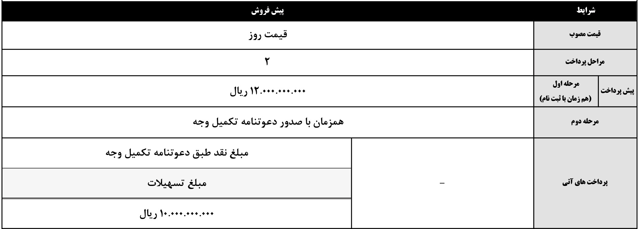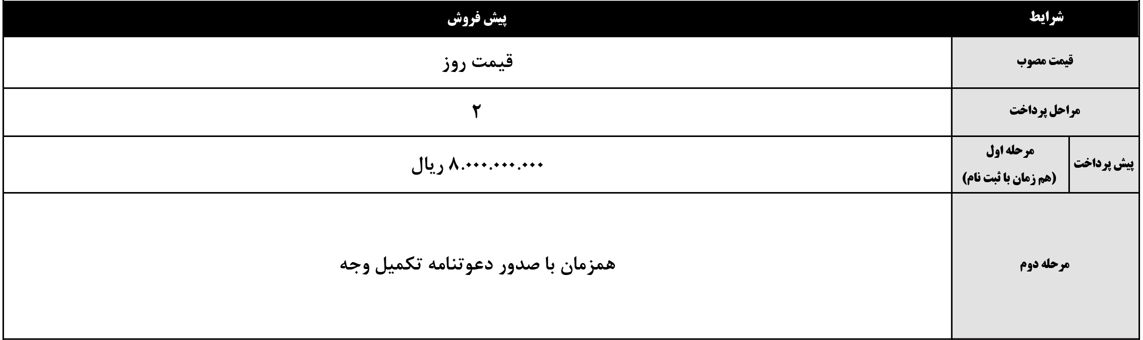 | پیش پرداخت | 600,000,000 | 800,000,000 | 1,000,000,000 | 1,000,000,000 | 1,400,000,000 |